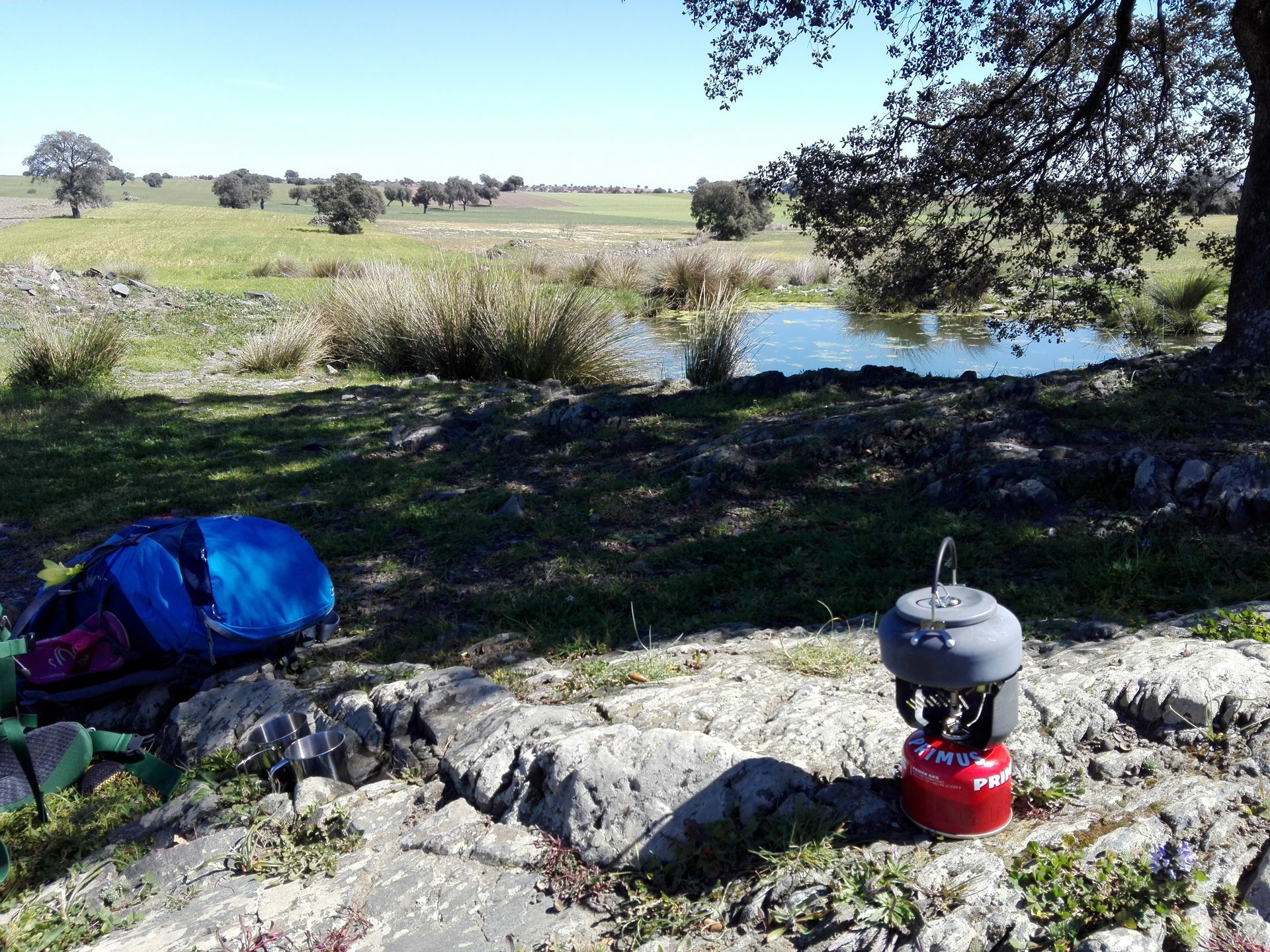 Während dieser beiden Tage zeigt die Landschaft sich von ihrer schönsten Seite, leicht hügelig aber nicht anstrengend, leider jedoch am zweiten Tag nicht mehr so warm und ziemlich windig. Für die Hinfahrt zum Puerto Calatraveño teilen wir uns den Taxi-Service diesmal mit Maryvonne und Roger, den beiden Pilgern, die uns kurz nach Córdoba überholt hatten. Die beiden sind Mitte Siebzig und hängen uns Tag für Tag um Stunden ab, was wohl daran liegt, dass wir uns stets zu einer ausgedehnten Mittagspause im Gras niederlassen und unsere Tasse frisch gebrühten Kaffee genießen, die zwei aber, mangels Sitzgelegenheit, nur kurz im Stehen essen und dann weitermarschieren.