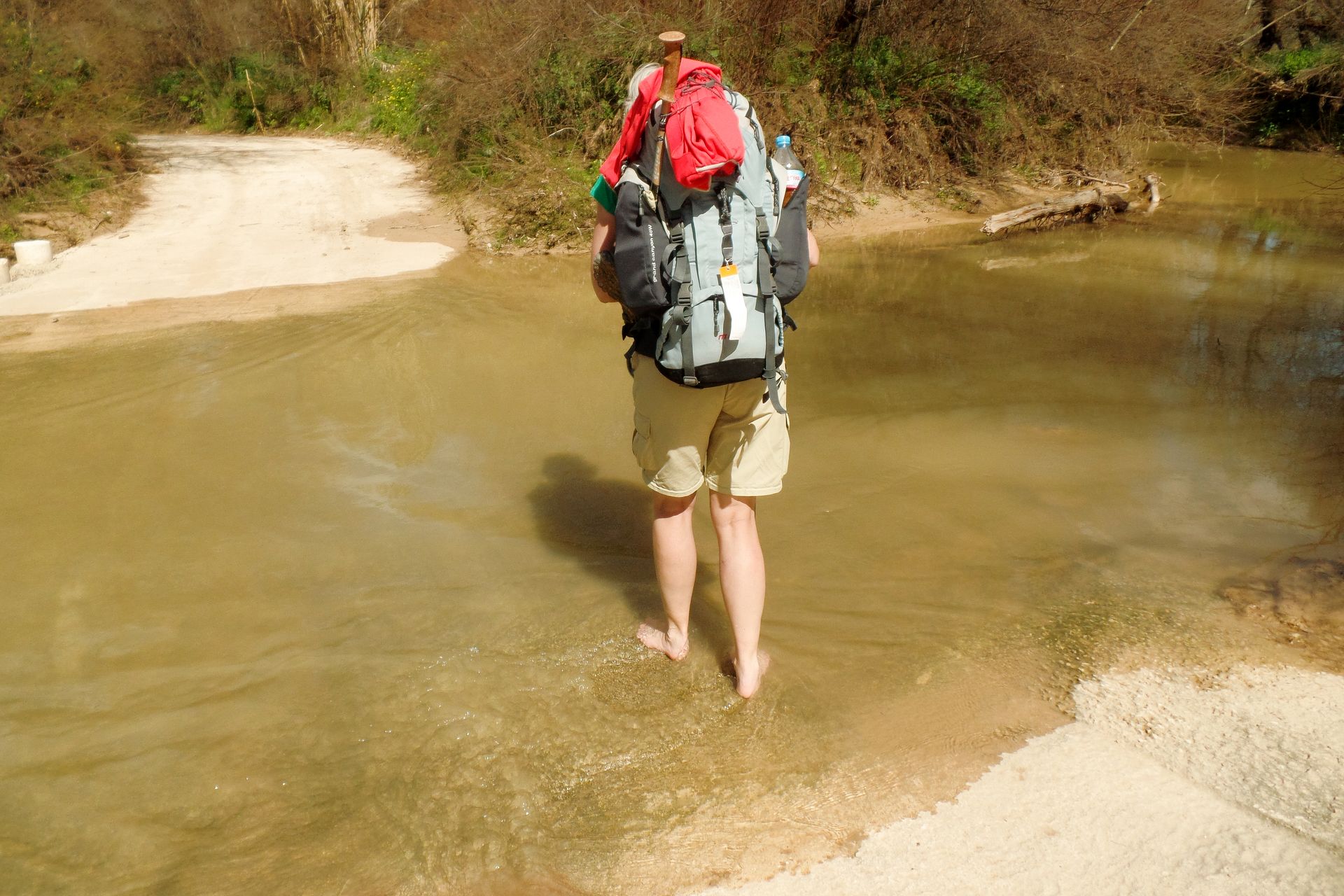 Für den fünften Tag haben wir uns 32 km vorgenommen. Zunächst kommen wir gut voran, doch in den Olivenhainen verlieren wir schnell jegliches Gefühl für die zurückgelegte und noch vor uns liegende Entfernung. Am Nachmittag müssen wir erstmals einen kleinen Fluss furten, was wir dank der inzwischen angestiegenen Temperatur sichtlich genießen. Wir lassen uns zu einer ausgedehnten Rast am Fluss nieder und vergessen Raum und vor allem Zeit. Als wir wieder aufbrechen, ist es bereits später Nachmittag und der Wind frischt wieder auf. Wir schaffen es bis etwa 10 km vor Lucena, bevor es gegen 18:00 Uhr erneut zu regnen beginnt. Die Erfahrung hat mich gelehrt, dass die Engel des Camino stets in Erscheinung treten, wenn man sie wirklich braucht! Noch bevor wir gänzlich nass werden, treffen wir auf einen Bauern, der umgehend sein Tagewerk beendet und uns in die Stadt fährt. Doch der Abbruch nach dem anfänglichen Hochmut hat uns Demut gelehrt. Ab sofort teilen wir uns die Etappen besser ein.