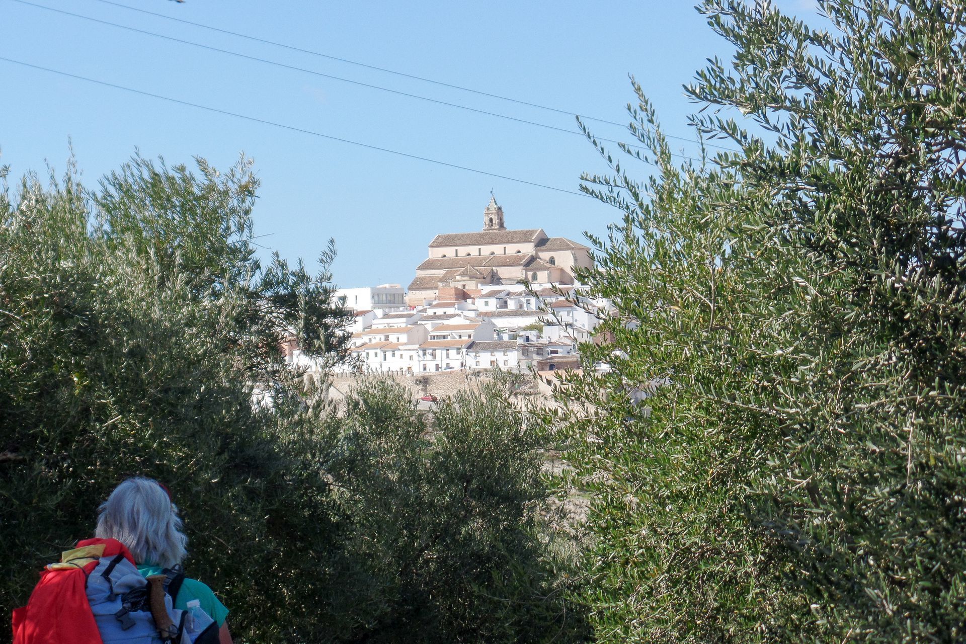 So angenehm das Gehen ohne Steigung und Gefälle auch ist, wird es doch mit der Zeit etwas langweilig der alten Bahnlinie zu folgen. Wir sind dann auch froh, als wir am zweiten Tag bei Doña Mencía den Radweg verlassen und wieder über Berg und Tal und durch Olivenhaine weiterziehen. Am Nachmittag erhebt sich vor uns in der Ferne ein kegelförmiger Hügel mit einer Burg und einer Kirche obenauf, die von einer im Sonnenlicht leuchtenden weißen Stadt umgeben sind. Wir haben Baena fast erreicht. In der Stadt angekommen, fragen wir uns zur Herberge Ruta del Califato durch, die wie befürchtet ganz oben auf dem Burgberg liegt, aber eine der schönsten Herbergen ist, in denen ich bisher übernachtet habe.