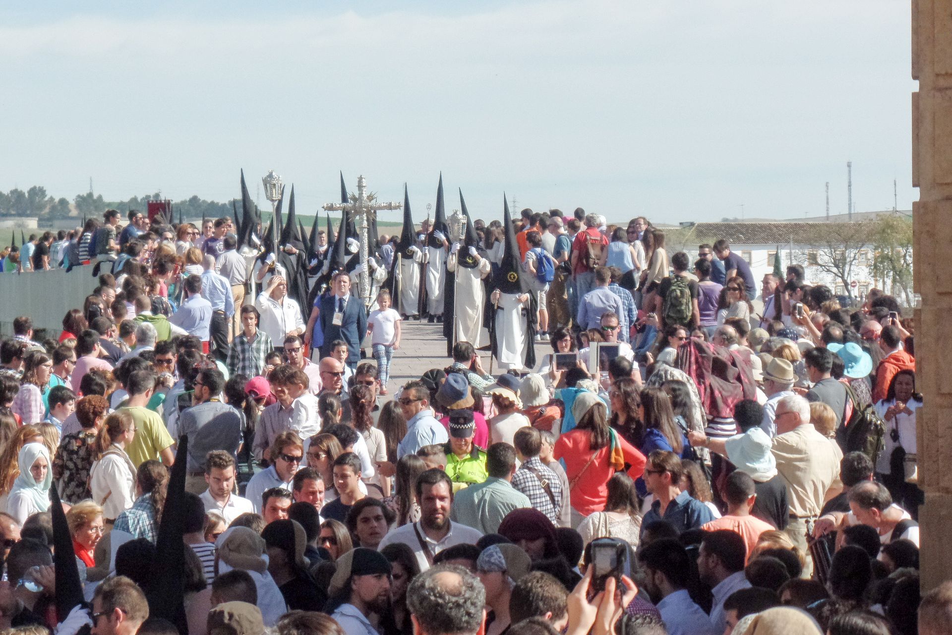 Wir unterbrechen das Pilgern und fahren per Bus nach Córdoba, um an den Feierlichkeiten des Palmsonntags teilzunehmen. Der Tag beginnt für uns mit dem Einzug des Bischofs von Córdoba in die Mezquita, die Kathedrale, und der anschließenden Messe. Während des ganzen Tages laufen wir durch die Altstadt, immer darauf wartend, die dumpfen Trommelschläge zu hören, die die nächste Prozession ankündigen. Die Stadt quillt über von Menschen, in manchen Gassen ist kaum ein Durchkommen. Mehrmals müssen wir uns ganz an eine Häuserwand drücken, um die Pasos vorbeizulassen, während die Bewohner Córdobas Rosenblüten von den Dächern auf die Heiligenfiguren werfen. Erst spät in der Nacht ziehen die Costaleros und Nazareños in die Mezquita ein.