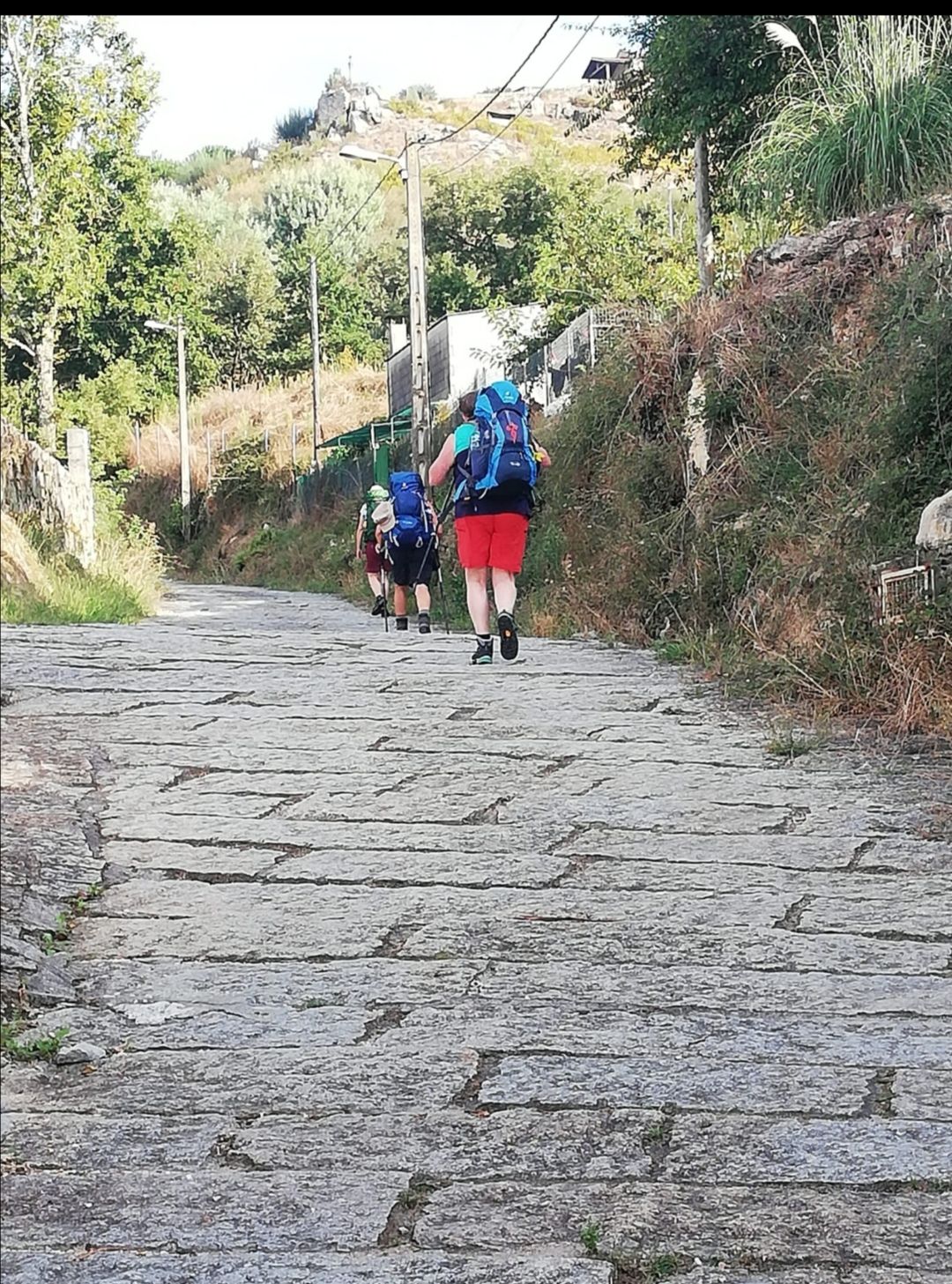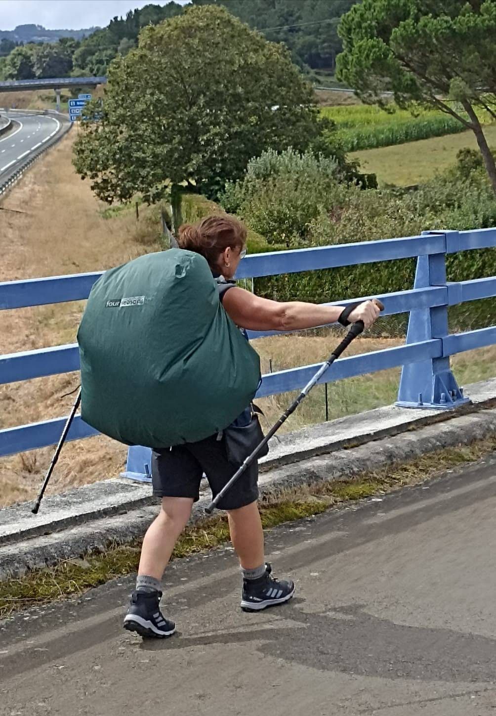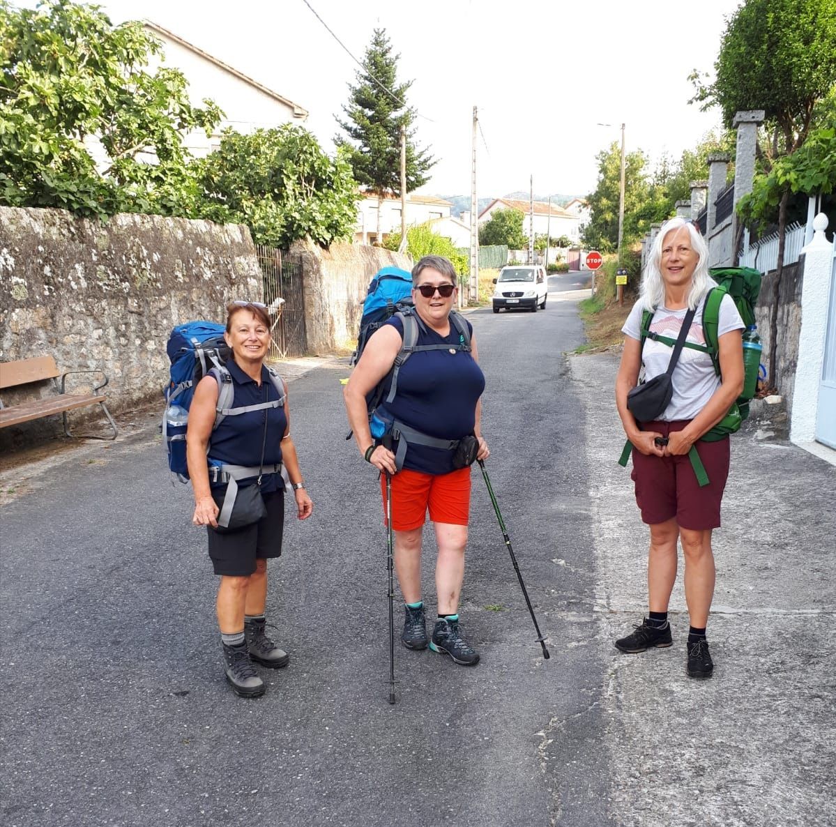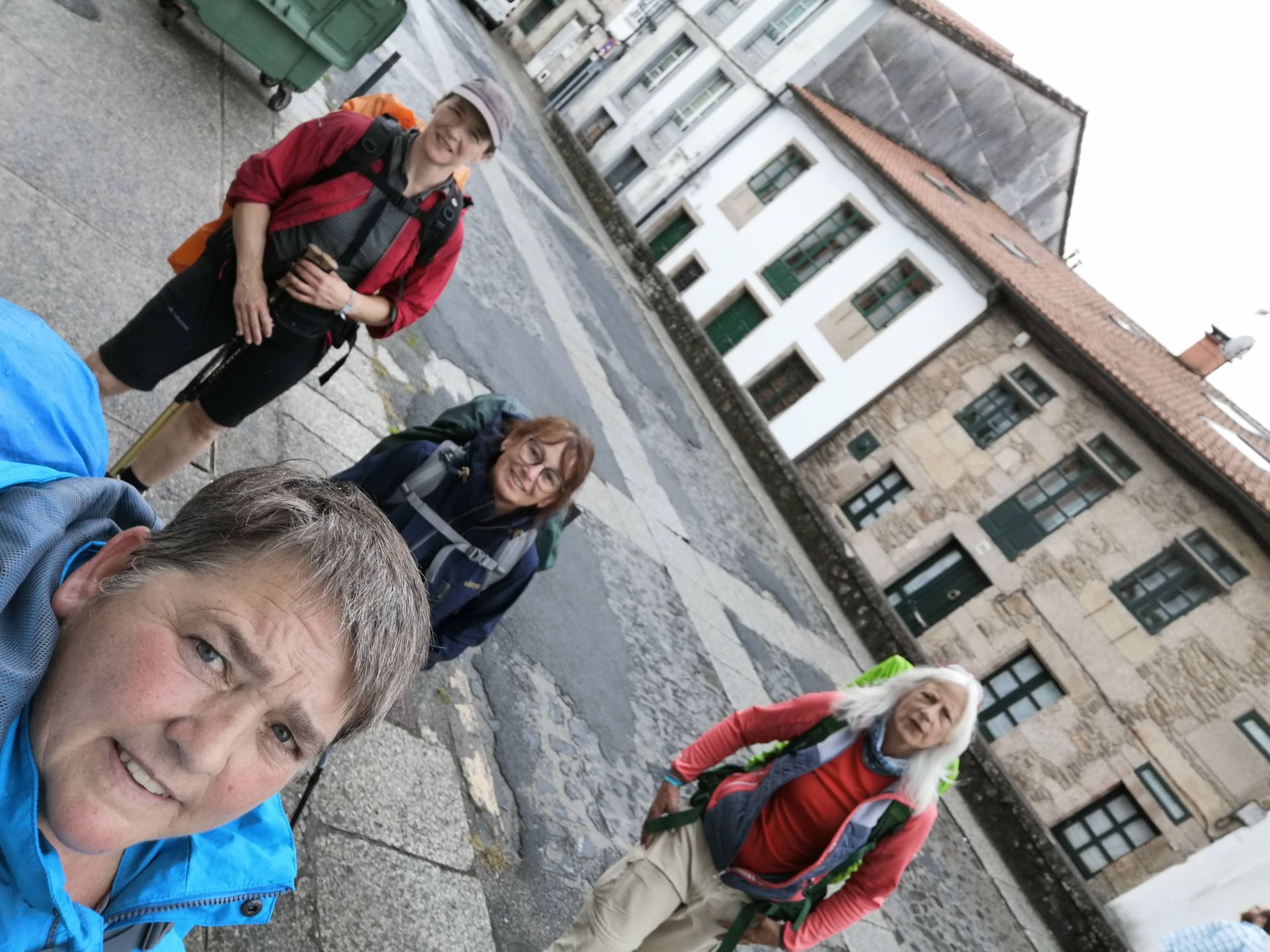 Es ist stark bewölkt, aber trocken als wir das Hotel Victorino um 8:30 Uhr verlassen. Wir haben uns hier wohlgefühlt, auch wenn das Hotel nur Etagenbäder hat, die wir uns mit den schon bekannten Pilgerdamen teilten. Diese haben wir beim Frühstück nun etwas näher kennengelernt und dabei erfahren, dass sie aus England kommen. Sie waren sehr an Uschis Wanderhose interessiert und haben auch Roswithas neue Schuhe ausreichend bewundert und beides fotografiert.