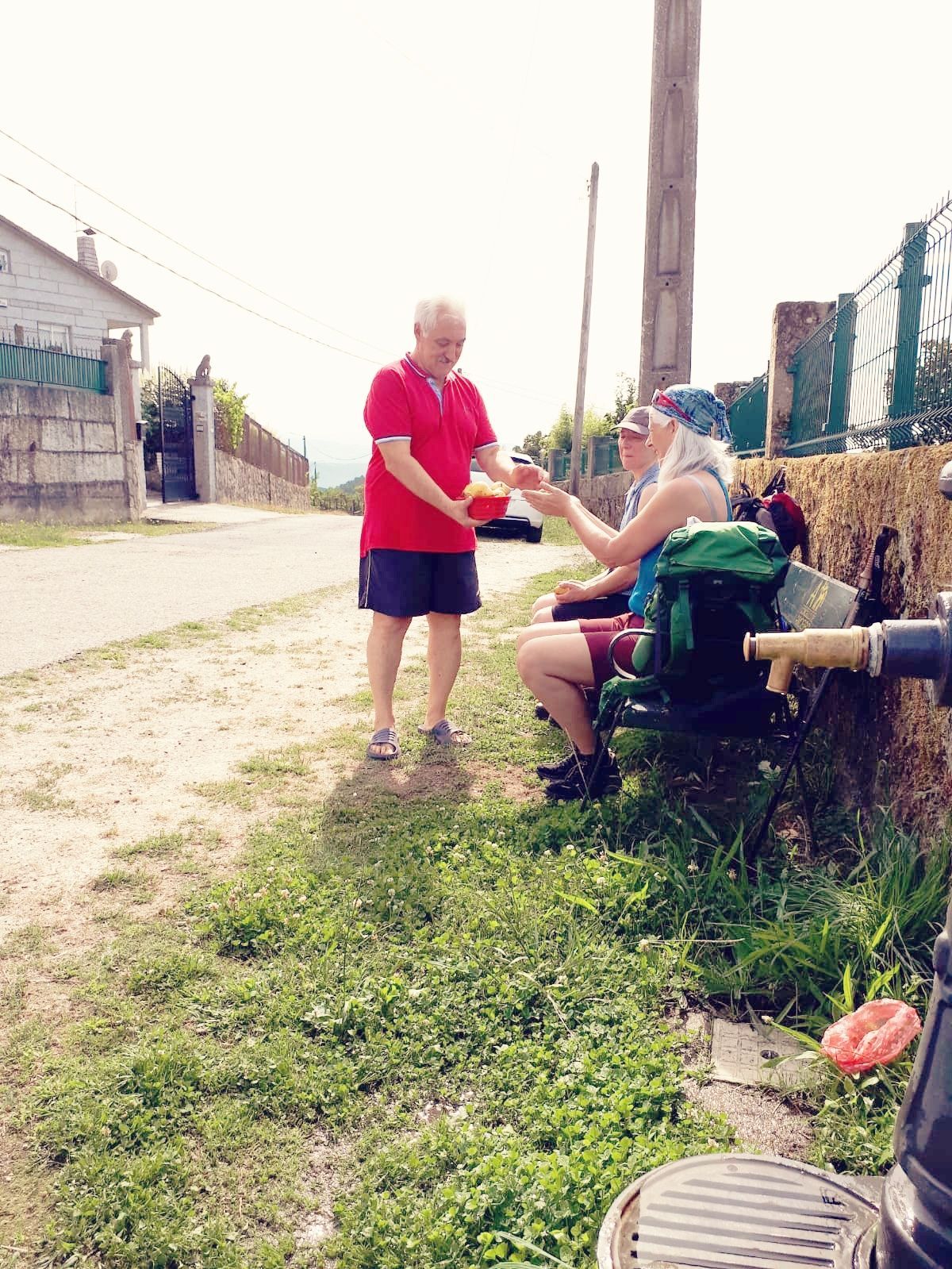 Wenige hundert Meter weiter lassen wir Ourense endgültig hinter uns und wandern ab jetzt durch lichten Eichenwald. Es ist bereits nach Mittag als wir auf einem Hügel erneut eine Siedlung erreichen und an mehreren großen Häusern mit gepflegten Vorgärten vorbeilaufen, wobei wir von einem älteren Mann beäugt werden, der in seinem Garten arbeitet. Auf einer Bank neben einem Brunnen lassen wir uns noch einmal zu einer kurzen Pause nieder. Wir sitzen noch nicht lange, da kommt besagter Mann zu uns herüber und versorgt uns mit köstlichen Birnen aus seinem Garten. Auch auf dem Camino Sanabrés hat man offenbar für Pilger etwas übrig.