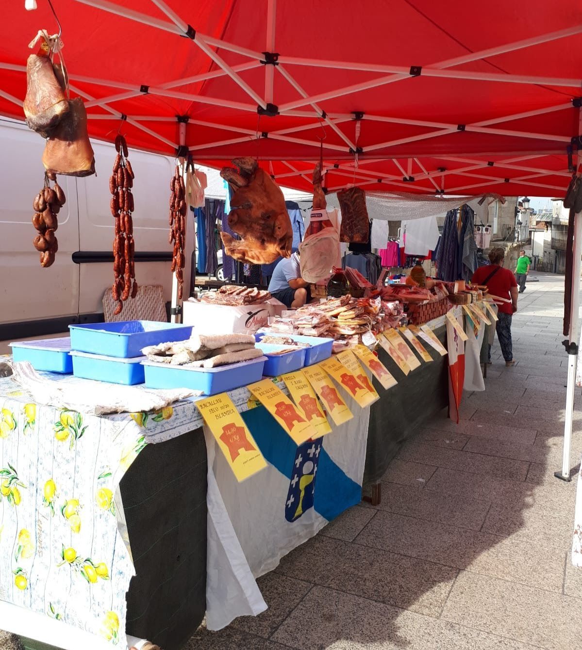 Später fährt unser Hauswirt uns in ein Restaurant nach Cea. Wir lassen uns auf der Terrasse nieder, doch der Wirt scheucht uns nach drinnen. Angeblich wird es bald zu frisch, um noch draußen zu sitzen. Die Menü-Auswahl überlassen wir dem Wirt und vertrauen darauf, dass er weiß, was ausgehun-gerte Pilgerinnen nach einem langen Wandertag brauchen. Es dauert nicht lange und er tischt uns eine Auswahl an Meeresfrüchten wie Langusten, Gambas, Pulpo, Muscheln, sowie Koteletts vom Iberico Schwein, Chorizo und eine riesige Schüssel Salat auf. Dazu reicht er leckeres Weißbrot. Cea ist das Dorf der Bäcker und in der ganzen Region berühmt für sein Brot, habe ich im Vorfeld gelesen.