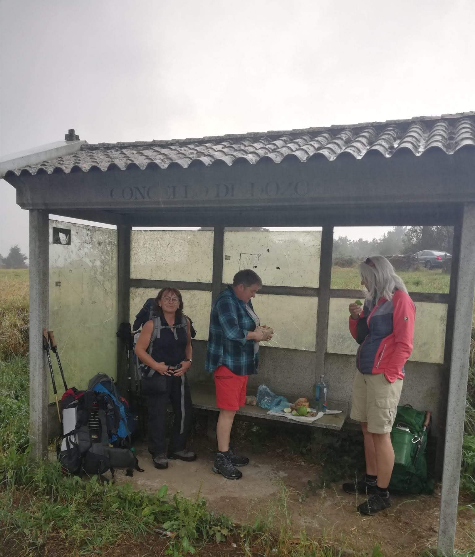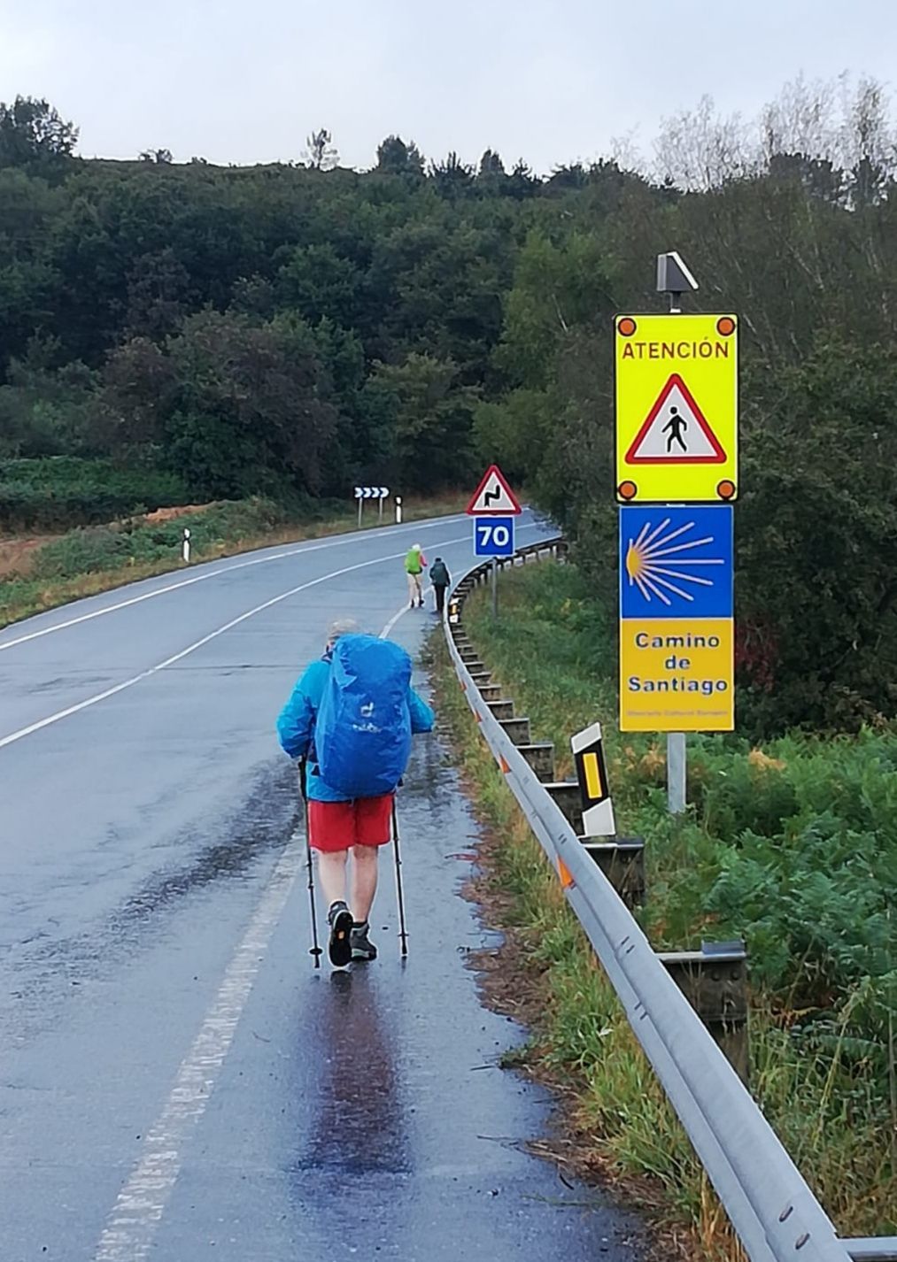 Es tut mir gut, im Moment allein zu laufen. Roswitha und Martina sind etwa 50 m hinter mir. Etwa eine Stunde habe ich für mich, kann meine Gedanken sortieren und komme wieder etwas runter. Als rechts die staatliche Pilgerherberge aus dem Regen auftaucht, biege ich in die Zufahrt dorthin ab und warte unter dem Vordach auf Martina und Roswitha, die gleich darauf fast an mir vorbeigelaufen wären. Der Vorfall vor einer Stunde wird von uns nicht erwähnt, doch die beiden schauen mich schon etwas bedröppelt an, was nicht nur am Regen liegt. Aber zumindest Martina hat mich so schon erlebt und weiß, dass ich mich schnell wieder abrege. Roswitha kam bisher noch nicht in diesen zweifelhaften Genuss.