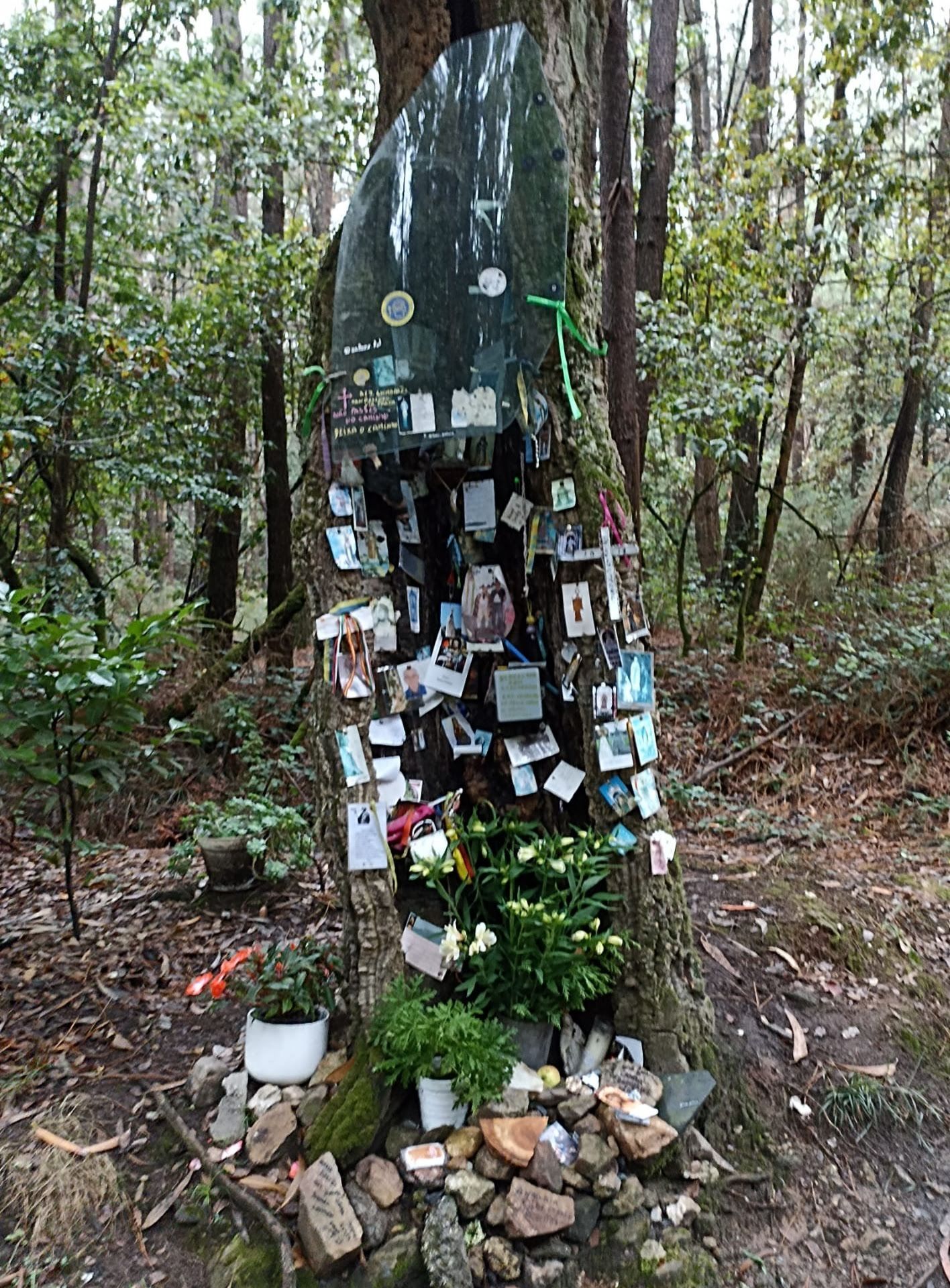 Wir drei bleiben zusammen und treffen bald darauf im Wald auf die Frauengruppe, denen wir nun schon mehrfach begegnet sind. Sie sitzen an einem riesigen Baum, den offenbar vor langer Zeit ein Blitz gespalten hat. Gläubige Menschen haben das Innere des gespaltenen Stammes zum Schrein gemacht und Votivtafeln darin aufgehängt. Im oberirdischen Wurzelwerk des Baumes liegen Blumen und Kerzen. Er erinnert mich an die Gnadenkapelle in Altötting.