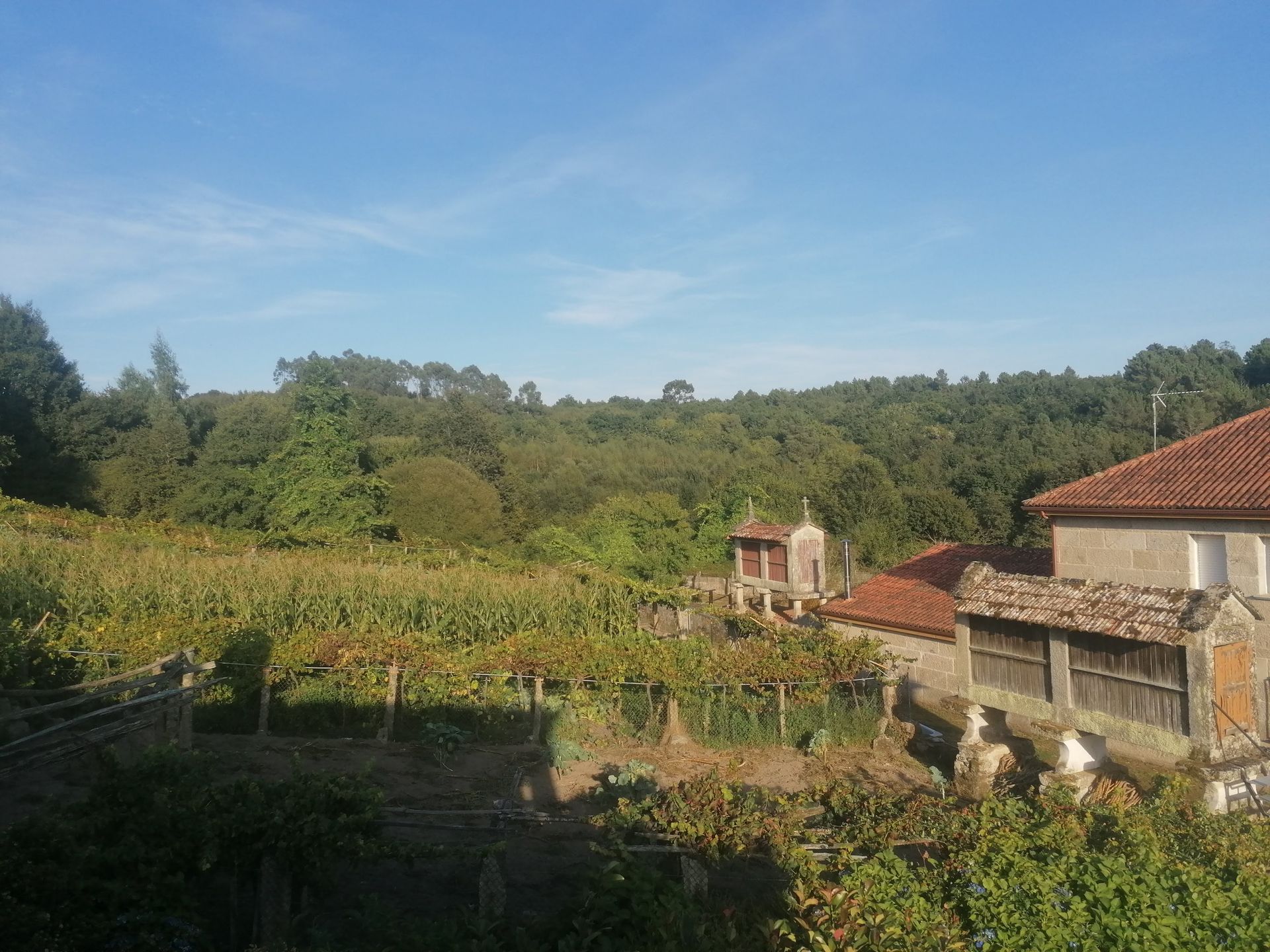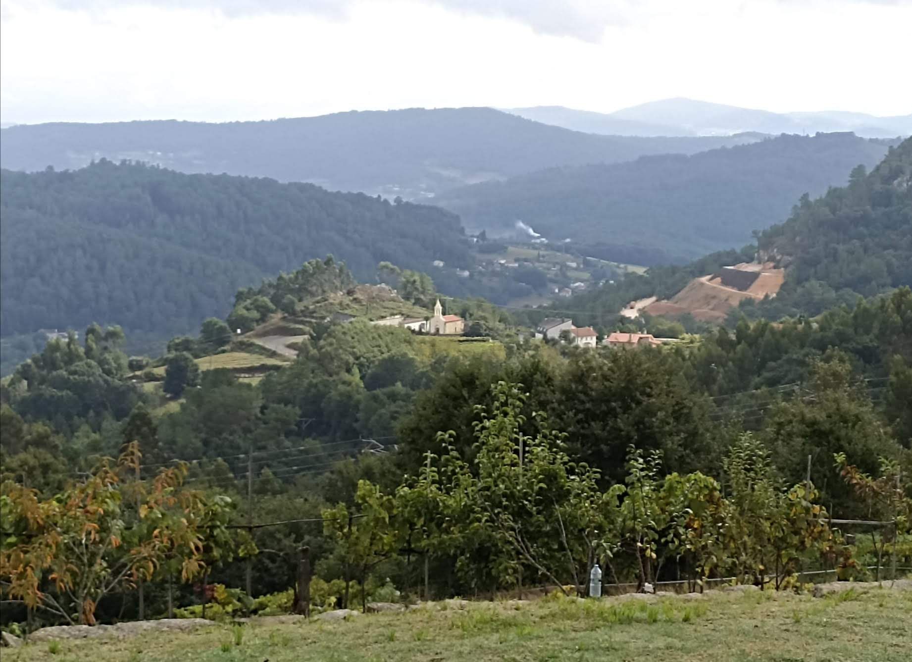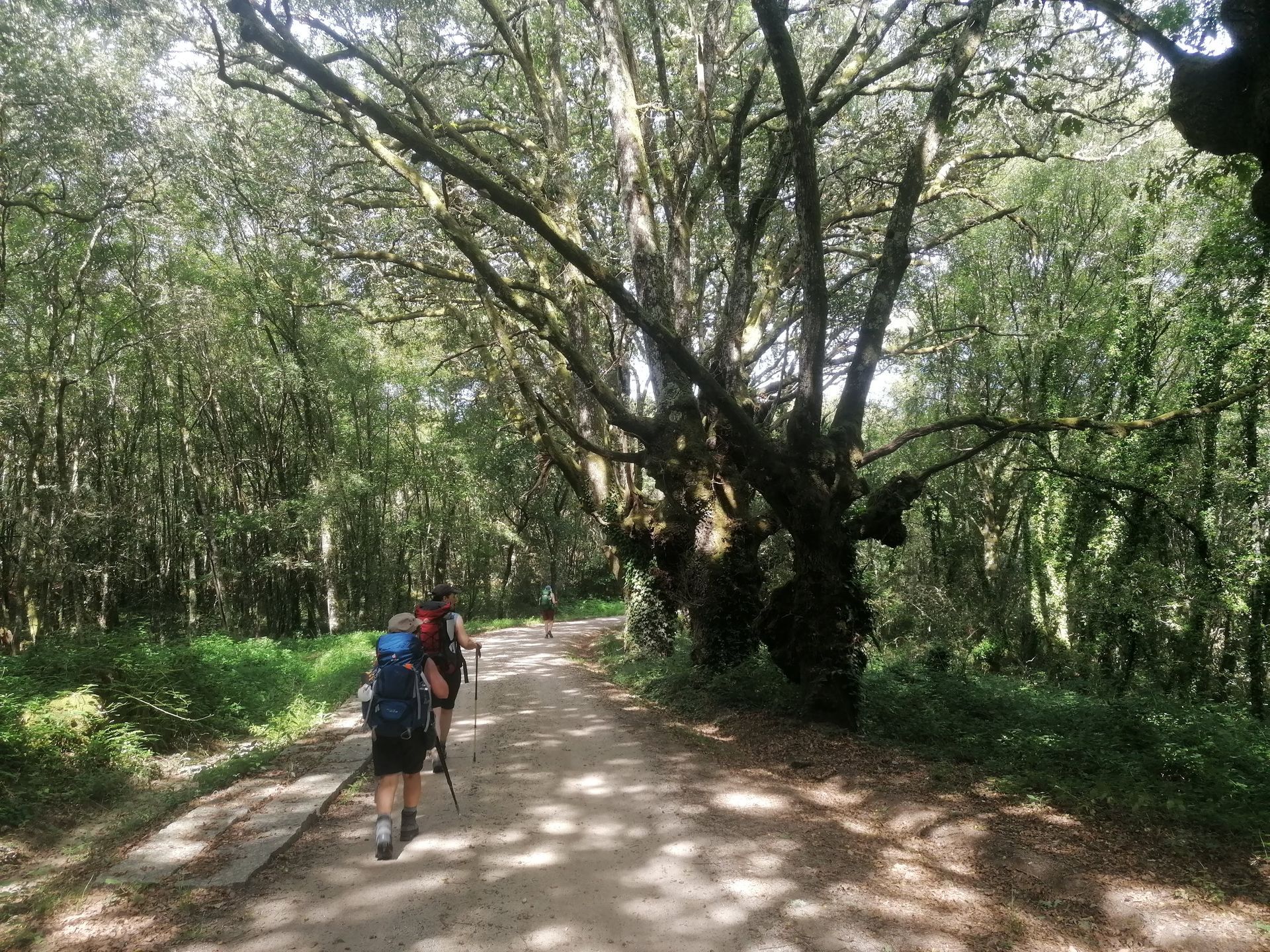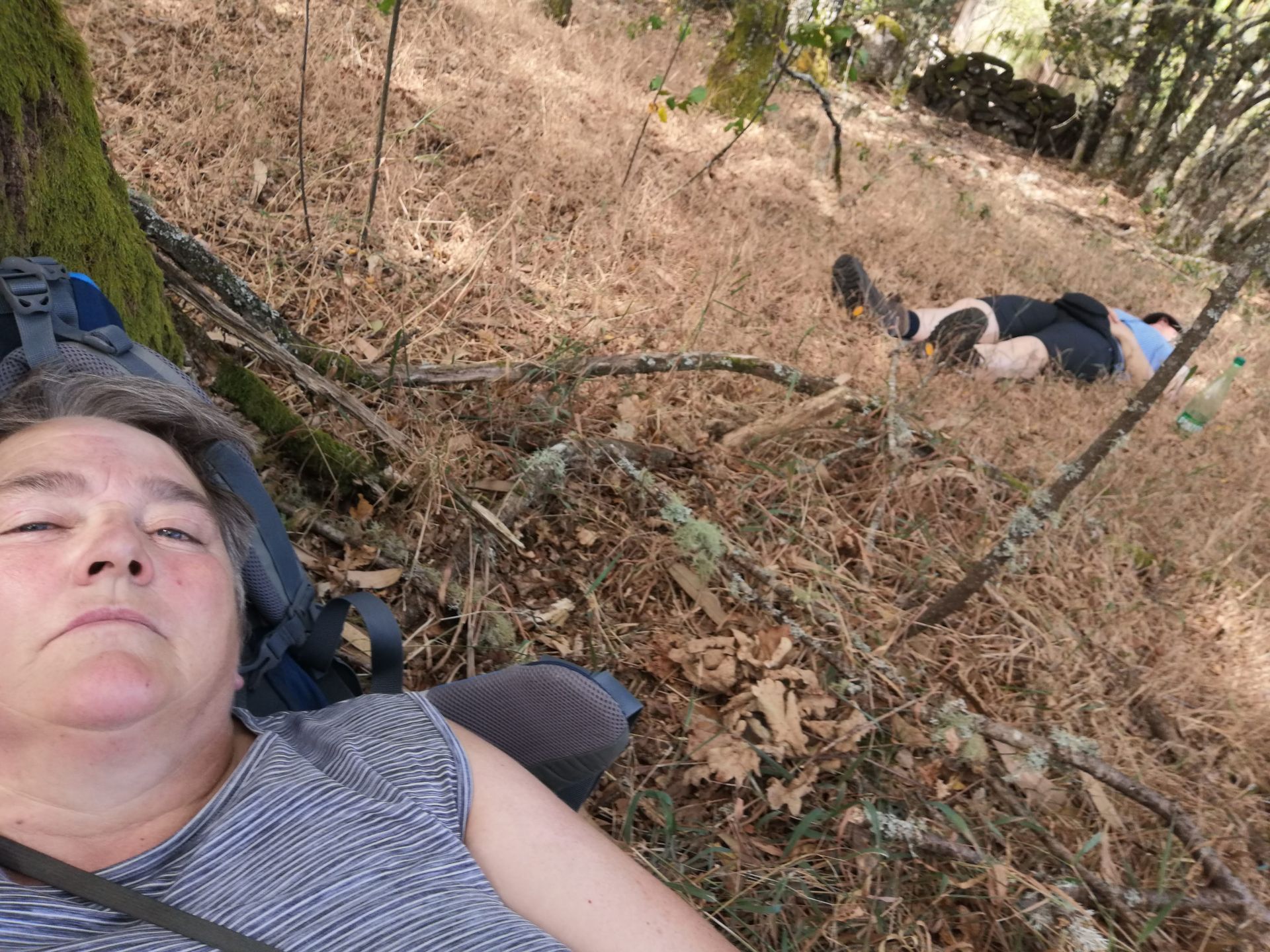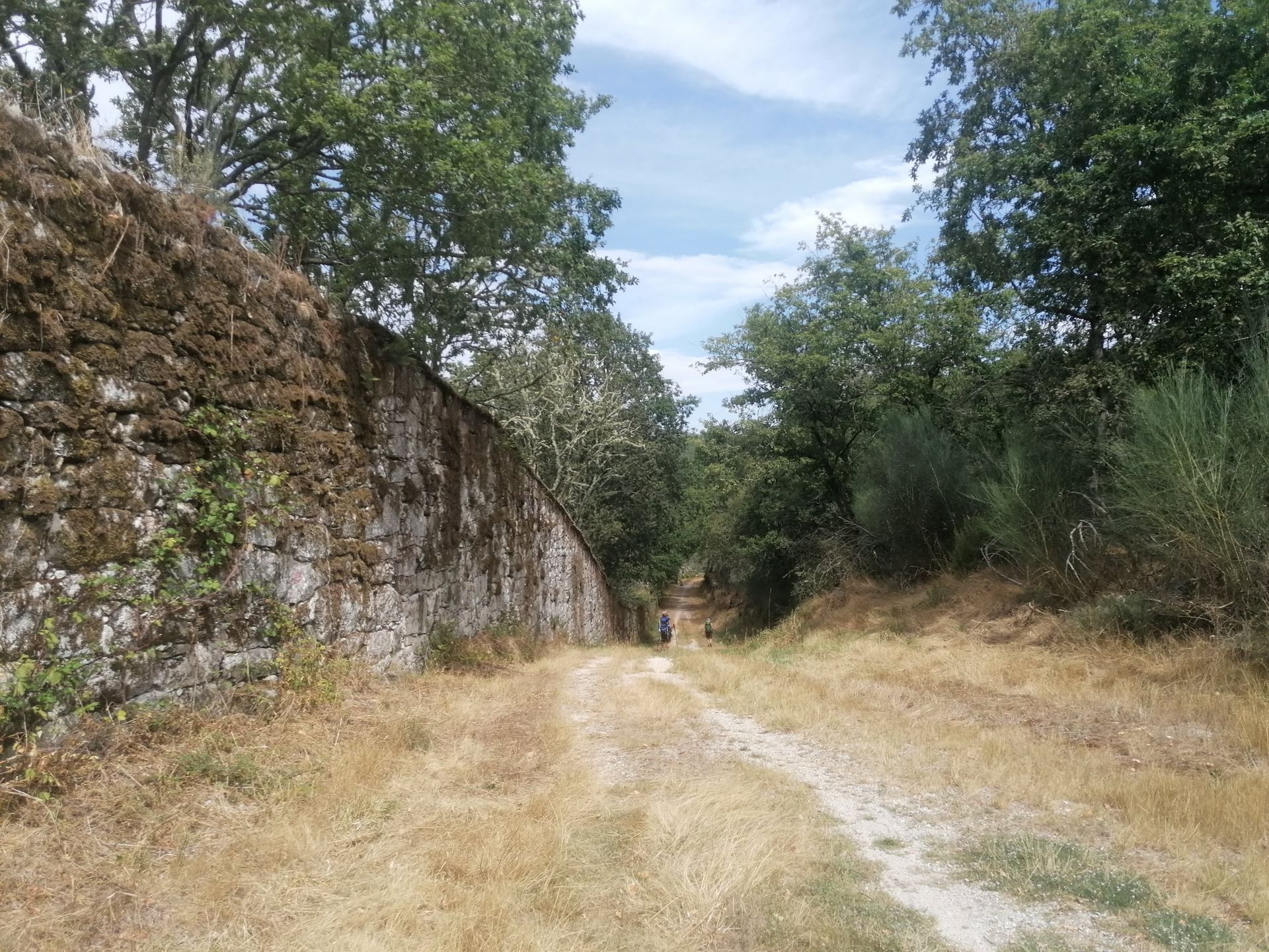 Bis zu unserer Unterkunft haben wir noch etwa eineinhalb Stunden zu laufen. Die Strecke an sich ist schön aber der erste Wandertag ist eben nie ganz einfach. Wir überqueren einen kleinen Fluss auf einer gut restaurierten mittelalterlichen Brücke, kommen durch ein verlassen wirkendes Dorf mit uralten Gemäuern, und es wird immer anstrengender, in dieser Hitze vorwärtszukommen. Bald nach unserer Pause finden wir eine Lichtung im Wald, die geradezu zu einem ausgedehnten Nachmittagsschläfchen einlädt. Nach einer Weile breche ich wieder auf. Uschi möchte gerne noch ein wenig ruhen, doch ich habe Durst und kein Wasser mehr. Ich möchte zur Unterkunft. Ich schnappe mir meinen Rucksack und ziehe langsam weiter. Nach ein paar Minuten schließen Martina und Roswitha zu mir auf und wenig später auch Uschi. Die Hitze wird langsam unerträglich und wir rasten nach 30 Minuten noch einmal kurz an einem Gehöft und sehen uns dort etwas um, in der Hoffnung, einen Wasserhahn oder Brunnen zu finden. Durstig ziehen wir schließlich weiter. Dann kommt endlich ein Hinweisschild, das zu unserer Unterkunft weist. Von hier sind es noch 2 ½ km. Wir wollen schon rechts abbiegen, da bemerkt Uschi einen Pfad, der geradeaus führt und auf dem man, lt. Google Maps, auch nach Pazos zu unserer Unterkunft kommt. Wir riskieren es und stehen schon nach wenigen Minuten vor der Pension, in der ich uns für die kommenden zwei Nächte zwei Doppelzimmer gebucht habe. Uschis Abkürzung hat uns zwei lange Kilometer erspart.