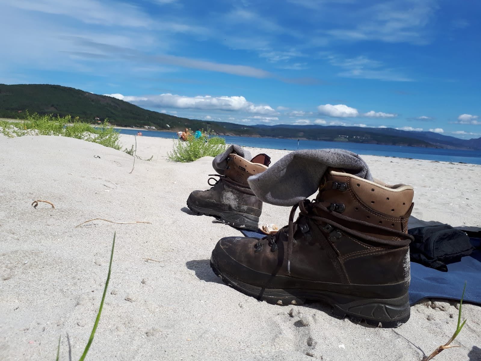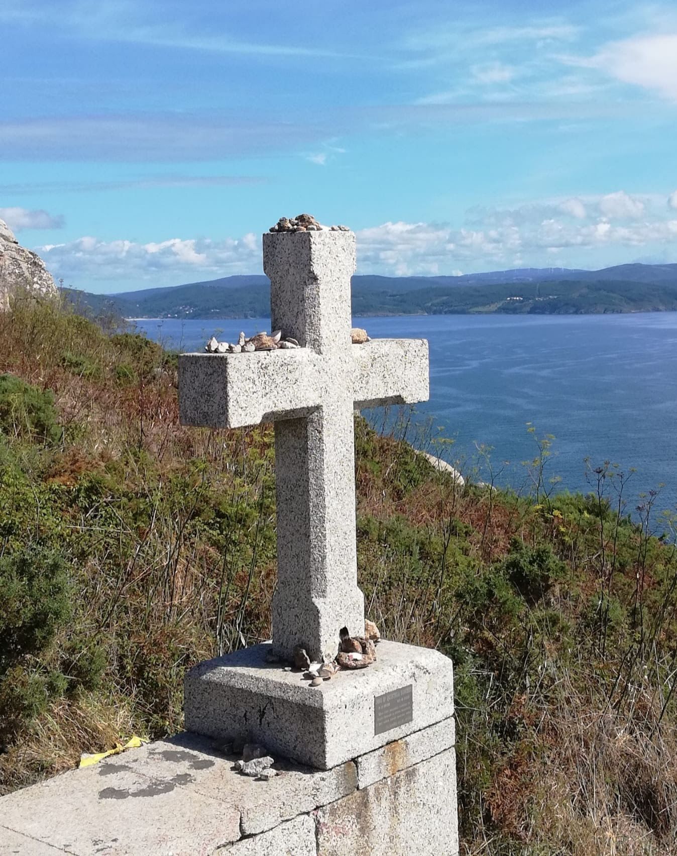 Anfangs ist es noch etwas bewölkt und diesig aber nach einer kurzen Frühstückspause, etwa auf halber Strecke, setzen wir die Fahrt bei strahlend blauem Himmel und angenehmen Temperaturen fort. Wir fahren bis zum großen Parkplatz fast am Ende der Straße und laufen dann die zwei Kilometer, vorbei an diversen Pilgerstatuen und Kreuzen, bis zum Leuchtturm von Fisterra. Dort schlängeln sich die Pfade zwischen Felsbrocken hindurch zu den Klippen hoch überm Meer und zu einem Wanderschuh aus Bronze, an dem seit jeher Pilger aus aller Welt ihre Schuhe verbrennen, die sie den weiten Weg bis hierher getragen haben. Die Einzige, die ein paar Schuhe zum Verbrennen hätte, ist Roswitha, doch sie lässt sich nicht dazu überreden.
