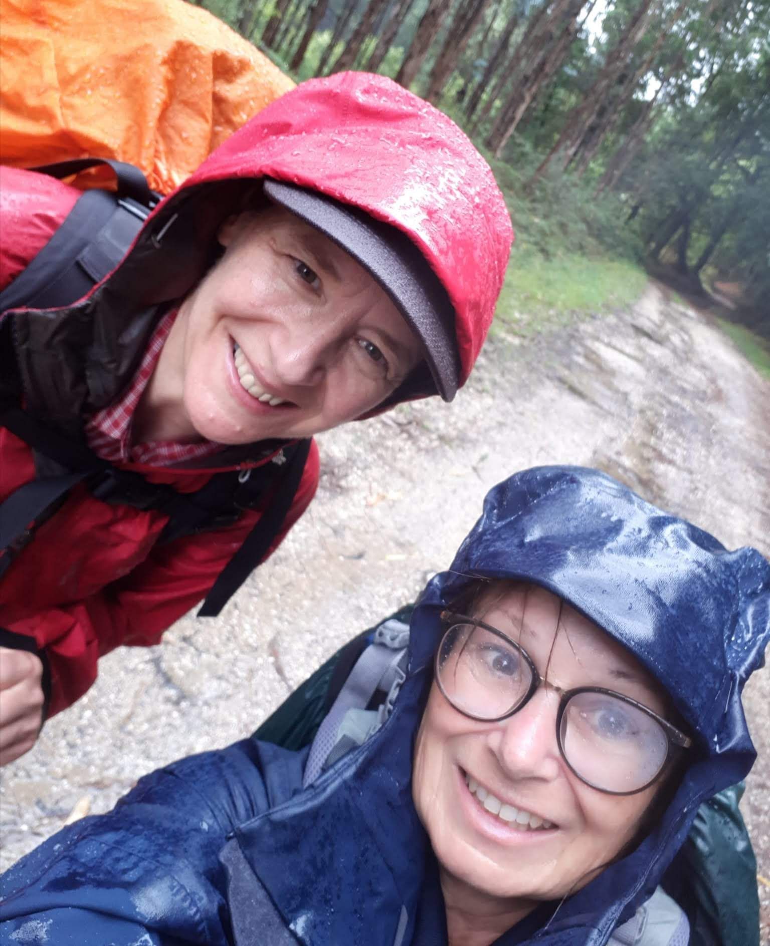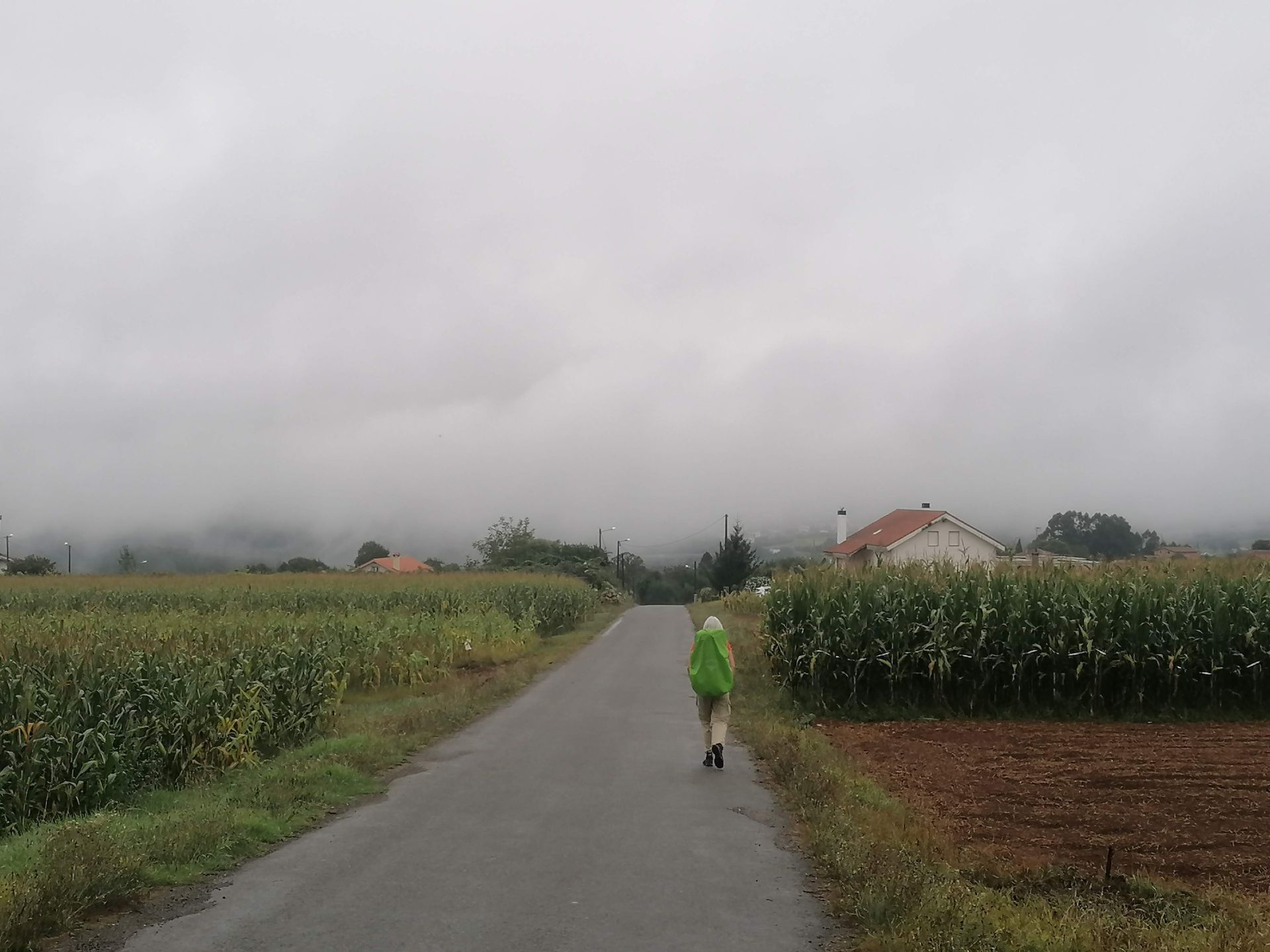 Die letzten 12 km liegen vor uns. Die erste halbe Stunde werden wir wieder nass, doch so schlimm wie gestern regnet es an diesem Morgen nicht und bald schon hört es ganz auf. Auf dieser letzten Etappe bleibt allerdings der Asphalt unser ständiger Wegbegleiter.