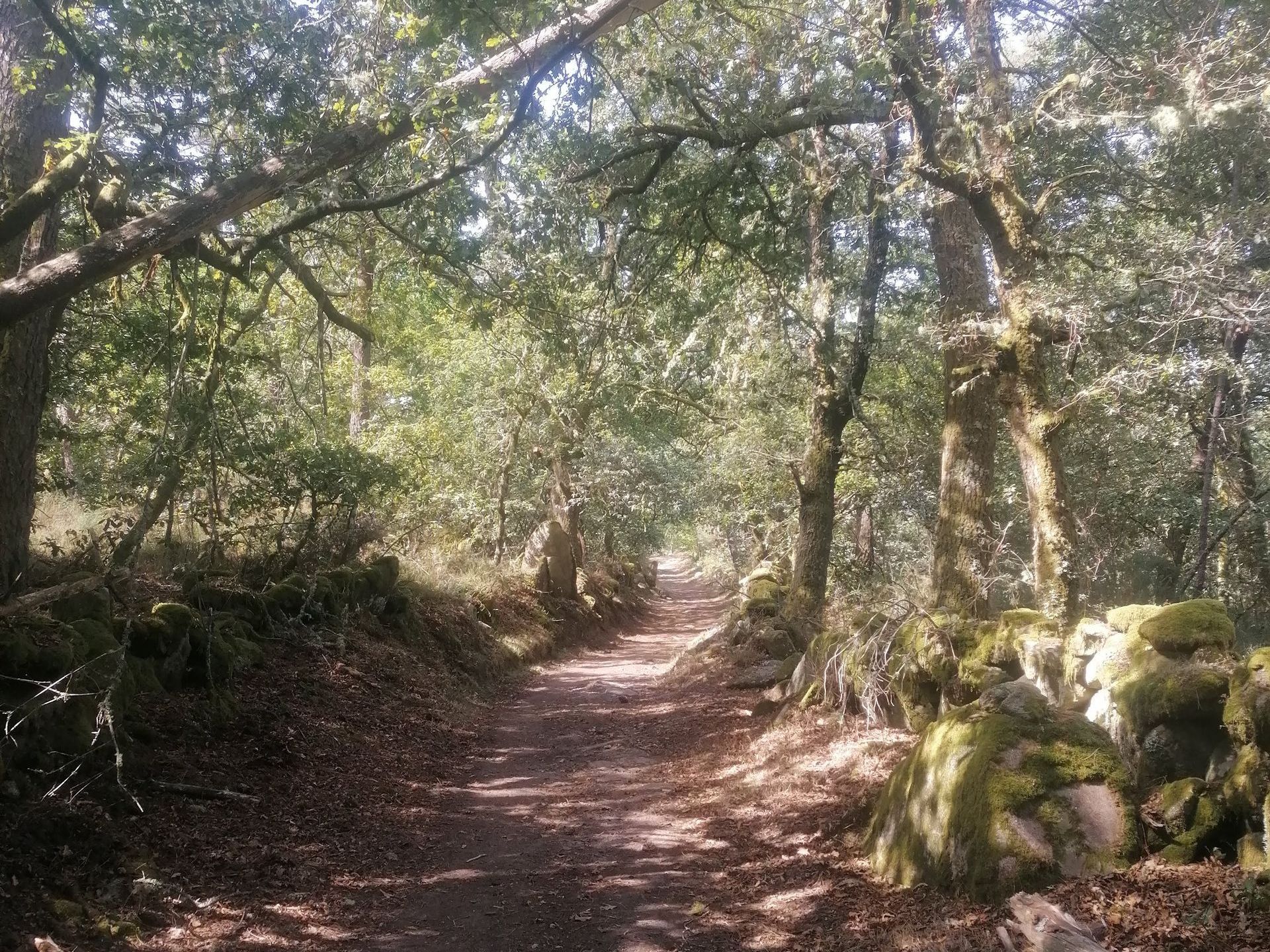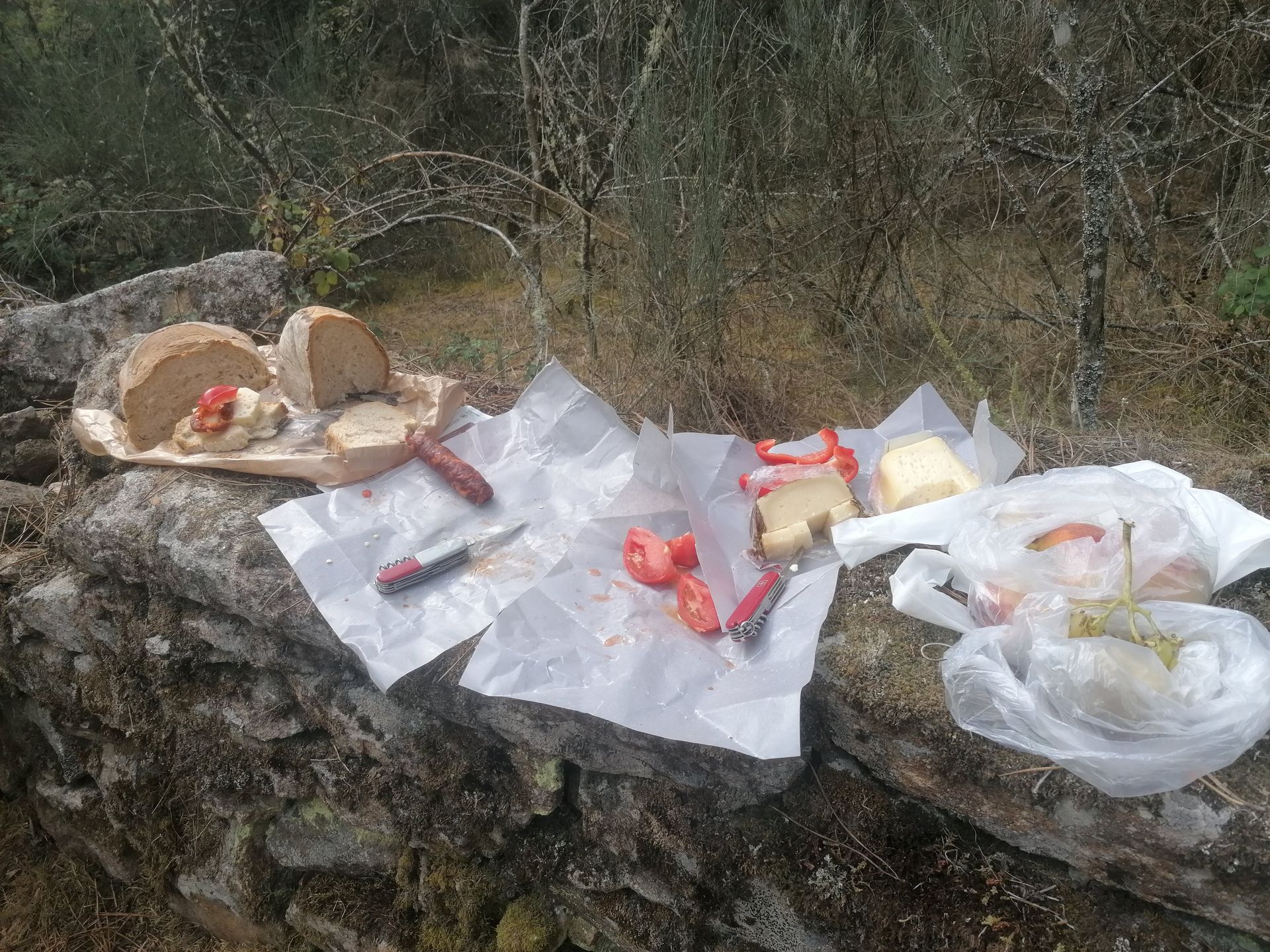 Die Einkäufe sind inzwischen erledigt und wir verlassen das Dorf und lassen uns kurze Zeit später an einer uralten Mauer im Wald nieder, um ausgiebig zu brunchen. Mittlerweile ist es 12:00 Uhr und ich habe den Gedanken, heute bis Castro Dozón zu wandern, längst abgeschrieben. Bei unserem Tempo müssen wir froh sein, wenn wir vor dem Abend das Kloster erreichen. Immerhin liegt noch eine Strecke von 9 km vor uns!