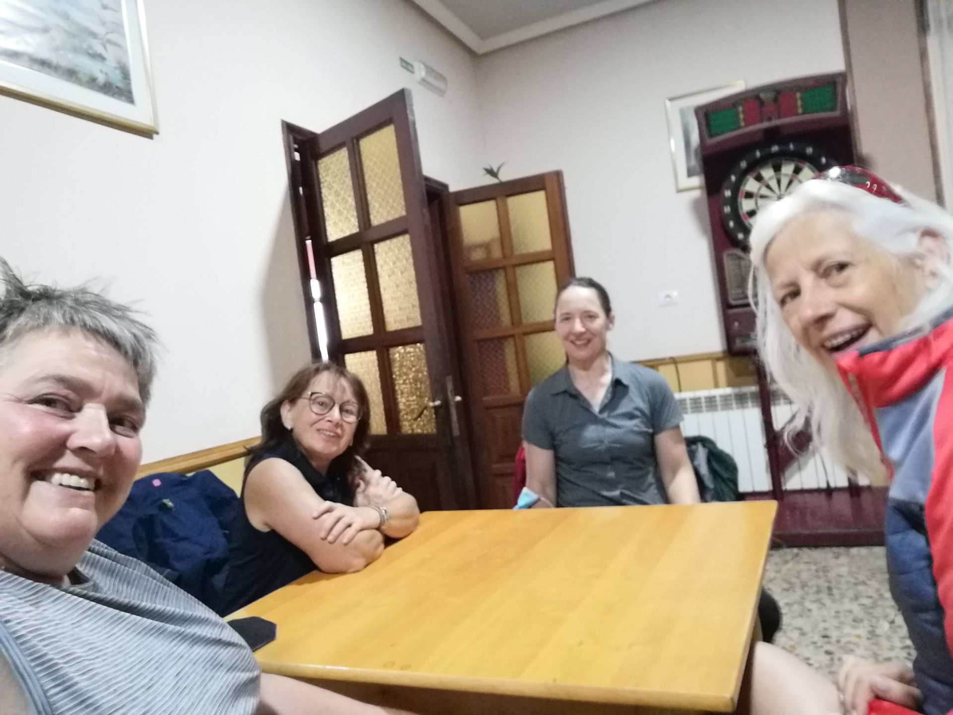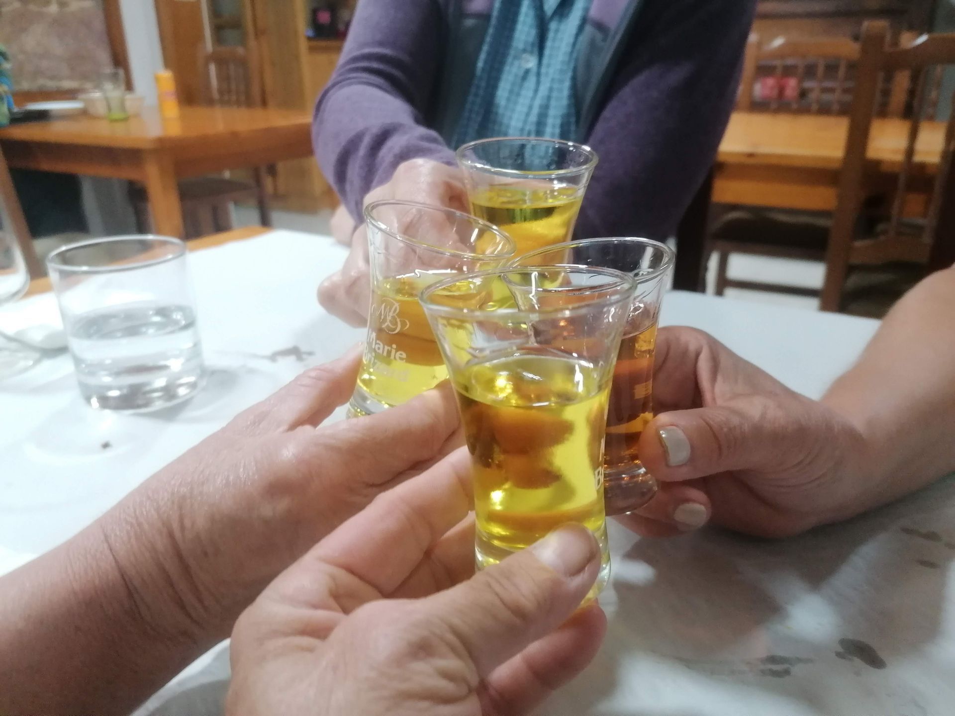 Er kann immer noch nicht glauben, dass Pilgerinnen Schnaps trinken, doch er bringt nun vier Gläser und schenkt eine klare Flüssigkeit ein. Martina ziert sich und lehnt den Schnaps ab, doch unser Wirt lässt nun nicht locker und „verordnet“ ihr einen kleinen Probe-Schluck. Praktisch einen Chupitito! Ehrlich erstaunt sieht er dann zu, wie wir vier unseren Schnaps kippen, dann geht er zur Theke, holt sich auch ein Glas und schenkt noch einmal eine Runde ein. Und dieses Mal nimmt auch Martina einen ordentlichen Chupito! Der Schnaps geht dann auch aufs Haus!