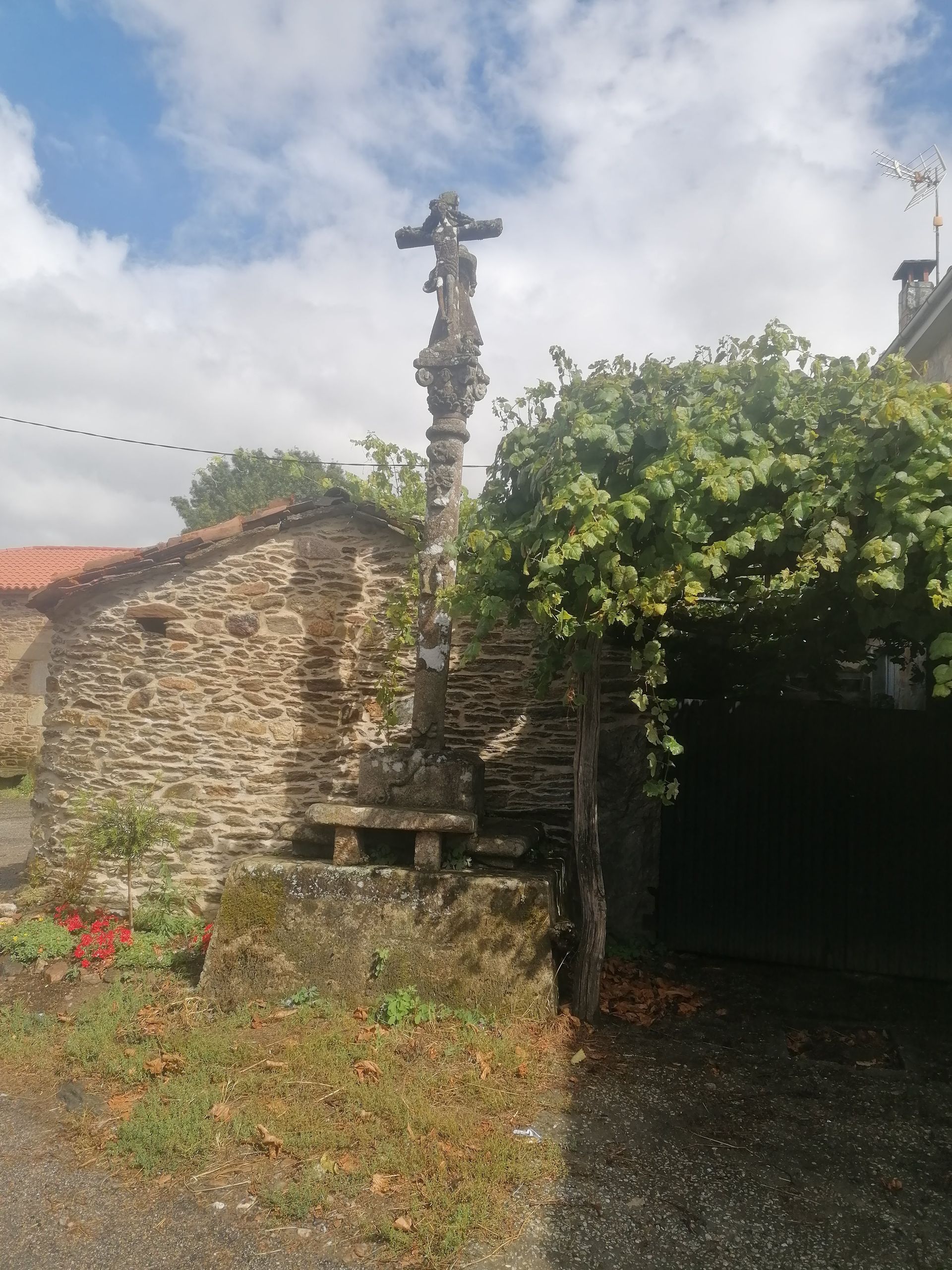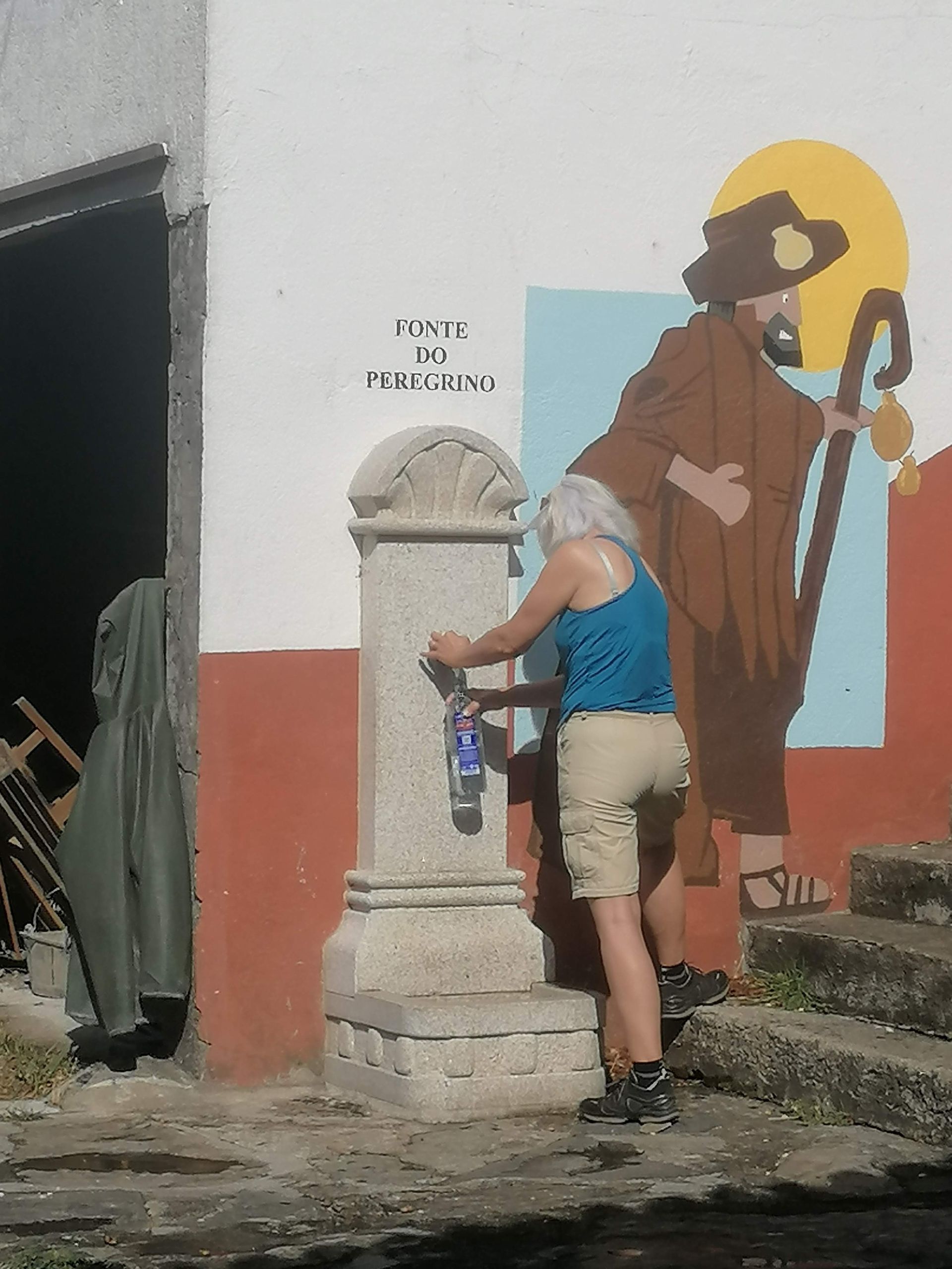Wir sitzen noch nicht lange, da kommt eine Pilgergesellschaft am Brunnen an, die uns sehr bekannt vorkommt. Die Frauen lösen das Rätsel: sie haben vorletzte Nacht auch in Pazos übernachtet, sind gestern bis Castro Dozón gewandert und kommen jetzt von dort. Sie tragen nur kleine, leichte Rucksäcke, ihr großes Gepäck wird per Taxi transportiert. Während wir am Brunnen rasten, zieht die Gruppe weiter. Wir treffen sie ein paar Stunden später an der Bahnhofsraststätte von Lalín wieder, genauer gesagt im Ortsteil Estación de Lalín, wo sie gerade aufbrechen, als wir dort ankommen.