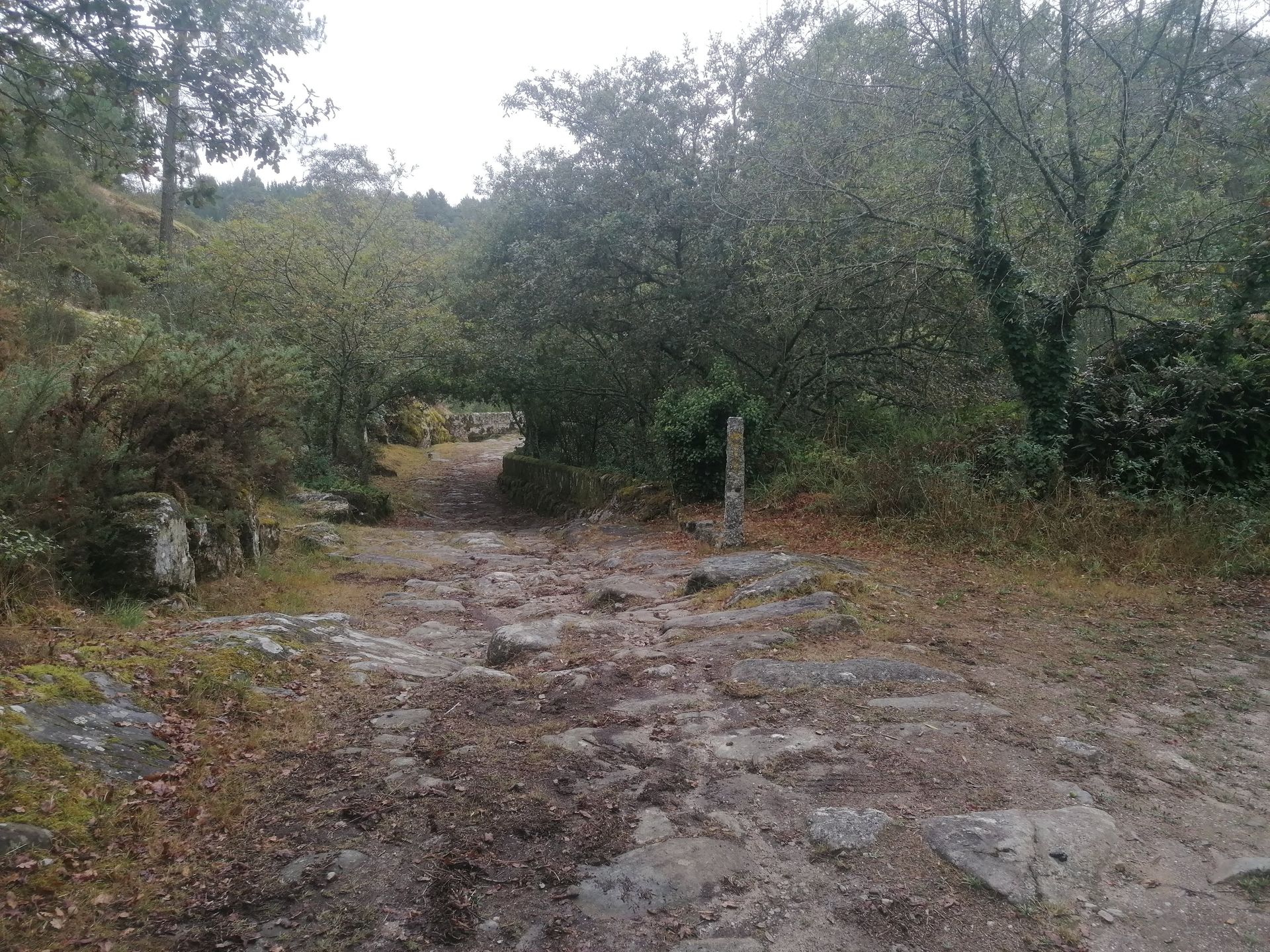 Wir fragen die Gruppe, ob Uschi hier vorbeigekommen ist und sie bejahen. Sie meinen allerdings, das sei schon eine ganze Weile her und wir würden sie sicher nicht mehr einholen. Wir halten uns nicht lange auf, sondern setzen unseren Weg durch den Wald fort. Wieder einmal laufen wir auf uralten Steinplatten, die bei dem einsetzenden Regen ziemlich glitschig werden. Wir überqueren eine Brücke aus der Römerzeit, teils von Dornen überwachsen, die Steine grün und rutschig von der Nässe. Auf diesem Weg hier fühle ich mich stellenweise in eine andere Zeit versetzt.