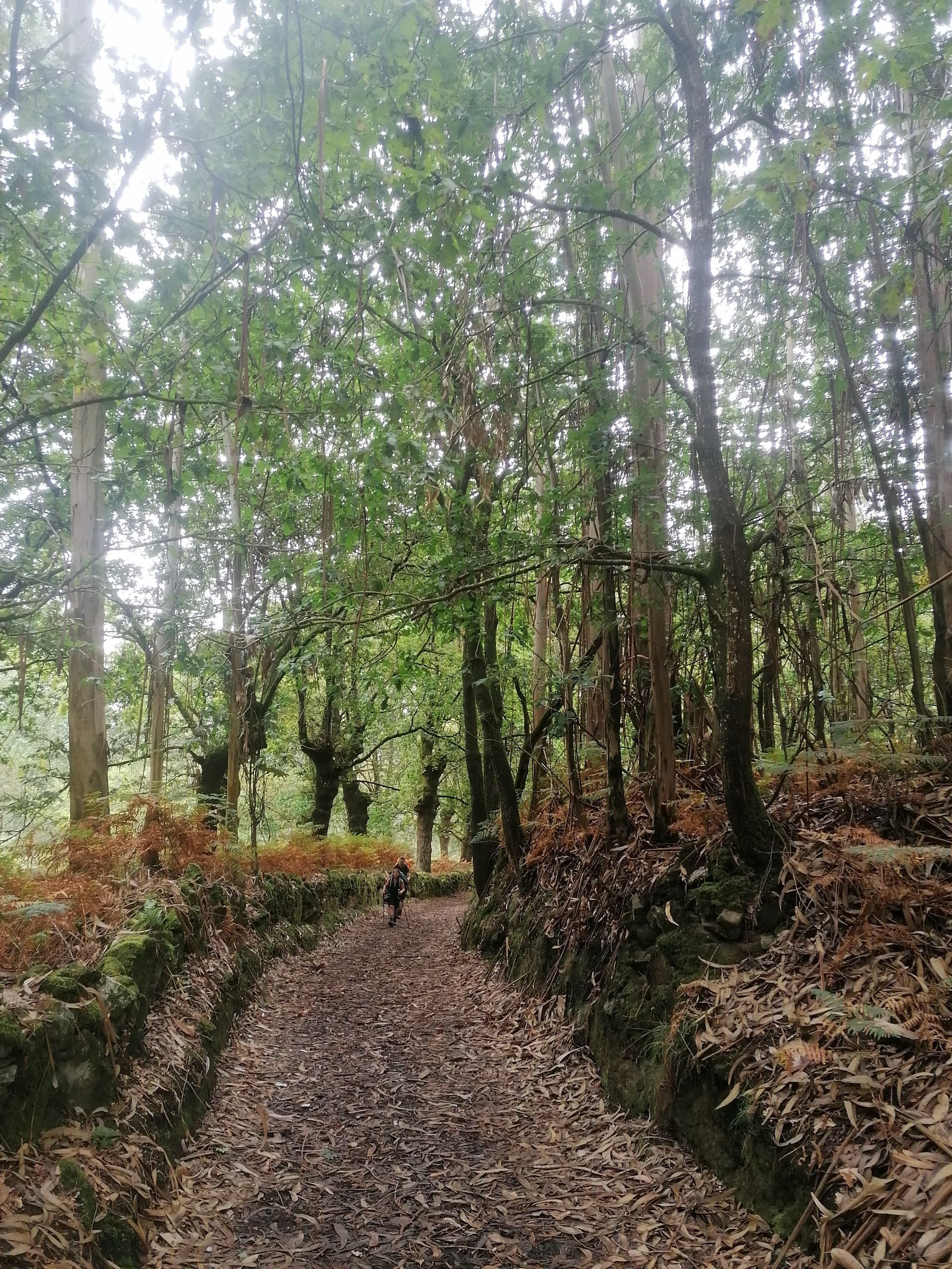 Weit unter uns überspannt eine gigantische Brücke das Tal und uns führt der Weg dort hinunter und schließlich unter der Brücke hindurch. Als wir gegen Mittag durch das Dorf Ponte Ulla kommen, beginnt es zu regnen und wir flüchten in eine Kneipe. Die Wirtin scheint nicht viel Zeit für uns zu haben, bringt uns nur schnell was zu trinken und hat nichts dagegen, dass wir die mitgebrachte Tortilla und das Brot bei ihr im Gastraum essen. Es halten sich noch zwei Männer in der Bar auf und als kurz nach uns die Engländerinnen ankommen, wird ihnen der Zutritt verwehrt, weil nur 9 Gäste und die Wirtin gleichzeitig im Raum sein dürfen. Ich vergesse hier immer wieder, dass Corona noch nicht aus der Welt ist und wir uns nach wie vor an die Pandemie-Regeln halten müssen. Die zwei Spanier sind aber echte Gentlemen und gehen mit ihrem Bier nach draußen unters Vordach, damit die englischen Damen die Bar betreten dürfen. Wir brechen nach ein paar Minuten auch wieder auf und stapfen durch den Regen davon.