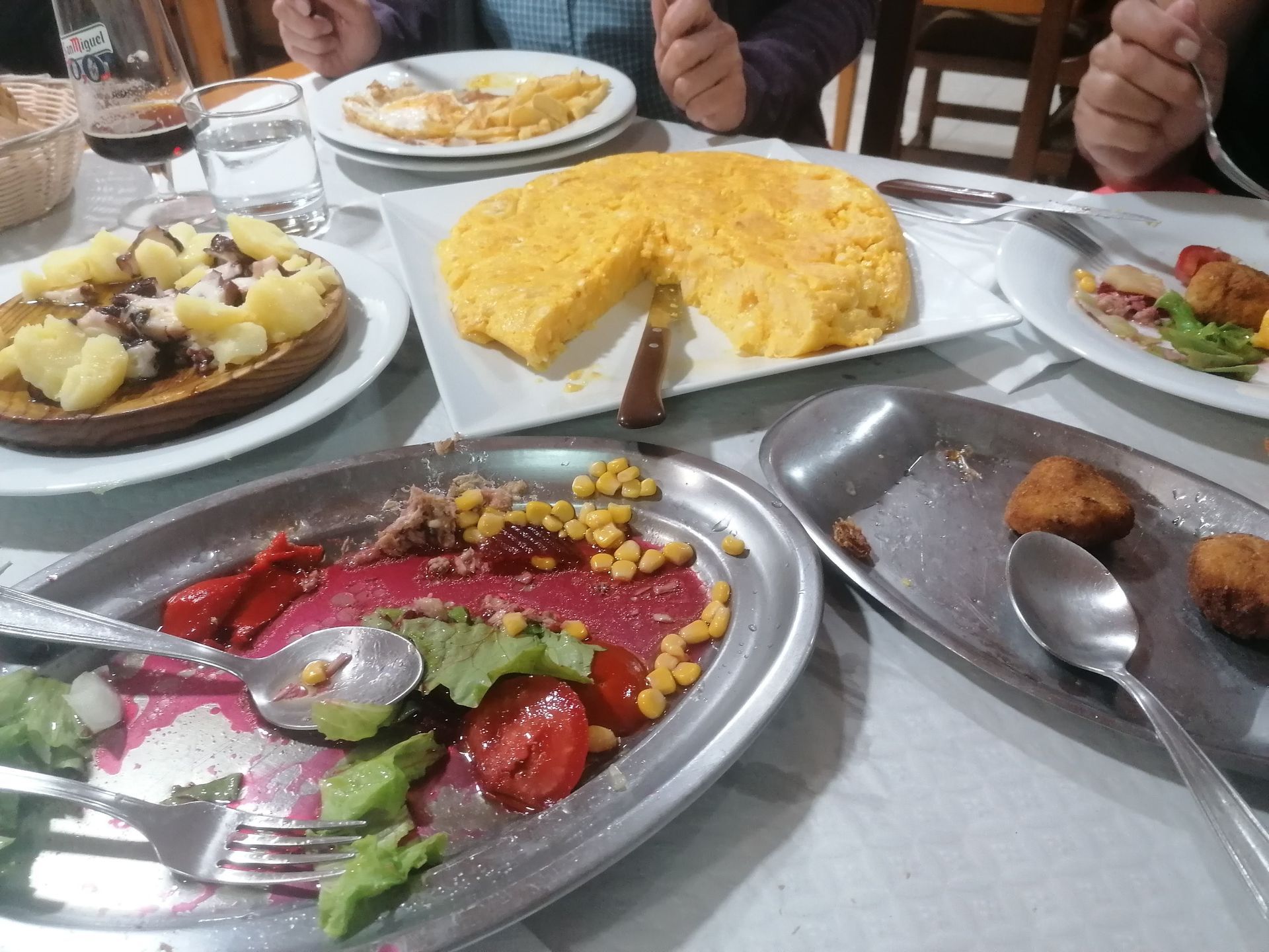 Abends fährt unser Hauswirt uns wieder zum Restaurant nach Cea. Wir haben uns kaum am Tisch niedergelassen, da stellt der Wirt wortlos vier Chupitos vor uns hin, fragt diesmal gar nicht erst nach unseren Wünschen, sondern bringt gleich darauf das Essen. Es gibt Nudeln mit Pilzen, Eiern und Salat. Es ist vom Angebot her nicht mehr so delikat wie gestern, sondern gleicht eher einem Reste-Essen, aber es schmeckt dennoch gut, ist reichlich, und es gibt danach einen Café solo und ein Dessert. Tarta Santiago – eine Mandeltorte und Tarta de Queso – Käsekuchen. Beides wird mit sehr viel Kaffee-Schnaps übergossen. Zur Rechnung trinkt der Wirt dann noch einen Chupito mit uns, der wieder aufs Haus geht.