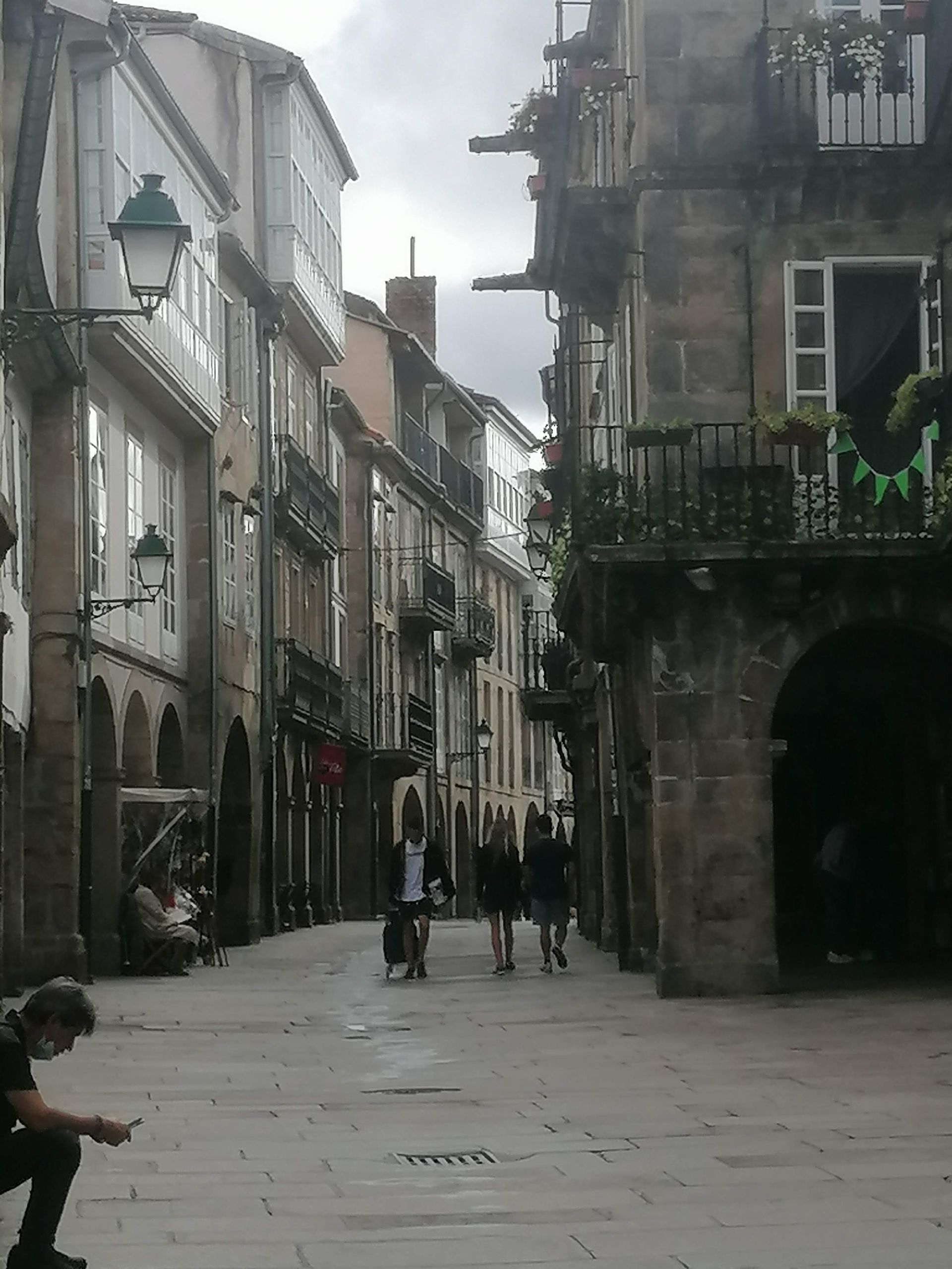 Wie bei meiner ersten Ankunft im Jahr 2010, haben wir auch jetzt wieder ein Heiliges Jahr, das aufgrund der Corona-Pandemie sogar um ein Jahr verlängert wurde. Das hat es in der ganzen Geschichte des Jakobswegs noch nie gegeben! Was es vermutlich auch noch nie gegeben hat, ist, dass man sich im Pilgerbüro erst online registrieren muss und dann ein Zeitfenster für die Ausstellung der Compostela zugeteilt bekommt. Es herrscht ein heilloses Durcheinander vor dem Pilgerbüro. Dadurch, dass wir erst nach Mittag hier ankommen, wird unser Termin erst morgen sein, falls wir es überhaupt schaffen, uns online anzumelden. Das ganze System ist gerade am Zusammenbrechen. Um uns herum sind lauter teils ratlose, teils erboste Pilger. Pilger, die heute angekommen sind, morgen früh bereits abreisen wollen, aber erst morgen gegen Mittag einen Termin im Pilgerbüro erhalten. Pilger, die wie wir, an der Online-Registrierung scheitern. Pilger, die kein Spanisch sprechen und daher nicht verstehen, warum man sie nicht ins Pilgerbüro eintreten lässt.