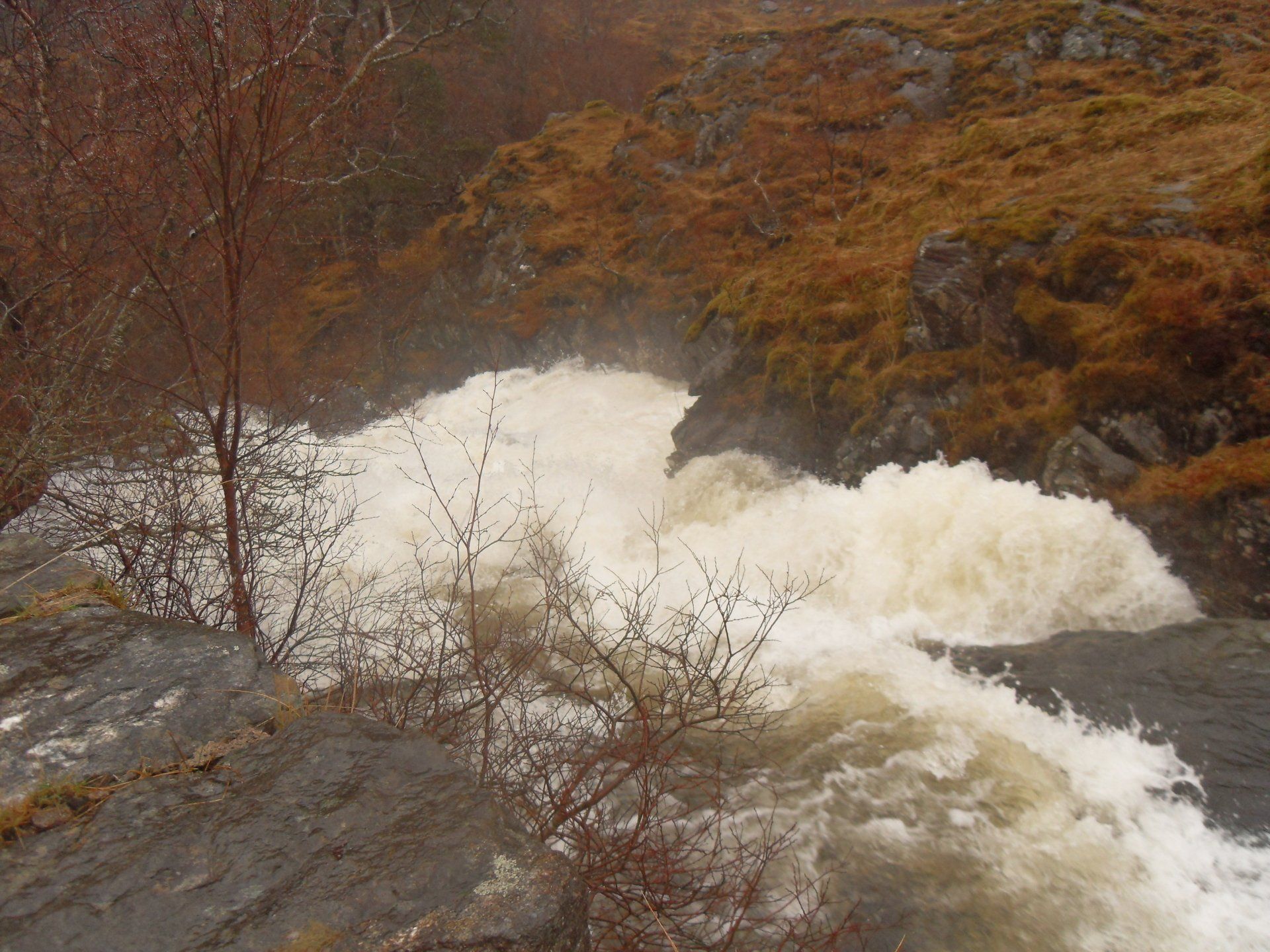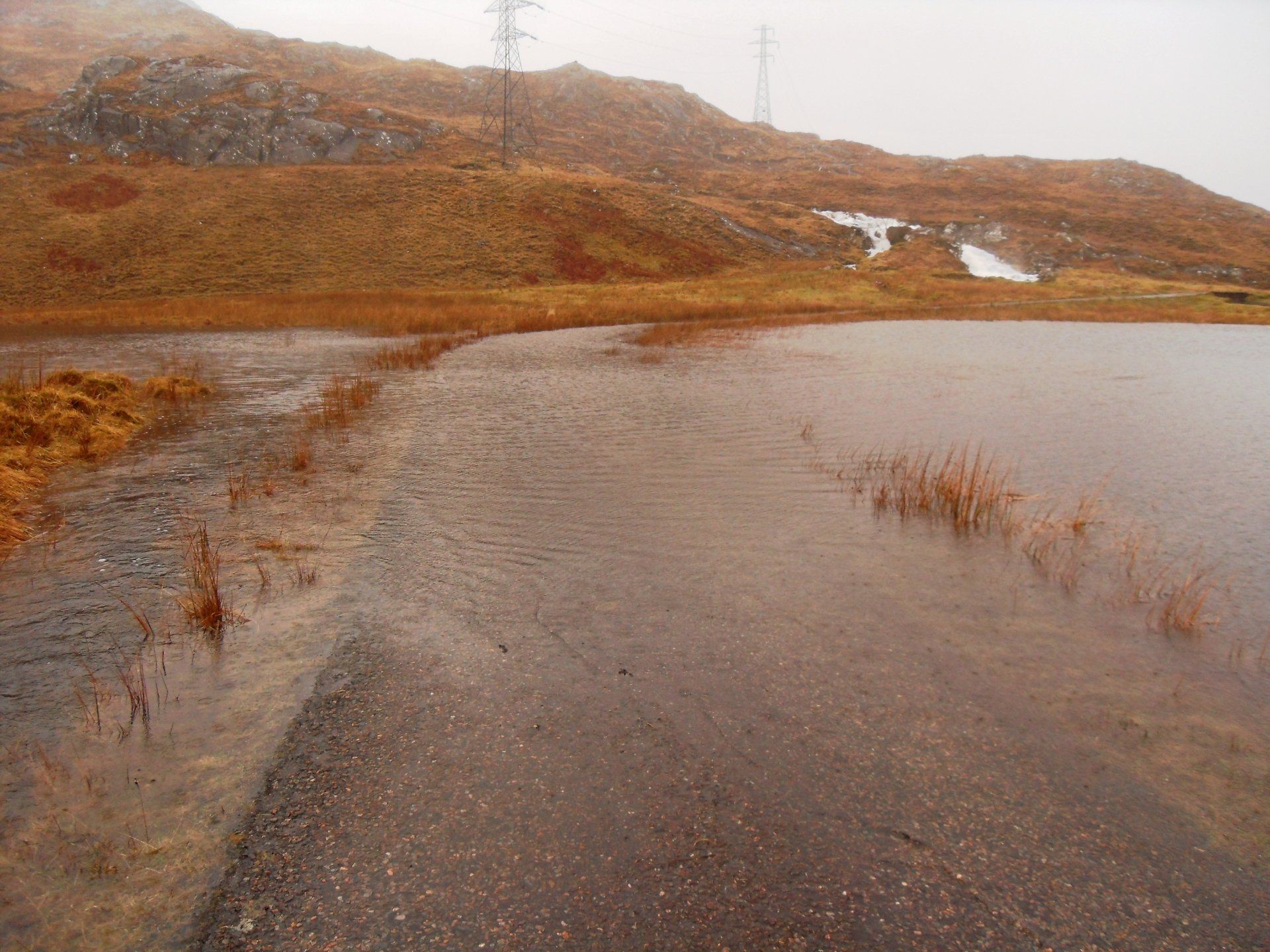 Wir fuhren weiter auf der A82, bis wir bei Invergarry - kurz vor Loch Ness - auf die A87 abbogen. Noch ein paar Kilometer und wir verließen die Hauptstraße, um ins Glen Garry abzubiegen. Loch Garry und Loch Poulary passierten wir noch, dann war Schluss mit Taxifahren. Die Straße war total überschwemmt und es gab kein Vorwärtskommen mehr. Kurzentschlossen stieg ich aus, zahlte den Fahrer und machte mich auf die Socken, um die letzten 8 km zu Fuß zurückzulegen. Und das meine ich jetzt wortwörtlich, auf die Socken, denn die Schuhe zog ich für die nächsten paar hundert Meter aus und watete auf Strümpfen durchs knietiefe Wasser. Das Abenteuer hatte begonnen!