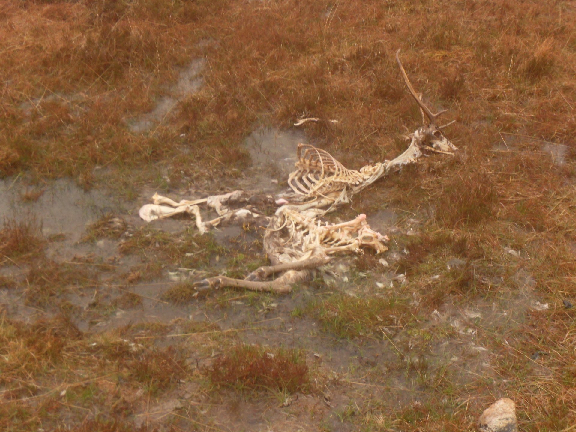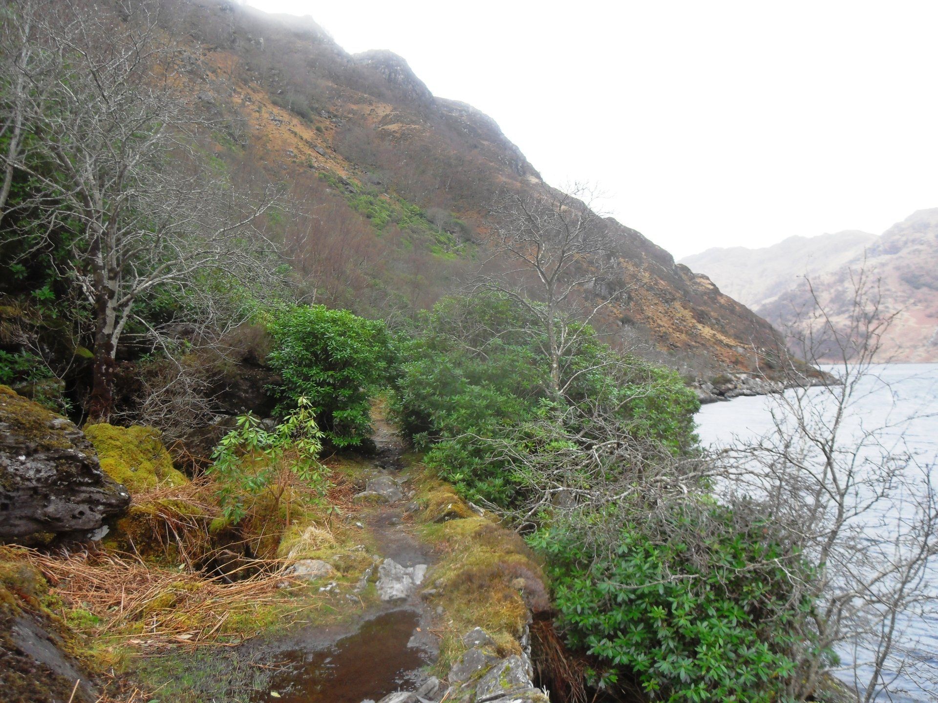 Die Straße endete nach wenigen Metern und ging in einen schmalen Pfad zwischen üppig wachsendem Rhododendron über. Jeder Schritt musste ab jetzt genau gesetzt werden, denn zwischen kopfgroßen Steinen und armdicken Wurzeln taten sich auch immer wieder Schlammlöcher auf. Teils führte der Pfad direkt am Loch Beag entlang, wie Loch Hourn hier noch genannt wird, teils erklomm man schon den einen oder anderen Hügel. Nach zwei Stunden legte ich in Runival, bei ein paar Crofterhütten, eine Pause ein und streifte ohne den schweren Rucksack, der immerhin ein Gewicht von 13 Kilo hatte, zwischen Felsbrocken und Schwemmholz am Strand umher. Dabei entdeckte ich mehrere Hirsch-Skelette. Solche waren mir tags zuvor auf dem Weg nach Kinlochhourn schon aufgefallen. Später erfuhr ich, dass sie verhungert waren. Sie waren Opfer des ungewöhnlich langen und harten Winters geworden.