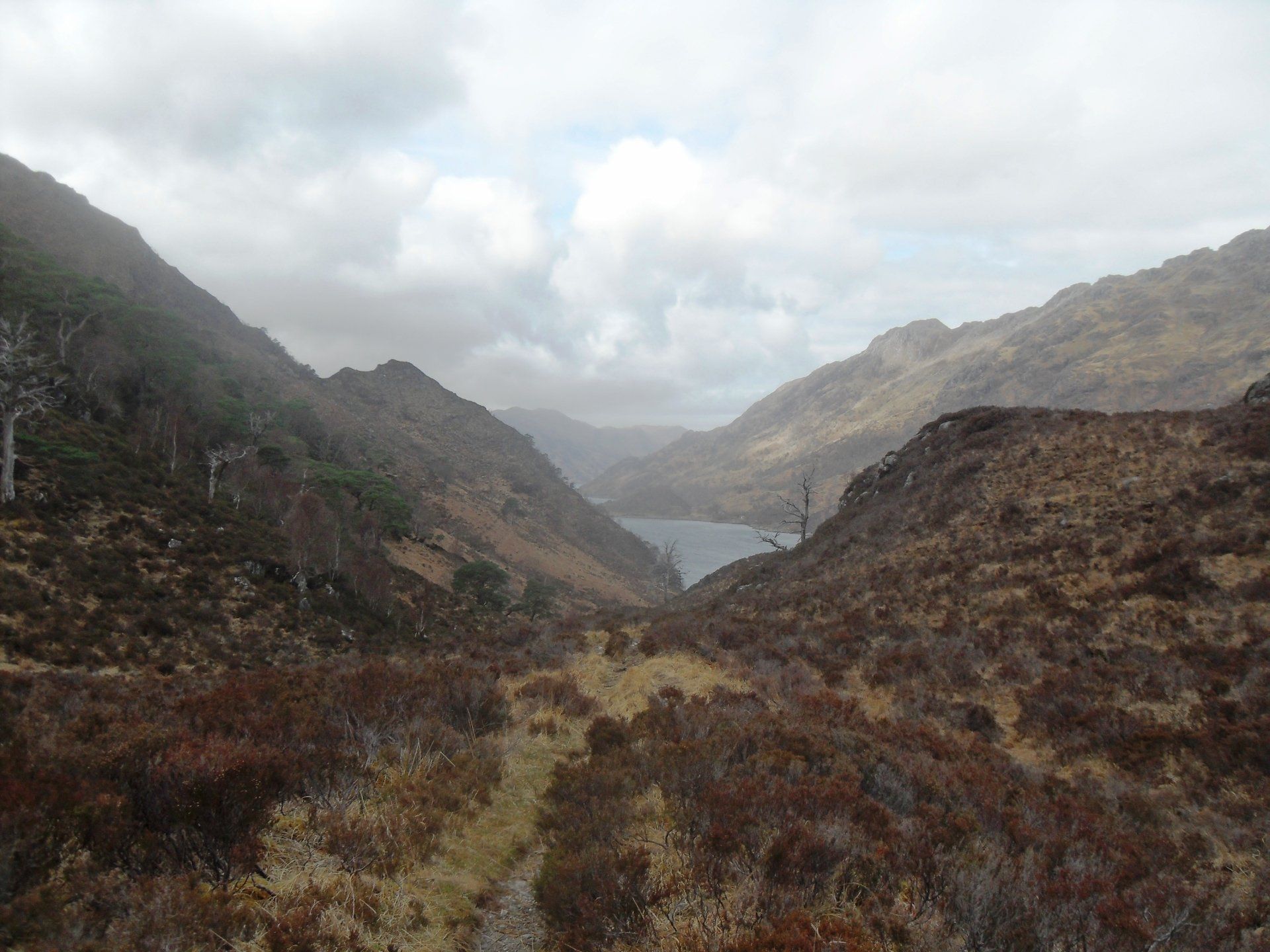 Die Sonne brannte weiterhin vom Himmel und der Aufsieg war schweißtreibend. 400 Höhenmeter weiter hätte ich eigentlich schon am Pass sein müssen, doch ich war mir nicht mehr sicher, ob ich noch dem Pfad folgte oder irgendeinem der vielen Wildwechsel. Irgendwann stand ich mit dem Rücken zur Wand auf einem schmalen Sims und kam nicht mehr weiter. Wenigstens konnte ich von da aus den Pfad sehen, wie er sich vom Pass ins Tal schlängelte. Ich musste mich weiter links halten und noch etwas höher hinaufsteigen. Als ich endlich oben angekommen war, drehte ich mich um, um noch einmal zum Loch Nevis zurückzuschauen, und bekam einen gehörigen Schrecken. Da kam eine schwarze Wolkenwand auf mich zu.