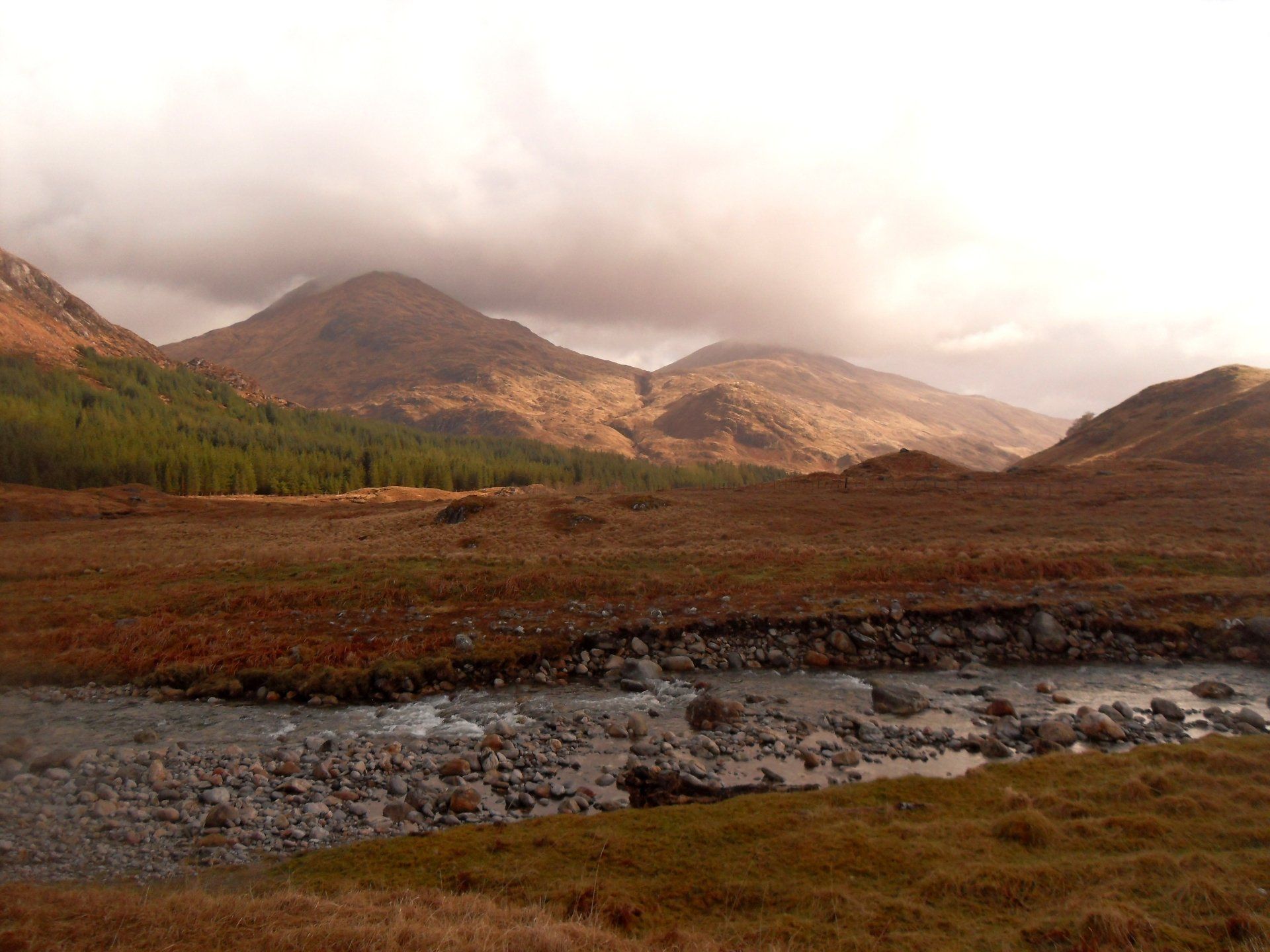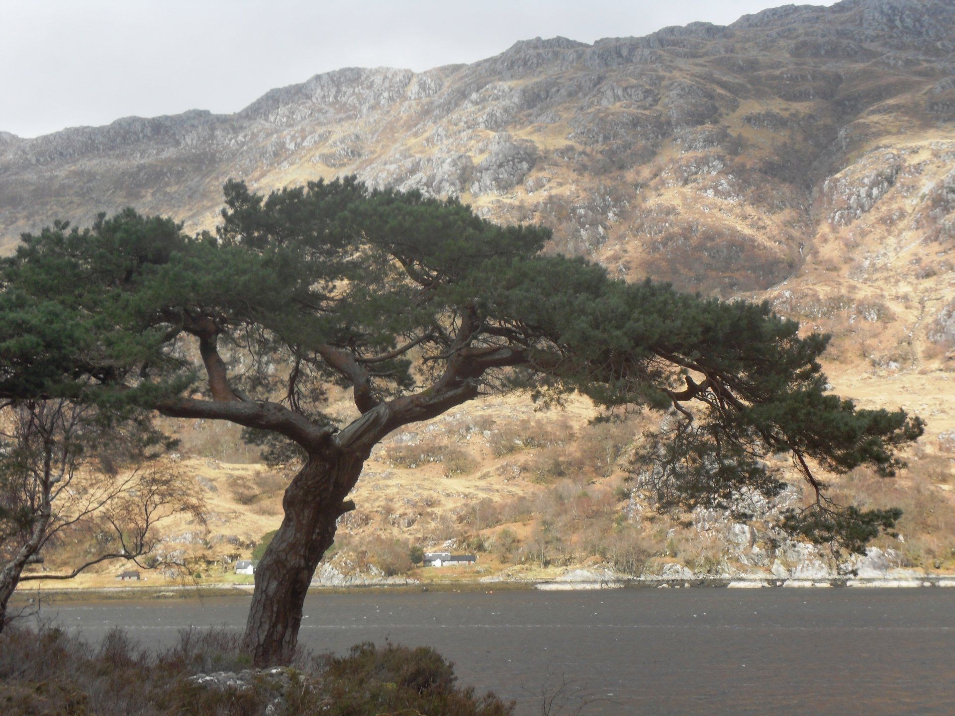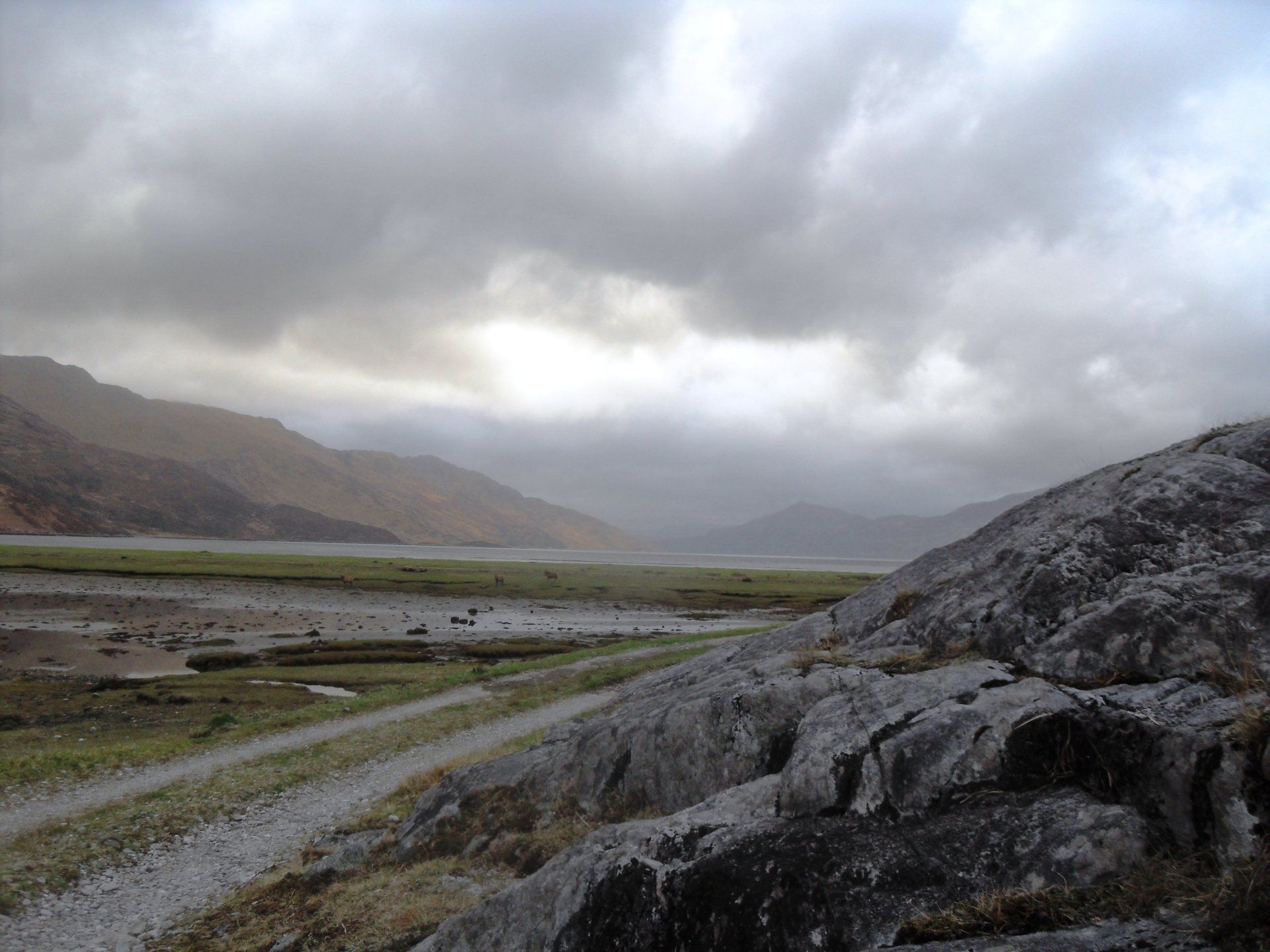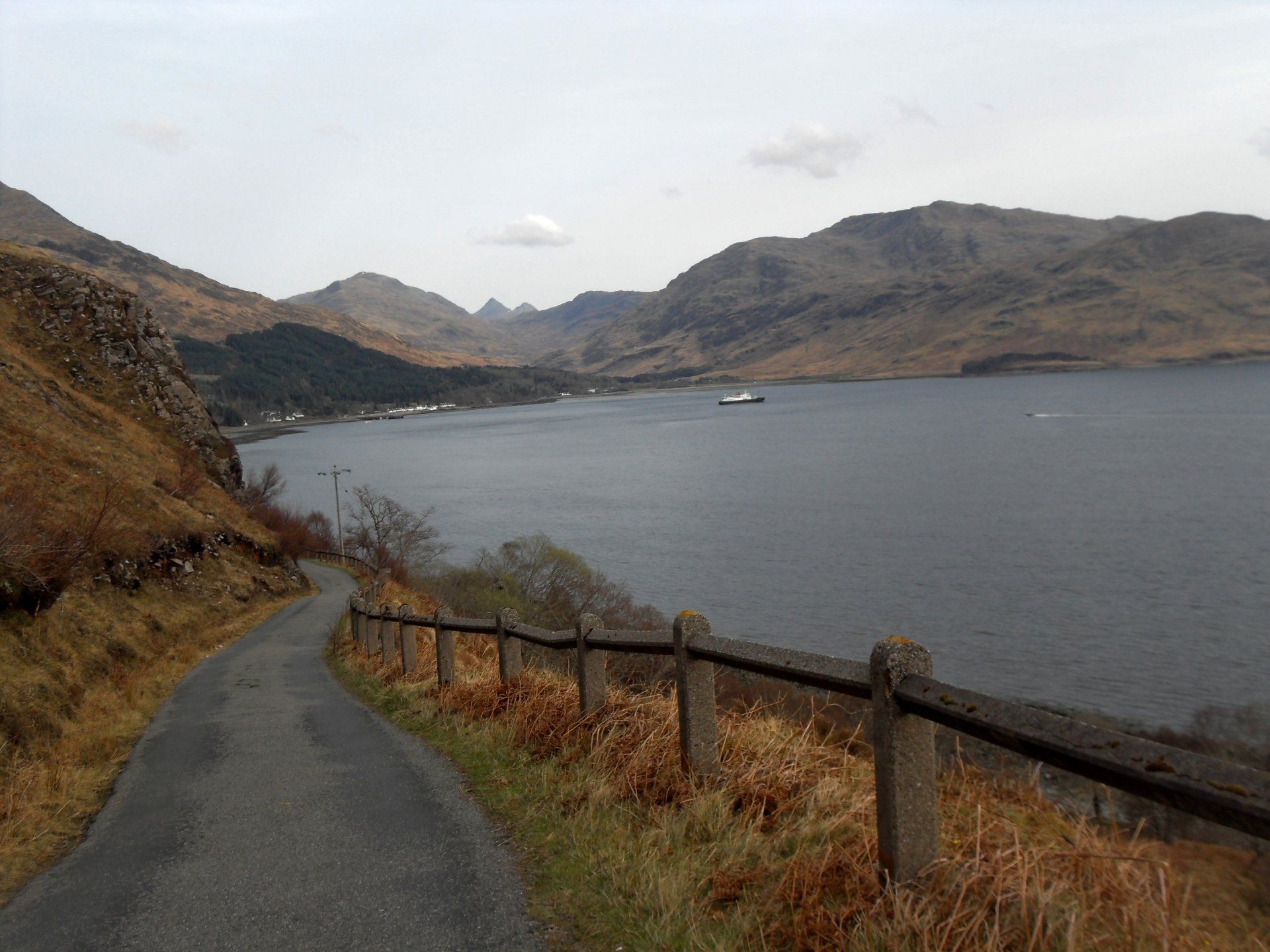 Der Bus verließ Glasgow auf der A82 nach Norden. Hatte ich mich während der Fahrt nach Glasgow noch in mein Buch vertieft, weil wegen dem unaufhörlichen Regen sowieso von der Landschaft nichts zu sehen war, so war ich jetzt von der Gegend hellauf begeistert. Der Regen hatte etwas nachgelassen und die Straße schlängelte sich entlang des Loch Lomond. So manches Mal manövrierte der Fahrer seinen Bus auf der schmalen Straße knapp am Abgrund entlang und auch zurücksetzen musste er einige Male, wenn Busse oder LKWs entgegenkamen. Nachdem wir Loch Lomond hinter uns gelassen hatten, führte der Weg durchs Rannoch Moor und schließlich ins sagenumwobene Glencoe - das Tal der Tränen. Mit der Zeit sammelten wir immer mehr völlig durchnässte Wanderer auf, die auf dem West-Highland-Way unterwegs waren, dessen Verlauf oft mit der Straße identisch war. Vorbei an den Three Sisters erreichten wir am Loch Linnhe entlang Fort William. Dort stand direkt am Bus bereits mein Taxi, das mich zur Farm am Loch Hourn bringen sollte. Mittlerweile schüttete der Himmel alles aus, was die tiefhängenden Wolken hergaben und der Fahrer hatte es sehr eilig. Er wollte so schnell wie möglich zu der zweistündigen Fahrt (einfache Wegstrecke) aufbrechen, weil er mit Überschwemmungen rechnete. Der viele Regen hätte aber auch sein Gutes, sagte er, denn mit Schnee müsse man "oben" nun nicht mehr rechnen.