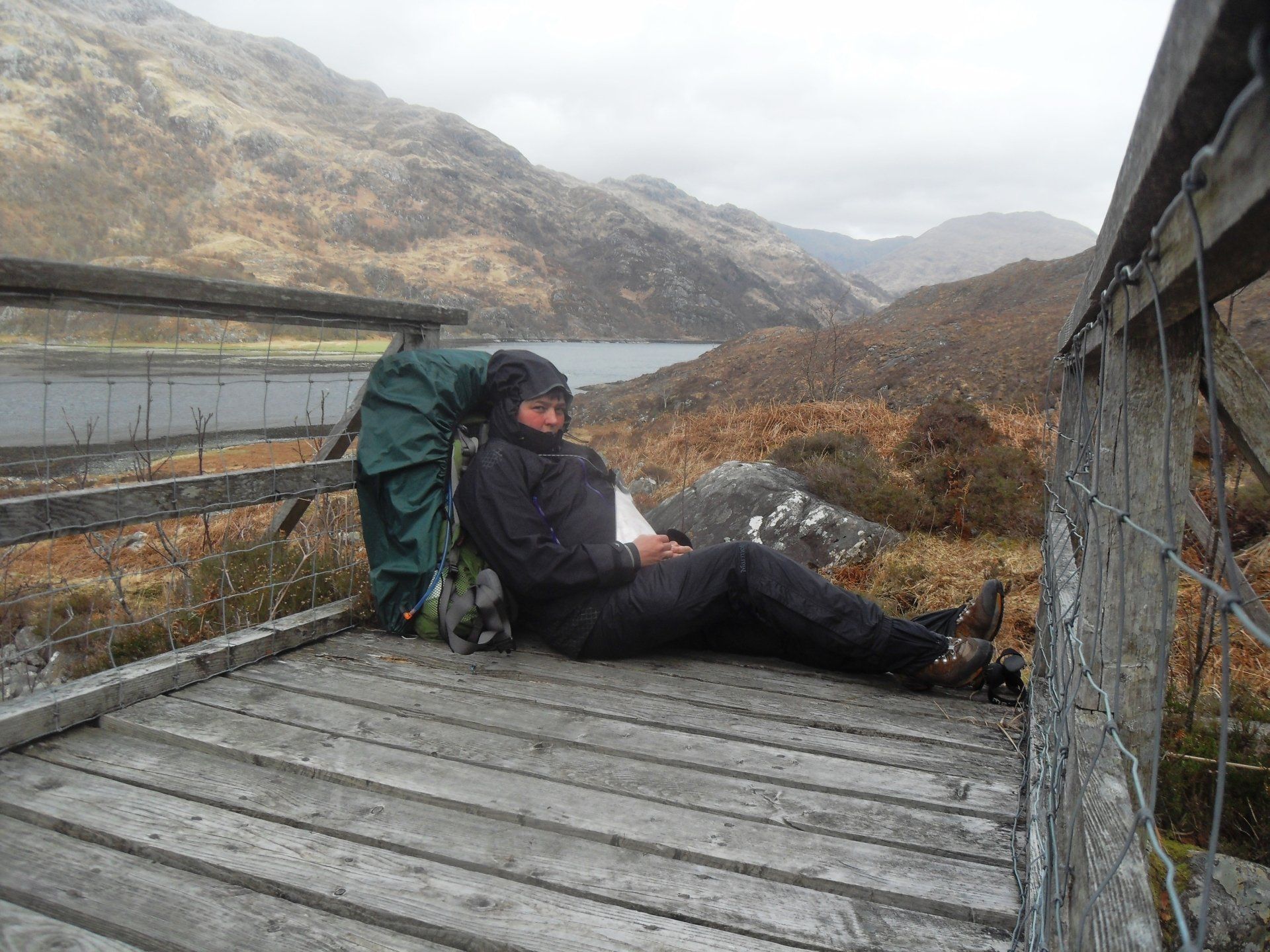 Der Regen hatte noch vor meinem Start am Morgen aufgehört, doch der Wind brachte feuchte Luft vom Meer her. Auf einer Brücke sitzend legte ich, gegen meinen Rucksack gelehnt und in meine Regenklamotten gekuschelt, eine längere Pause ein. Als ich den Rucksack wieder schwungvoll auf meinen Rücken hieven wollte, zog mich das schwere Teil nach hinten und ich sah mich schon unsanft auf den Boden plumpsen, da fing mich von hinten jemand auf. Der Schreck über die zugreifenden Hände war noch größer als das Erschrecken über den bevorstehenden Sturz. Ich hatte nicht gesehen, dass da jemand kam. Der schottische Munro-Bagger stellte mich auf die Füße, erkundigte sich kurz nach meinem Befinden und war schon wieder verschwunden, seinen nächsten Munro zu baggen. Als Munro bezeichnet man in Schottland einen Berg, der höher ist als 3000 ft (914,4 m) und ein Munro-Bagger "sammelt" diese Berge. Es gibt derer 282 in Schottland. Kleinere Berge heißen Corbett (2500-3000 ft), Graham (2000- 2500 ft) und Marilyn (unter 2000 ft).