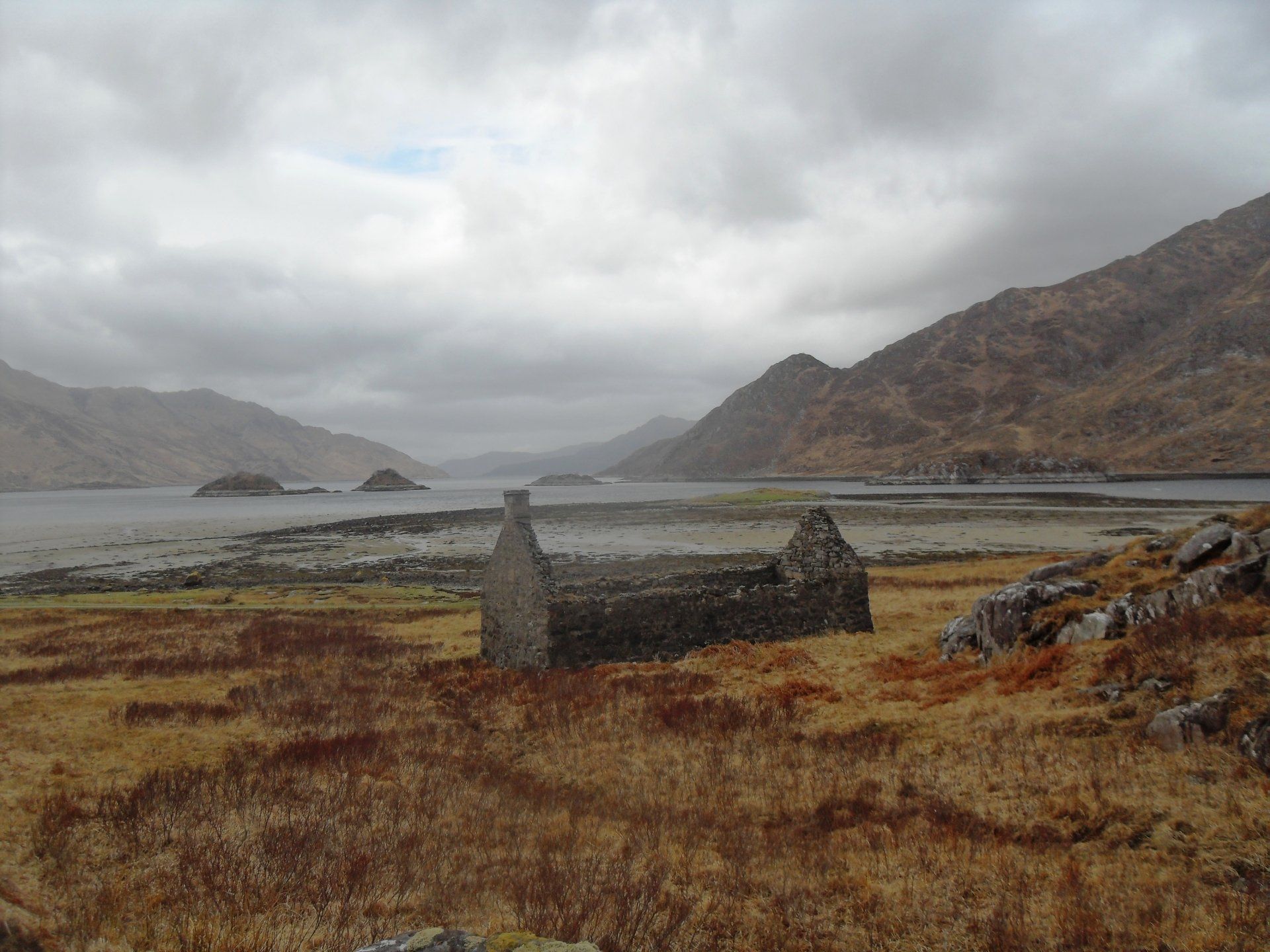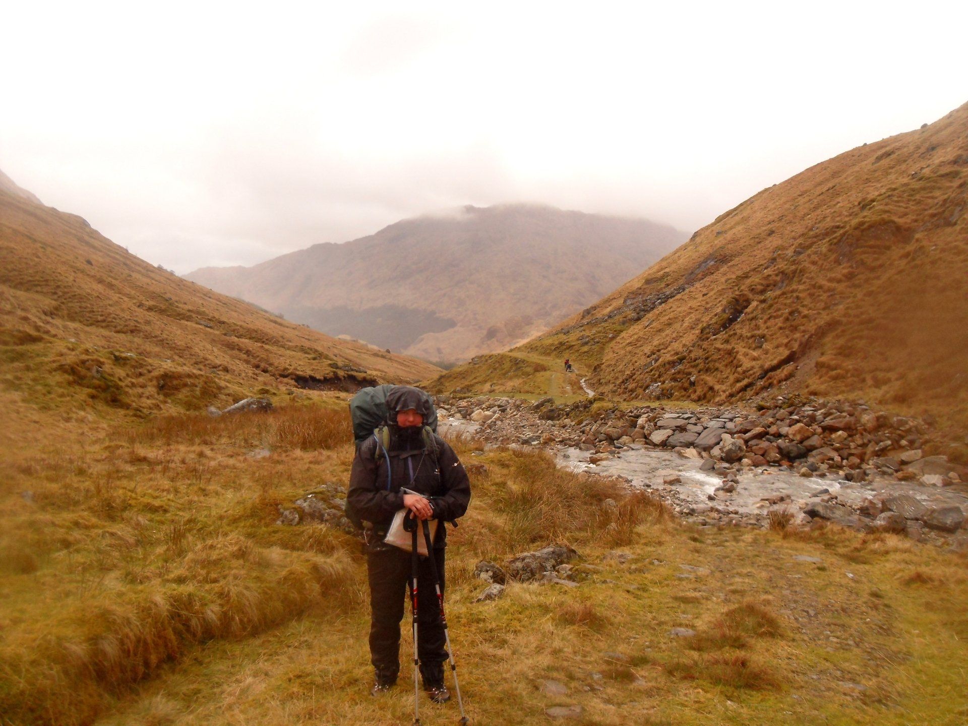Mein zweiter Wandertag führte mich hinauf zum Pass Mam Barisdale. Wolken und Nebel wechselten sich ab und obwohl es nicht regnete, konnte man nicht behaupten, dass es trocken war. Der Wind brachte viel Nässe mit. Bergauf lief ich stets ohne Jacke, doch sobald ich mich einer Bergkuppe näherte, holte ich die Regenjacke heraus, weil ich wusste, dass der Wind mich gleich voll erfassen würde. Die Schuhe konnte man schon seit dem Vortag nicht mehr trocken nennen, aber wenigstens die Socken waren es am Morgen gewesen. Ich hatte mir in der Bothy noch ein Fladenbrot gebacken und dieses wieder in den Alubeutel gesteckt, in dem die Backmischung gewesen war. So war es bei meiner Pause in einer alten Whisky-Destille noch warm und schmeckte wirklich gut.