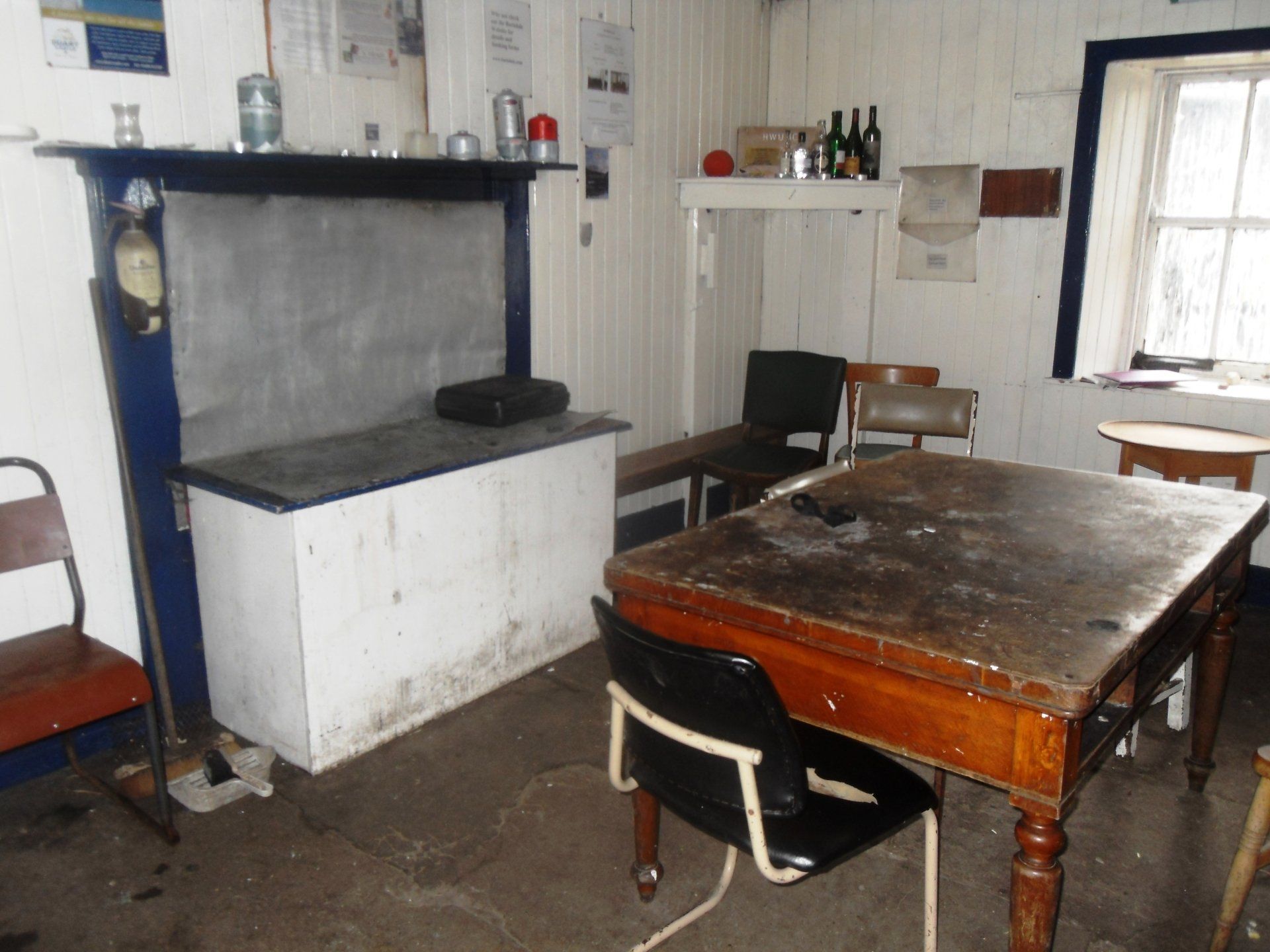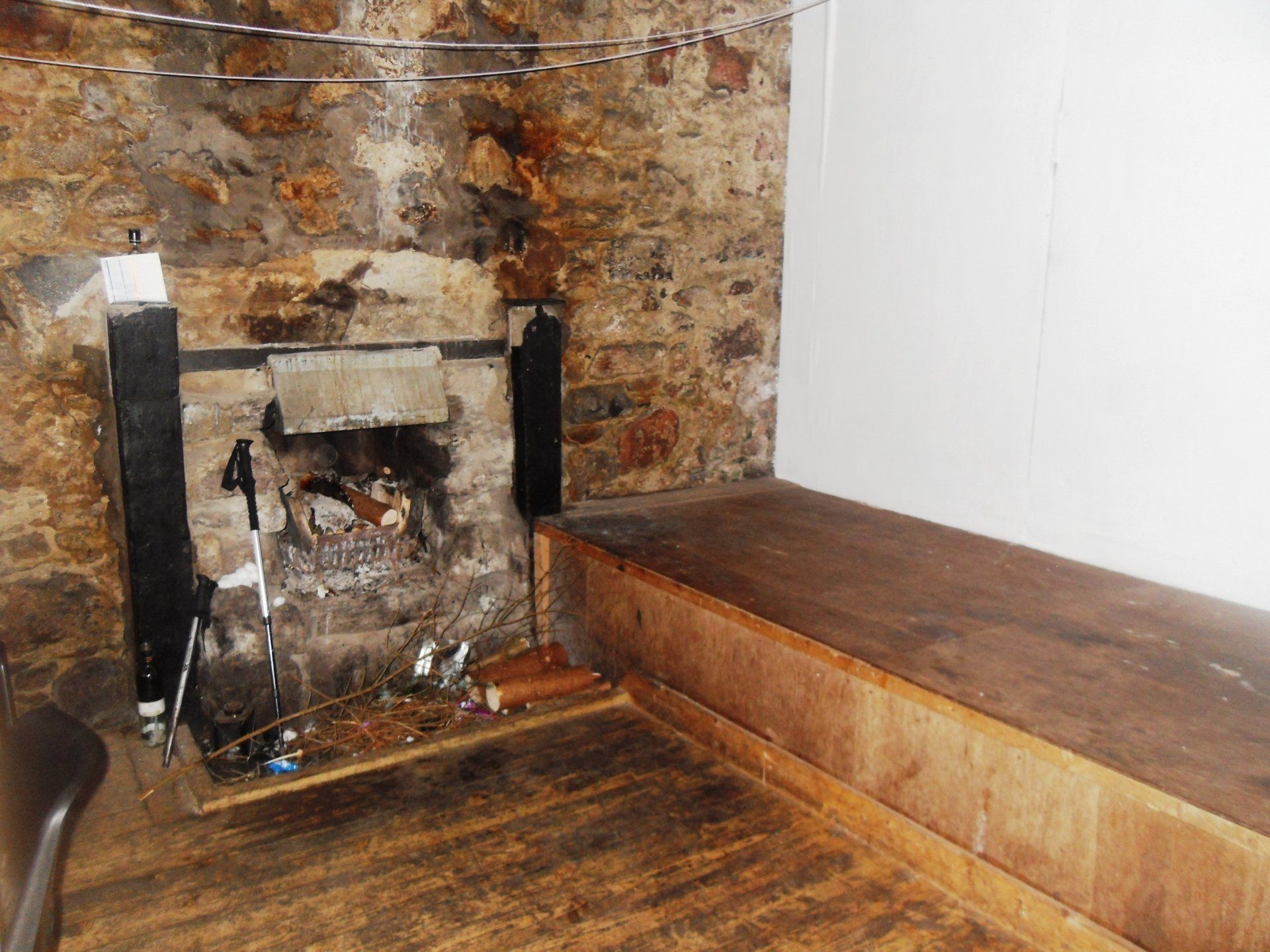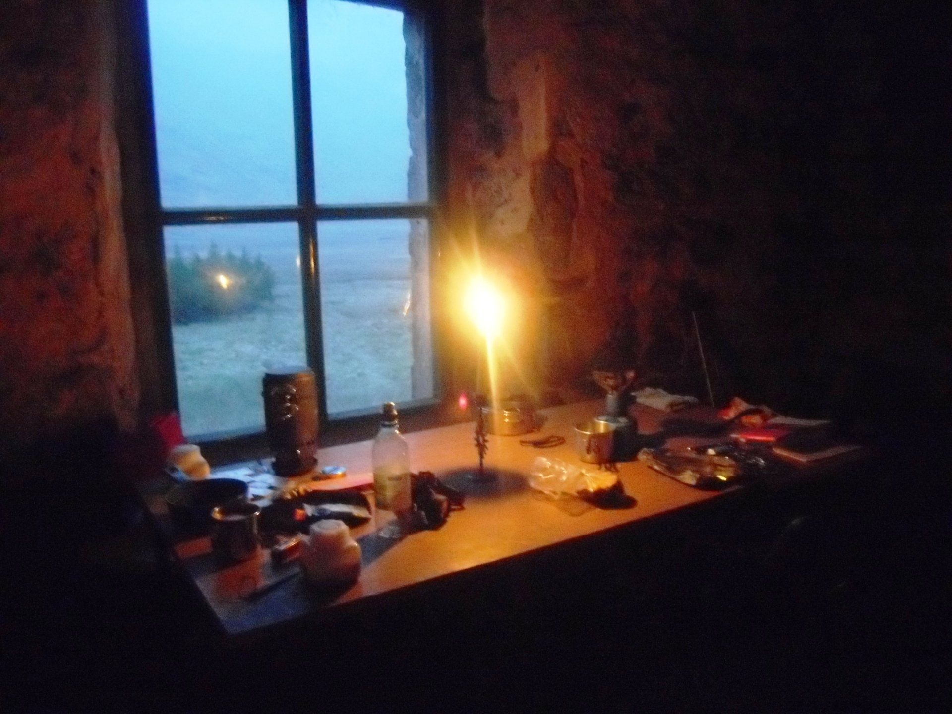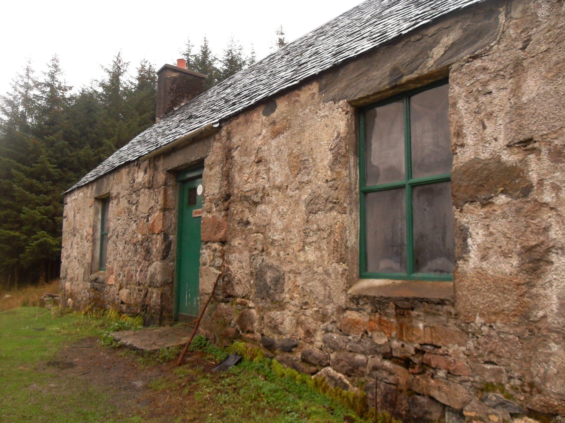 Die Bothy erreichte ich im Dämmerlicht kurz vor 20 Uhr. Der Weg verlief etwas oberhalb der Hütte und auf dem Pfad, der zur Bothy führte, fiel ich nochmal. Allerdings landete ich diesmal auf dem Allerwertesten. Beim Näherkommen hörte ich drinnen Männer grölen und gleich darauf - fröhliches Kinderlachen. Wie groß war da die Erleichterung! Die Tür machte mir wie üblich etwas zu schaffen, aber gerade als ich mich mit der Schulter dagegenwerfen wollte, wurde sie von innen geöffnet und ich fiel nicht nur buchstäblich mit der Tür ins Haus, sondern auch mit einem jungen Französen, der sie mir geöffnet hatte.