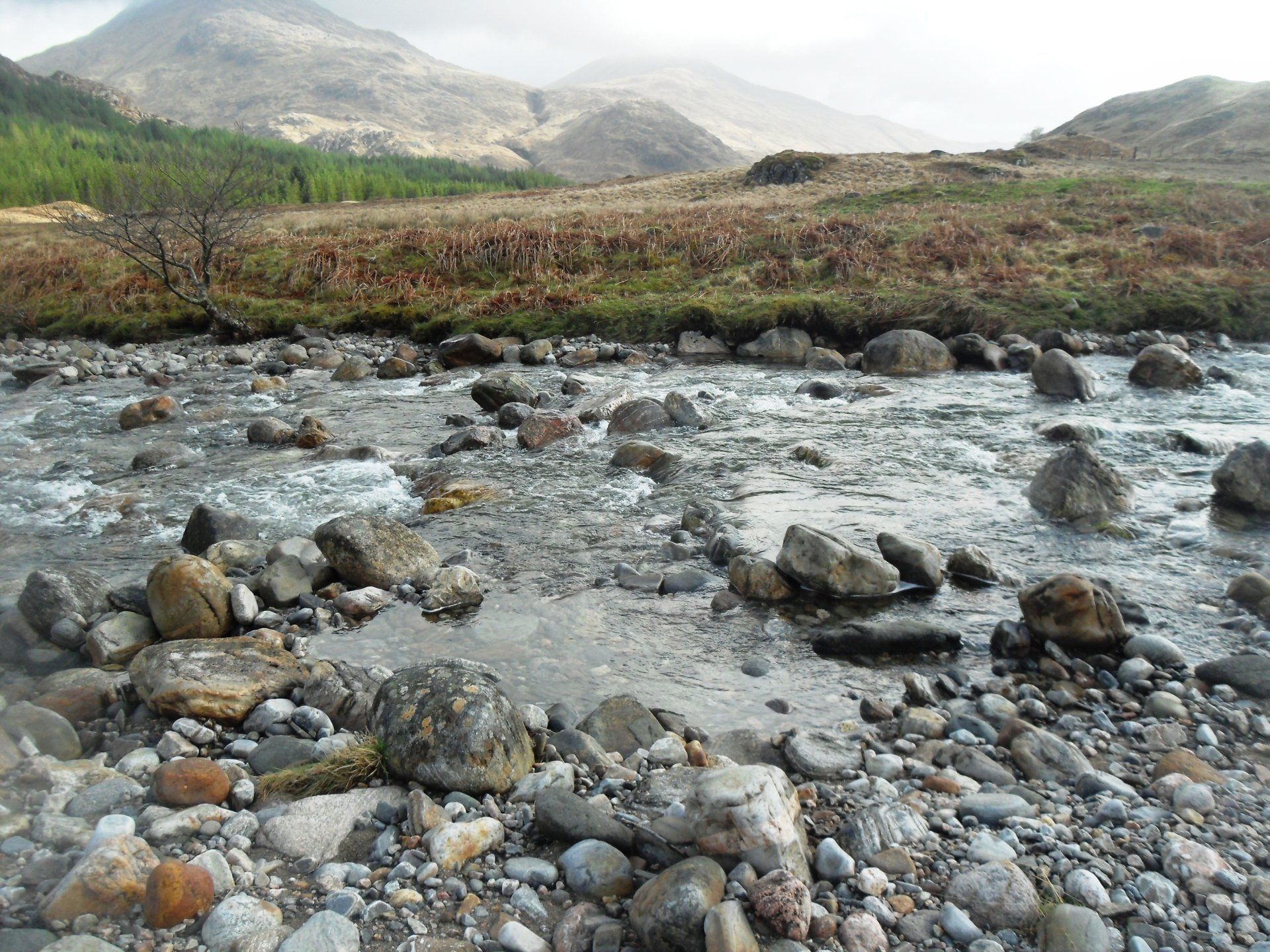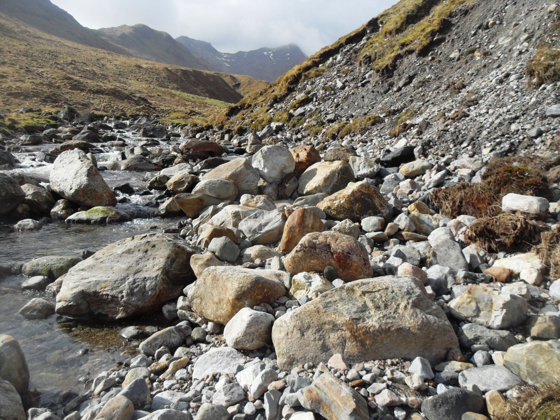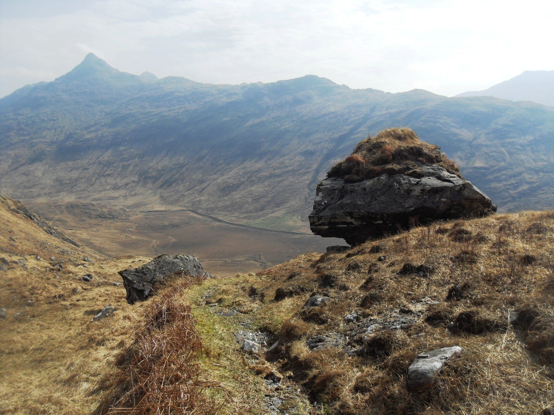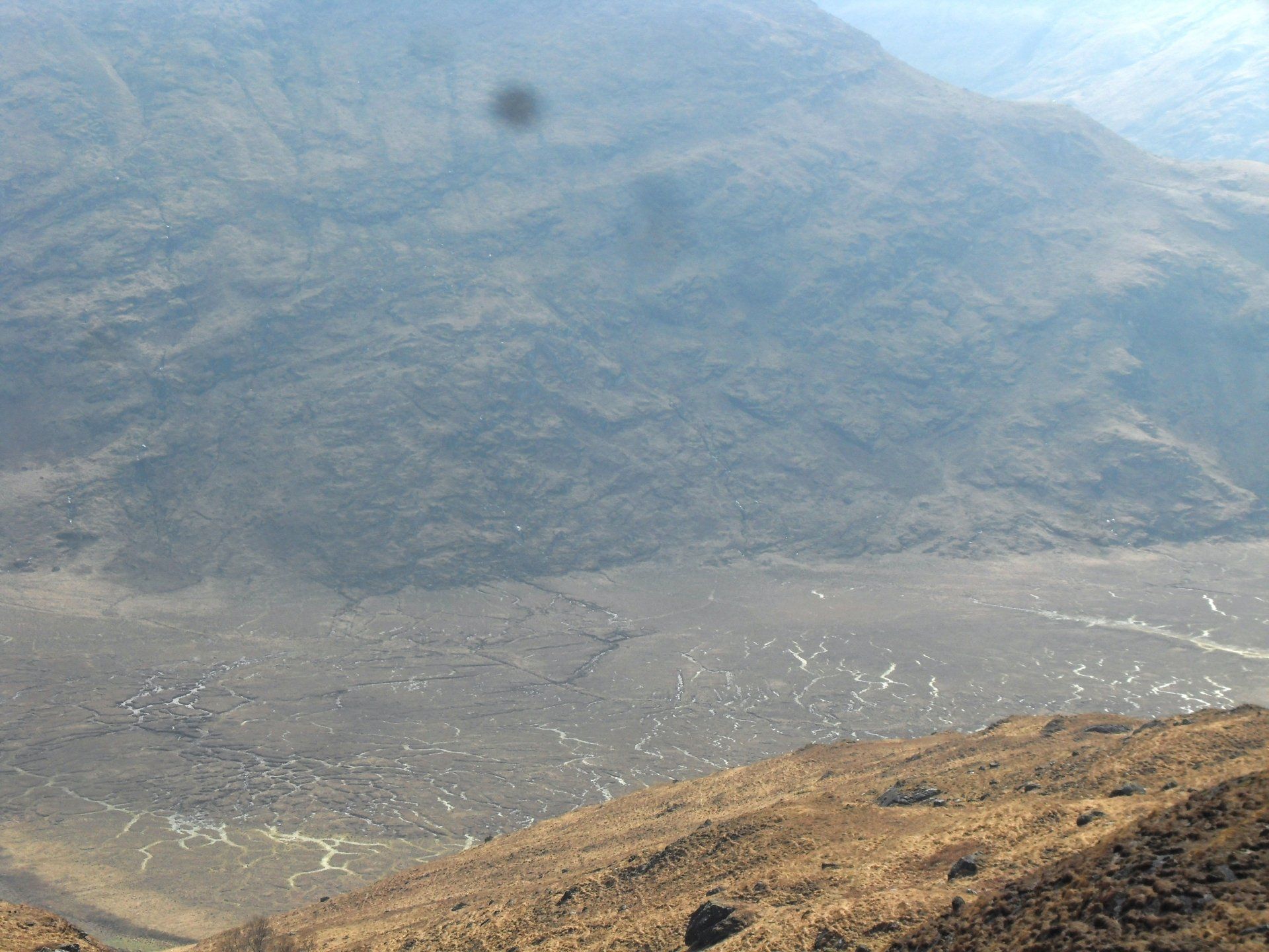 Ich war früh aufgebrochen, weil die Etappe als sehr schwer eingestuft war. Für die 14 km bis zur Sourlies Bothy hatte man eine Gehzeit von acht Stunden veranschlagt und auch die Folgeetappe des nächsten Tages war mit 14 km und sieben Stunden ausgeschrieben. Ich konnte mir nicht vorstellen, welche Schwierigkeit da auf mich warten würde. Für 14 Kilometer brauche ich normal, wenn ich mir viel Zeit lasse, maximal fünf Stunden. Über eine Stunde lang lief ich auf einen riesigen Felsbrocken am Grat des Berges zu, der den Pass markiert. Oben angekommen, konnte ich endlich sehen, was da vor mir lag - das Carnoch-River-Delta. Von oben sah es aus wie ein gigantisches Spinnennetz.