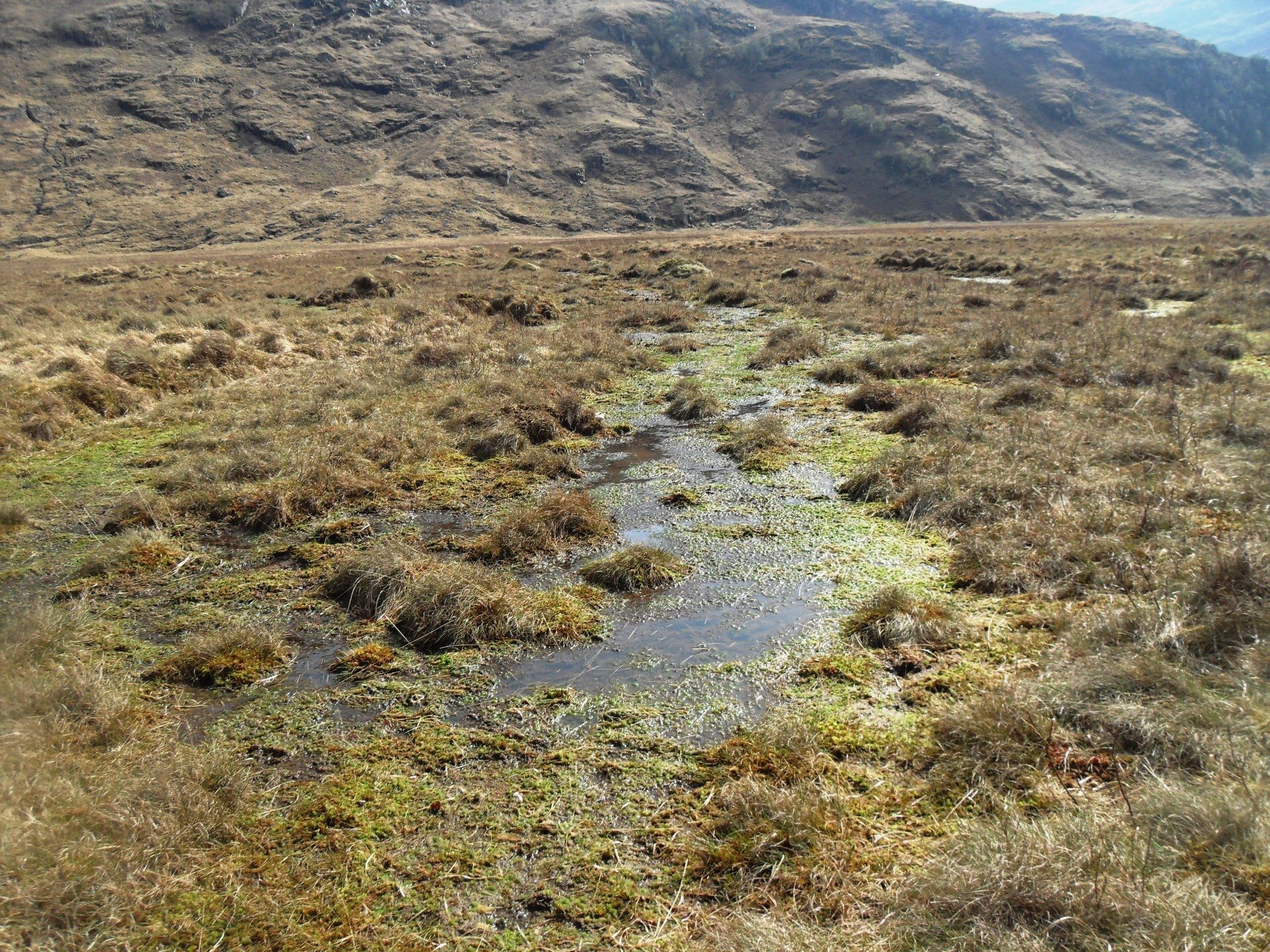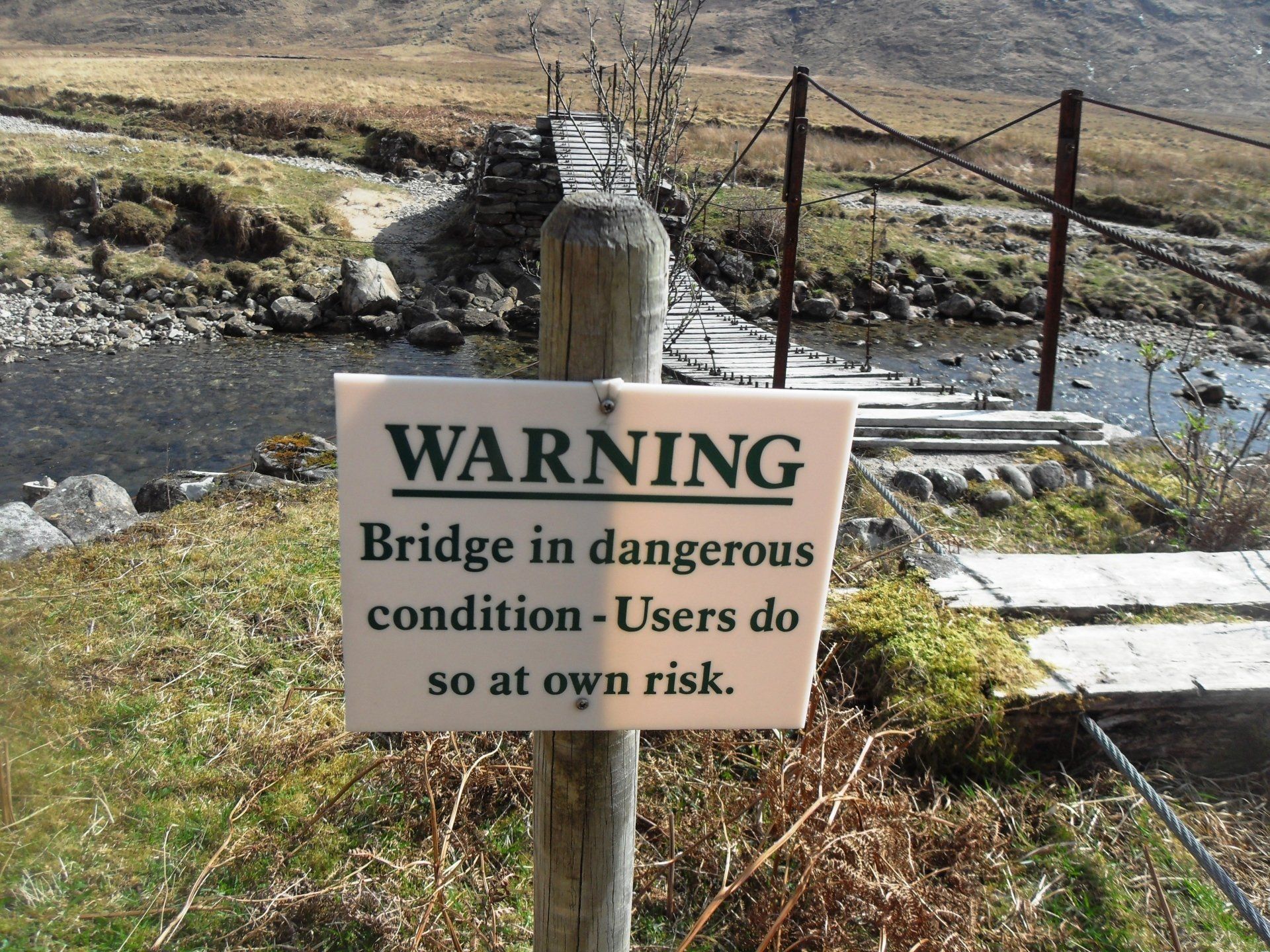 Schon seit einiger Zeit hatte ich mir die Hängebrücke mit ihrem Hinweisschild angesehen und überlegt, ob ich nicht lieber eine Furt durch den Carnoch River suchen sollte. Doch die Brücke stellte sich als das geringste Hindernis heraus. Für den Weg durch das Delta brauchte ich dagegen zwei Stunden - für 350 Meter! Als ich das geschafft hatte, stellte sich mir ein noch größeres Problem in den Weg, bzw. es saß vor der Sourlies Bothy. Vier Männer, nur mit Unterhose bekleidet, mit der Whisky-Flasche in der Hand und deutlichem Zungenschlag, der nicht vom Dialekt herrührte. Ich würde unter gar keinen Umständen die Nacht mit diesen vier Typen zusammen in der Bothy verbringen, die noch dazu komplett vermüllt war!