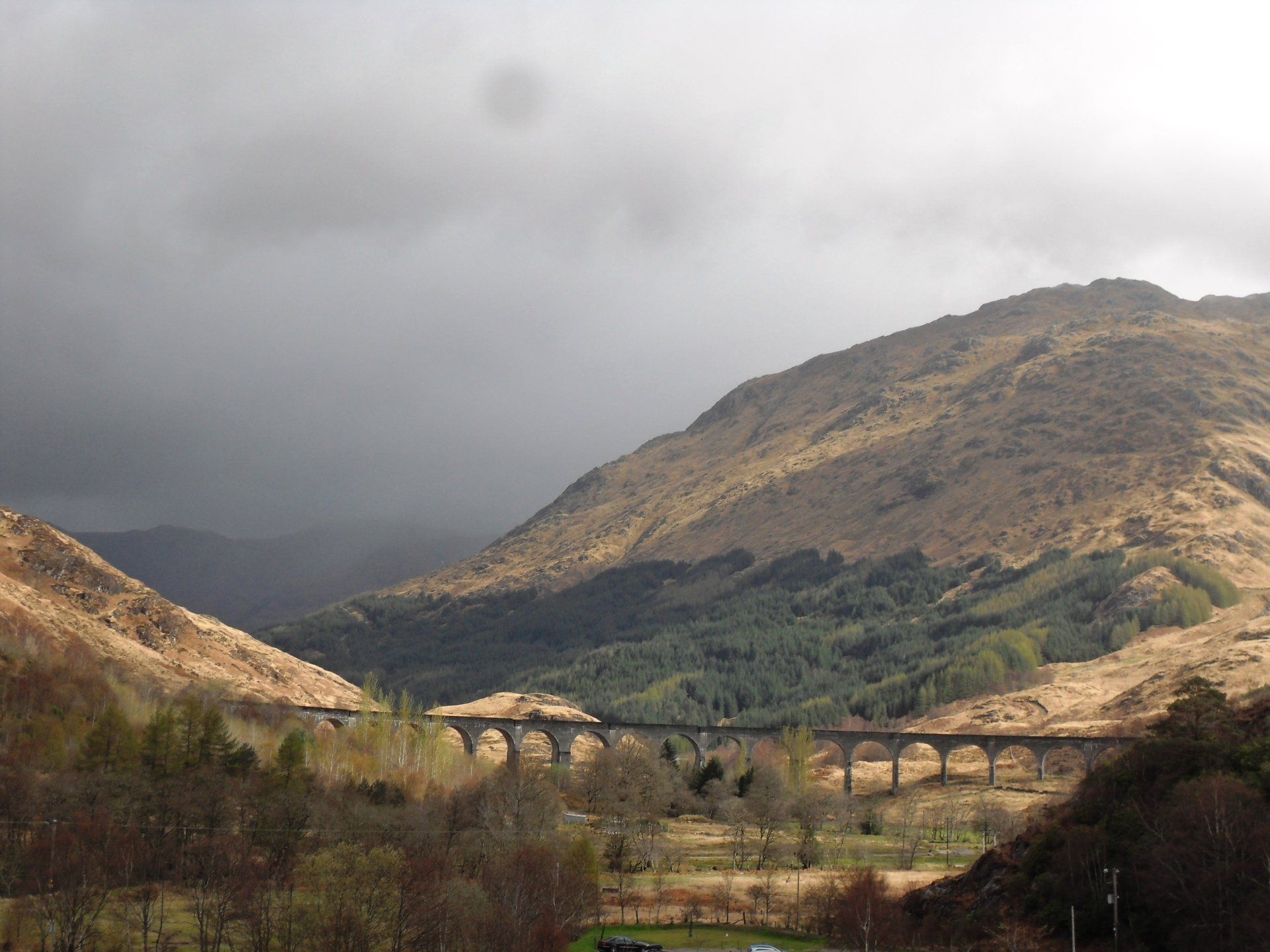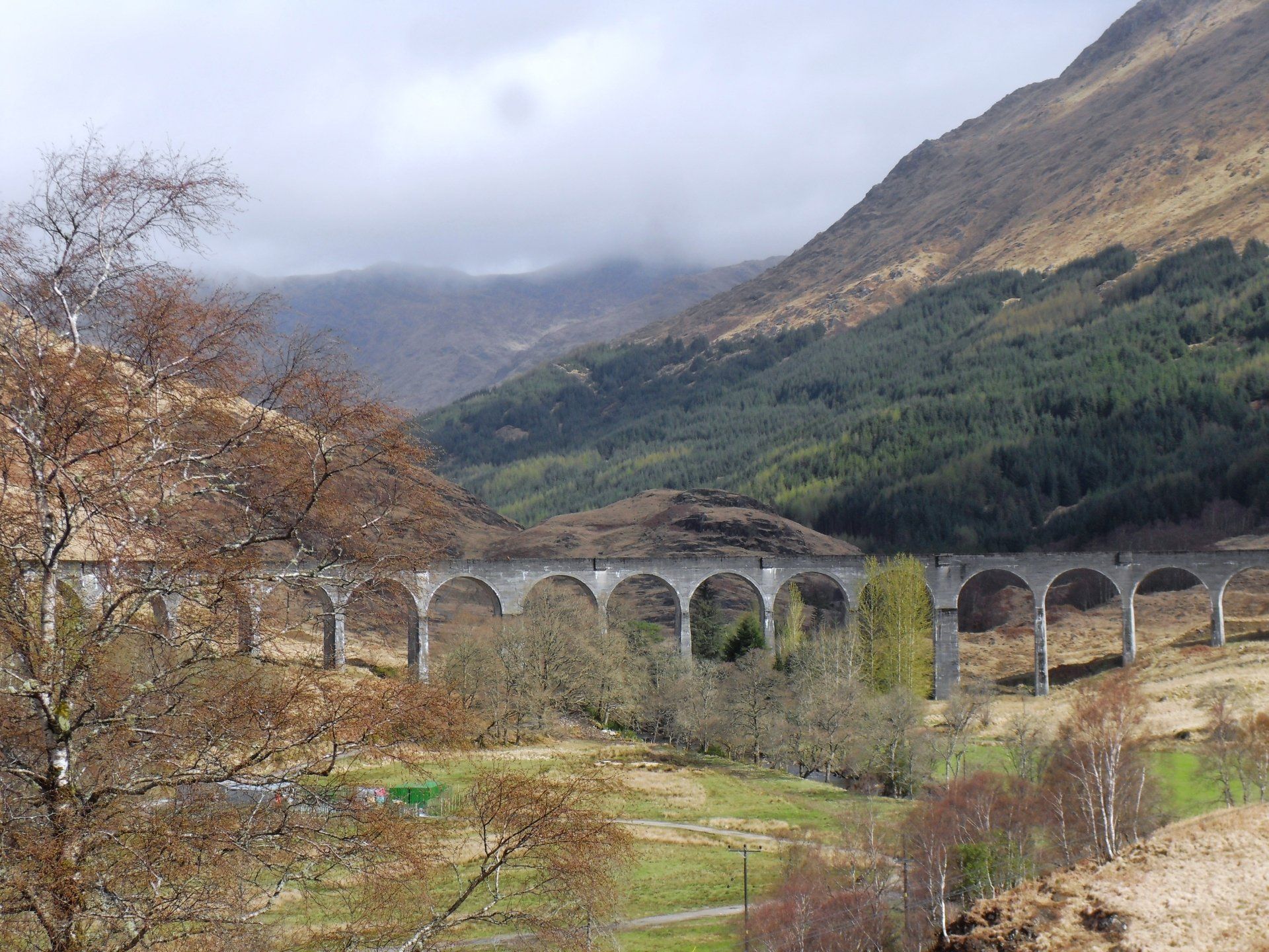 Am frühen Nachmittag erreichte ich eine Asphaltstraße und wanderte ab jetzt trockenen Fußes Richtung Glenfinnan. Kurz bevor ich das Dorf erreichte, führte mein Weg unter einem beeindruckenden Viadukt hindurch, das mir irgendwie bekannt vorkam. Ich studierte die Info-Tafel und erfuhr nicht nur, woher ich das Viadukt kannte, sondern auch, wer am Loch Shiel wohnt. Wir wissen ja schon: am Loch Hourn wohnt der Teufel, am Loch Nevis Gott und am Loch Shiel wohnt Harry Potter. Über das Viadukt fährt der Hogwarts Express und das fiktive Schloss Hogwarts steht - zumindest im Film - am Loch Shiel. Alles, was die Dreharbeiten jedoch auf der Wiese am Ufer dort übriggelassen haben, sind die Stangen, die das Quidditch-Feld markieren.