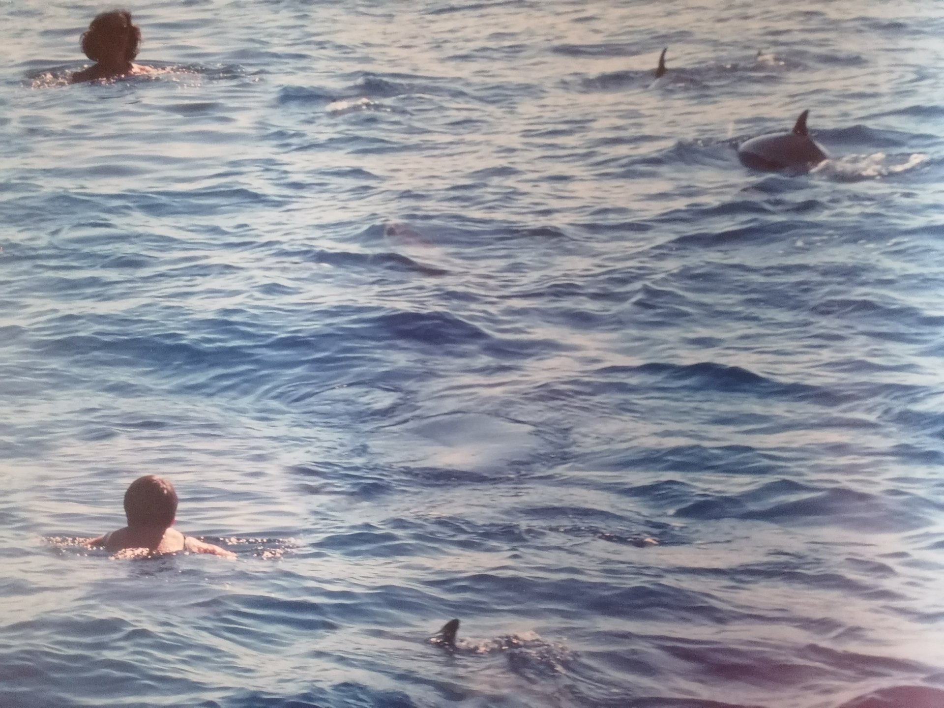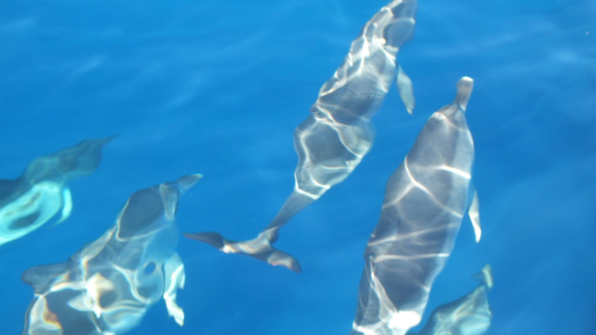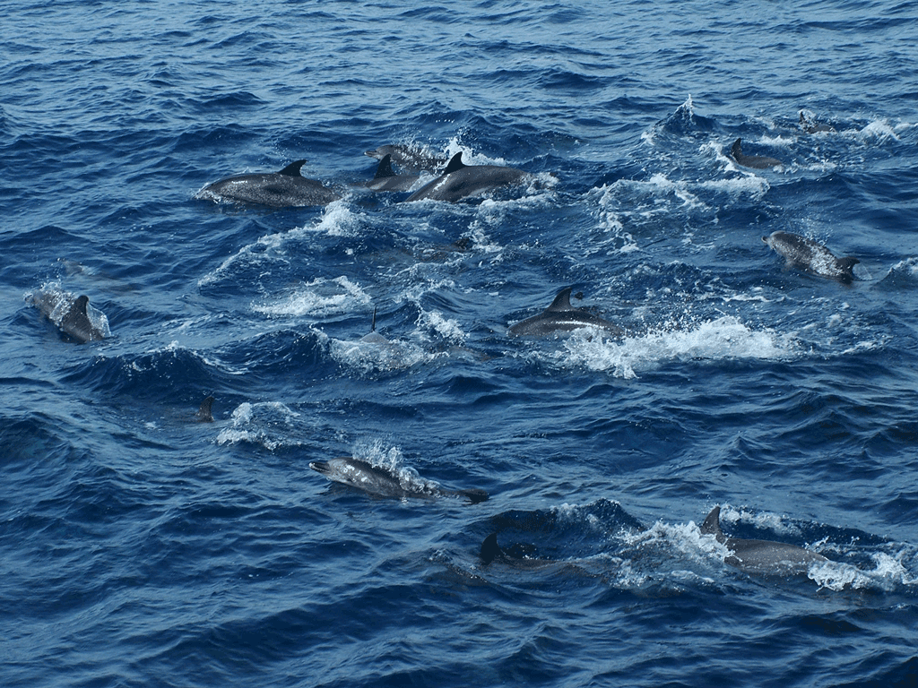 Nach der Mittagspause werden wir dann doch noch fündig. Es ist aber kein Wal, den wir entdecken, sonder ein Delfin. Und es soll nicht bei einem bleiben! Der freche Racker führt uns geraden Wegs zu seiner Familie. Und ehe wir uns umschauen, befinden wir uns inmitten einer Schule von rund 200 Tüpfeldelfinen. Wir fahren über eine Stunde lang mit den Delfinen mit und es ist ein überwältigendes Erlebnis.