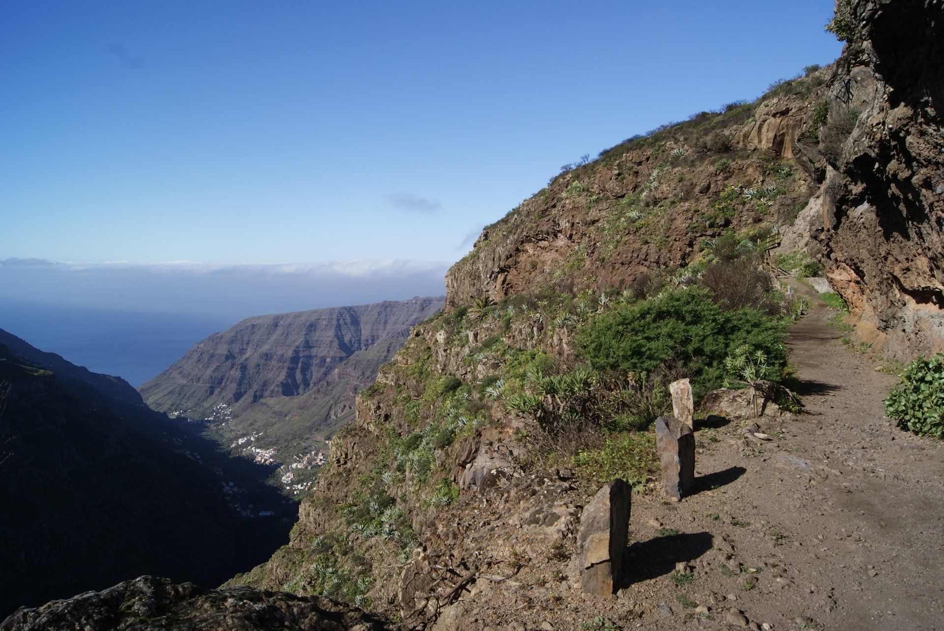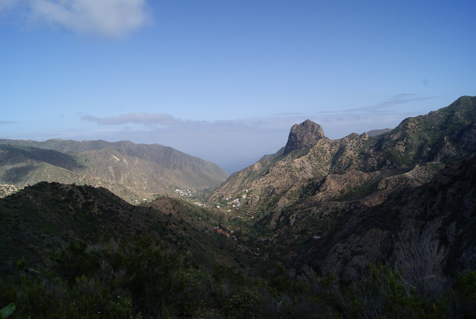 Nach drei Stunden weiß ich bereits, warum man nicht von Nord nach Süd-Ost gehen sollte! Es ist steil! So steil! Und kein Ende in Sicht! Aber wunderschön! Vor allem der Rückblick auf Vallehermoso mit dem alles beherrschenden Roque Cano.