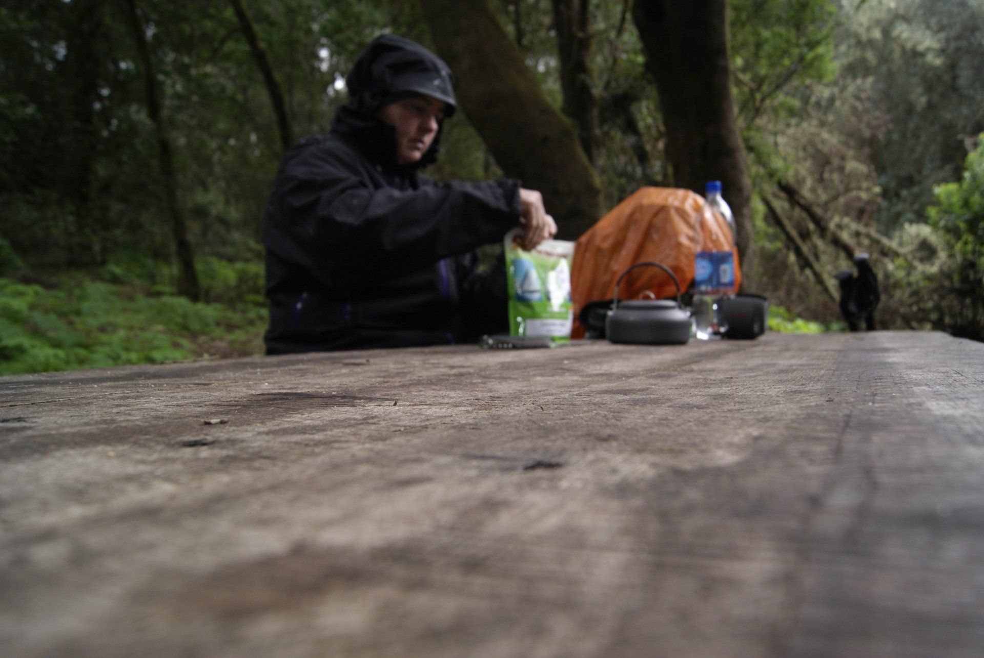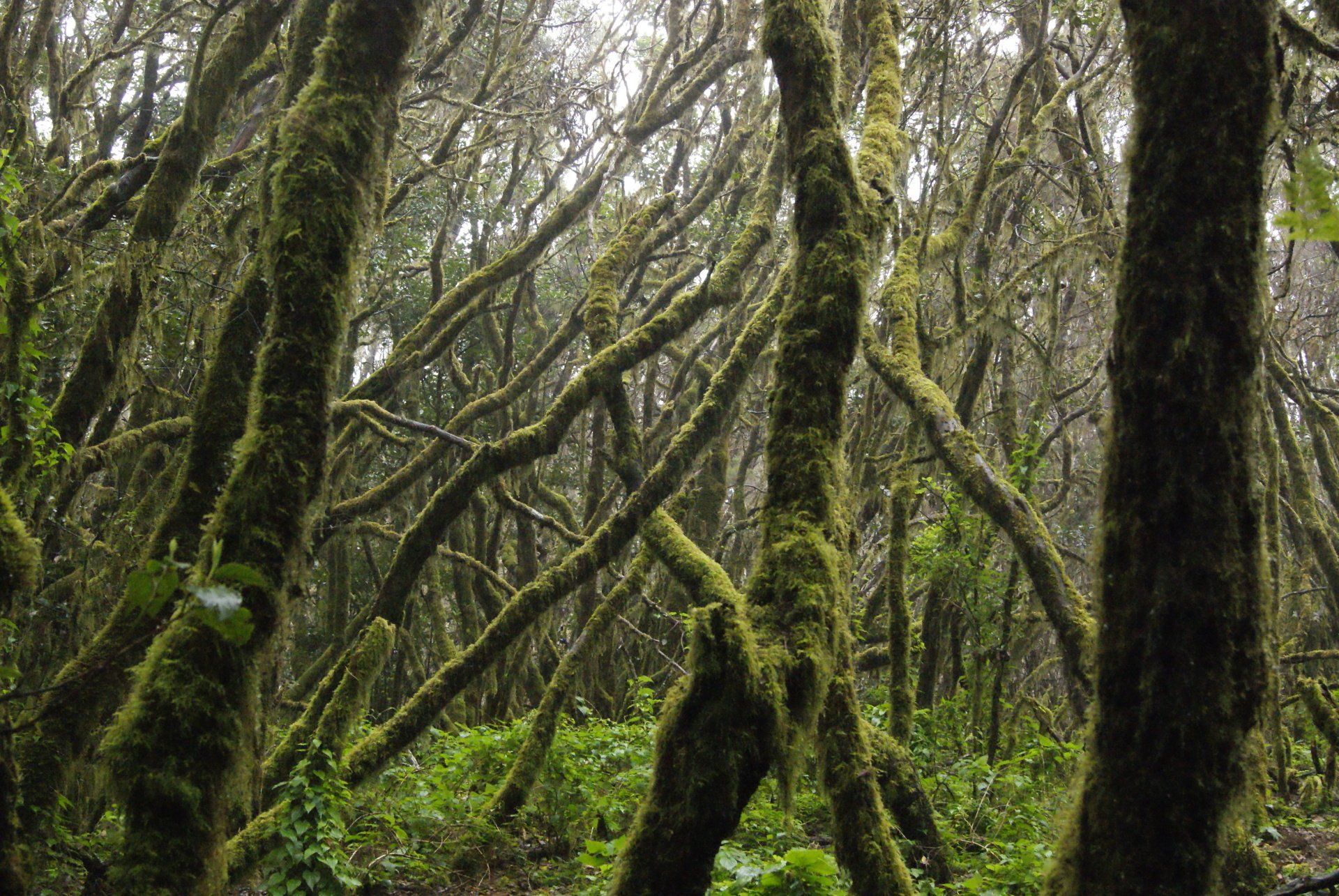 Am frühen Nachmittag schieben sich erste Wolken in den bis dahin strahlend blauen Himmel. Den Wegweisern nach zu schließen, habe ich erst 6 bis 7 km geschafft. Ich nähere mich jetzt der Baumgrenze, aber im Gegensatz zu den Alpen, wo es mit zunehmender Höhe immer weniger Bäume gibt, fängt hier die Vegetation erst richtig an. Ich wandere direkt in die Wolken hinein und es wird kälter. Im Lorbeerwald verstecke ich mich vor Wolken, Wind und Regen und koche Kaffee und Couscous. Es ist 16:00 Uhr, ich bin seit fünfeinhalb Stunden unterwegs und habe lt. Wegweisern 7,6 km zurückgelegt. 7,6 km in 5,5 Stunden!!!! Aber seit 5 Minuten geht es bergab und in 2,4 km müsste ich Las Hayas erreichen. Ich werde dort mein Zelt aufstellen und keinen Schritt mehr weitergehen!