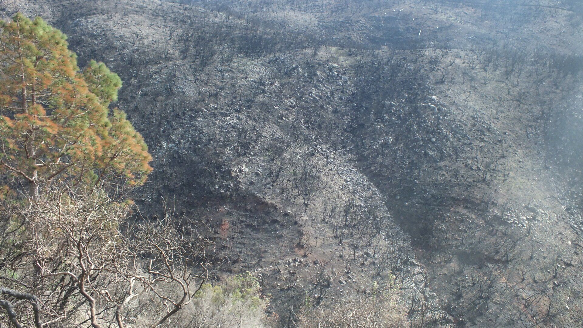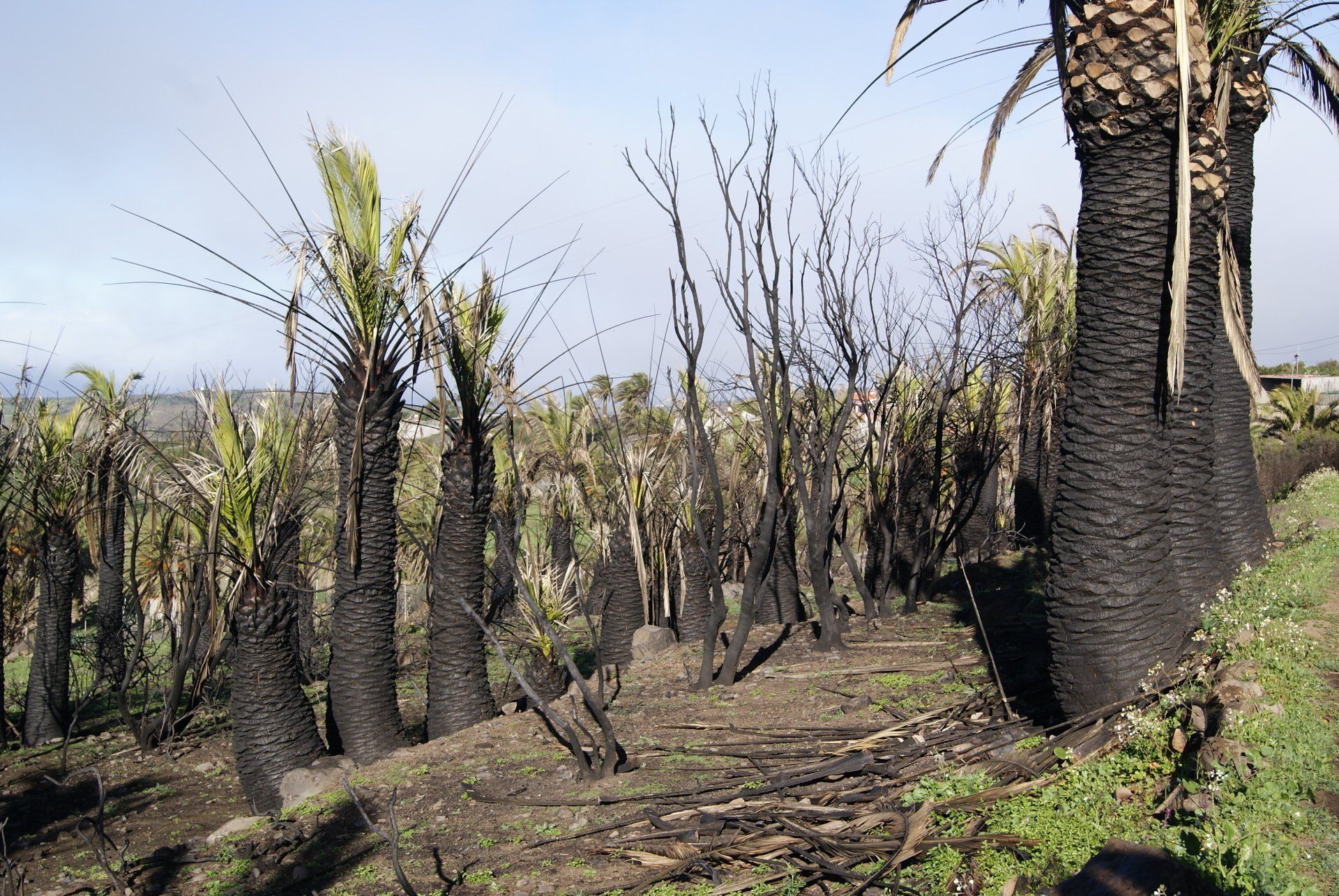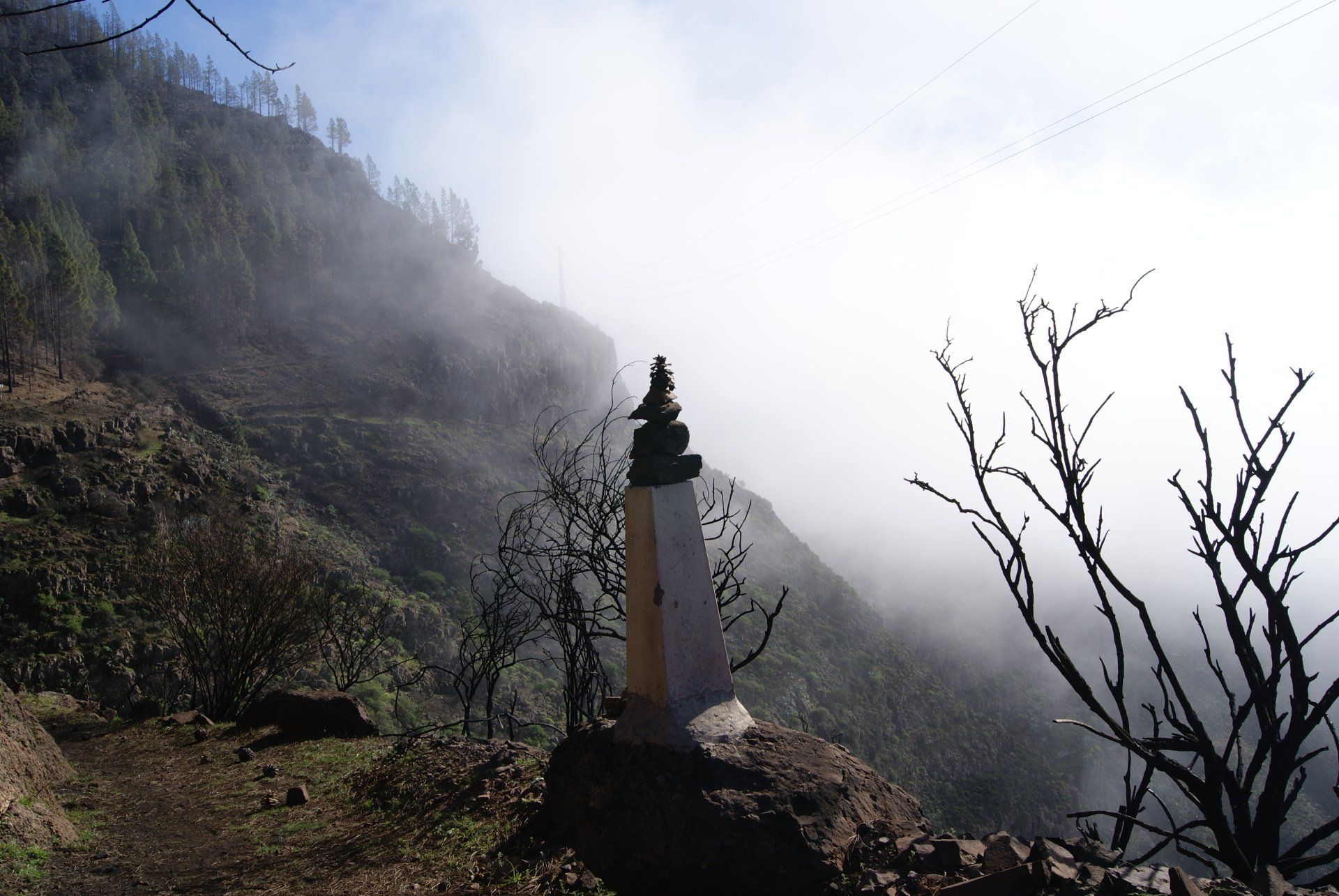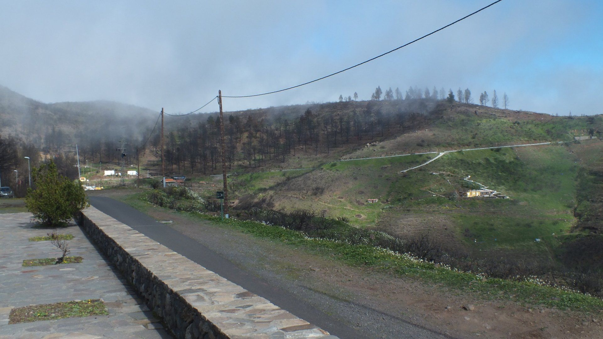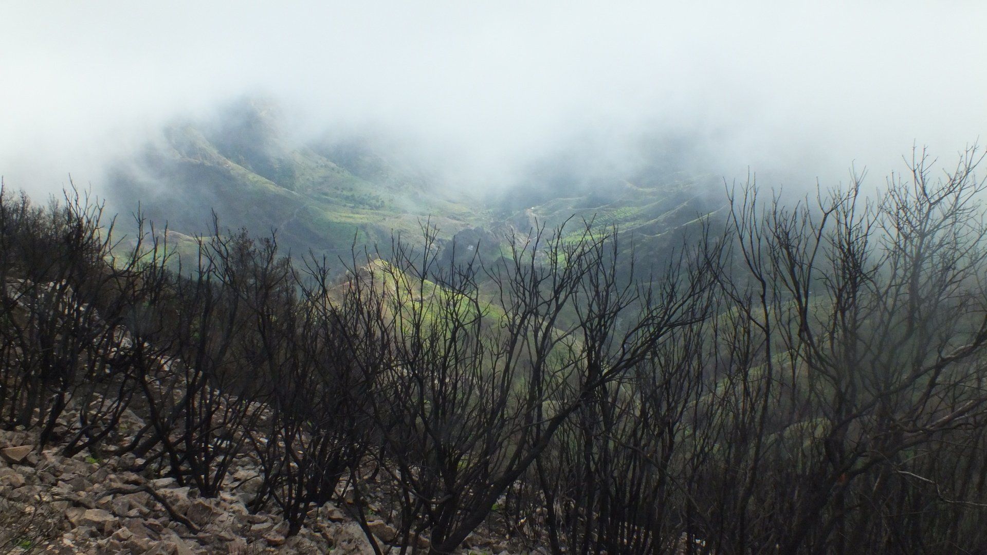 Der Himmel ist wieder strahlend blau und vom Sturm nichts mehr zu spüren. Ich packe mein Zeug zusammen und verlasse Las Hayas Richtung El Cercado. Bereits im Dorf treffe ich auf erste Anzeichen der Brände, die im vergangenen August und September wochenlang hier wüteten. Zum Glück hat das Feuer diesmal keine Menschenleben gefordert, wie der letzte große Brand auf Gomera. 1984 wurden 24 Feuerwehrleute aus Teneriffa vom Feuer eingeschlossen und zahlten ihren Einsatz mit dem Leben.