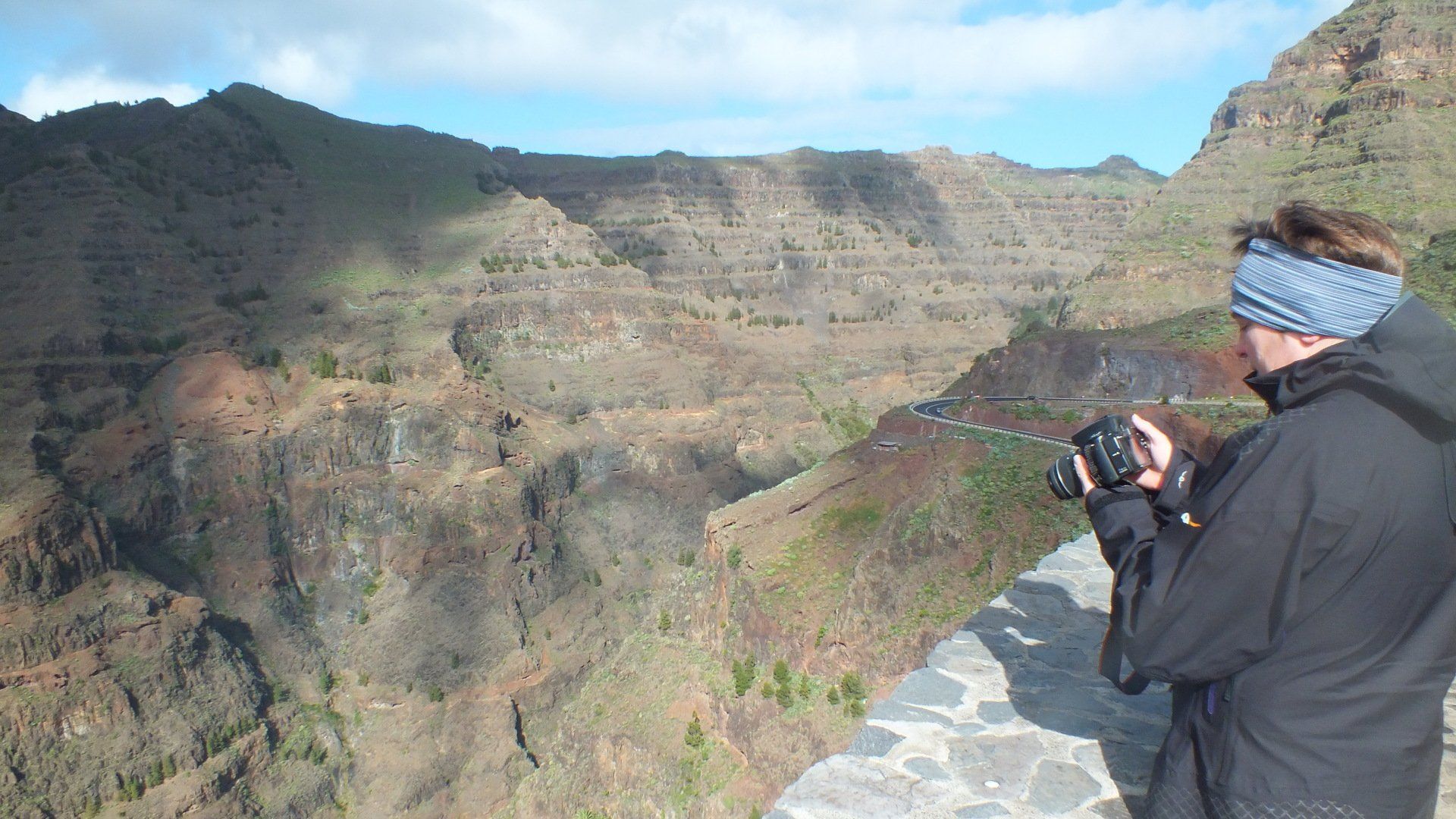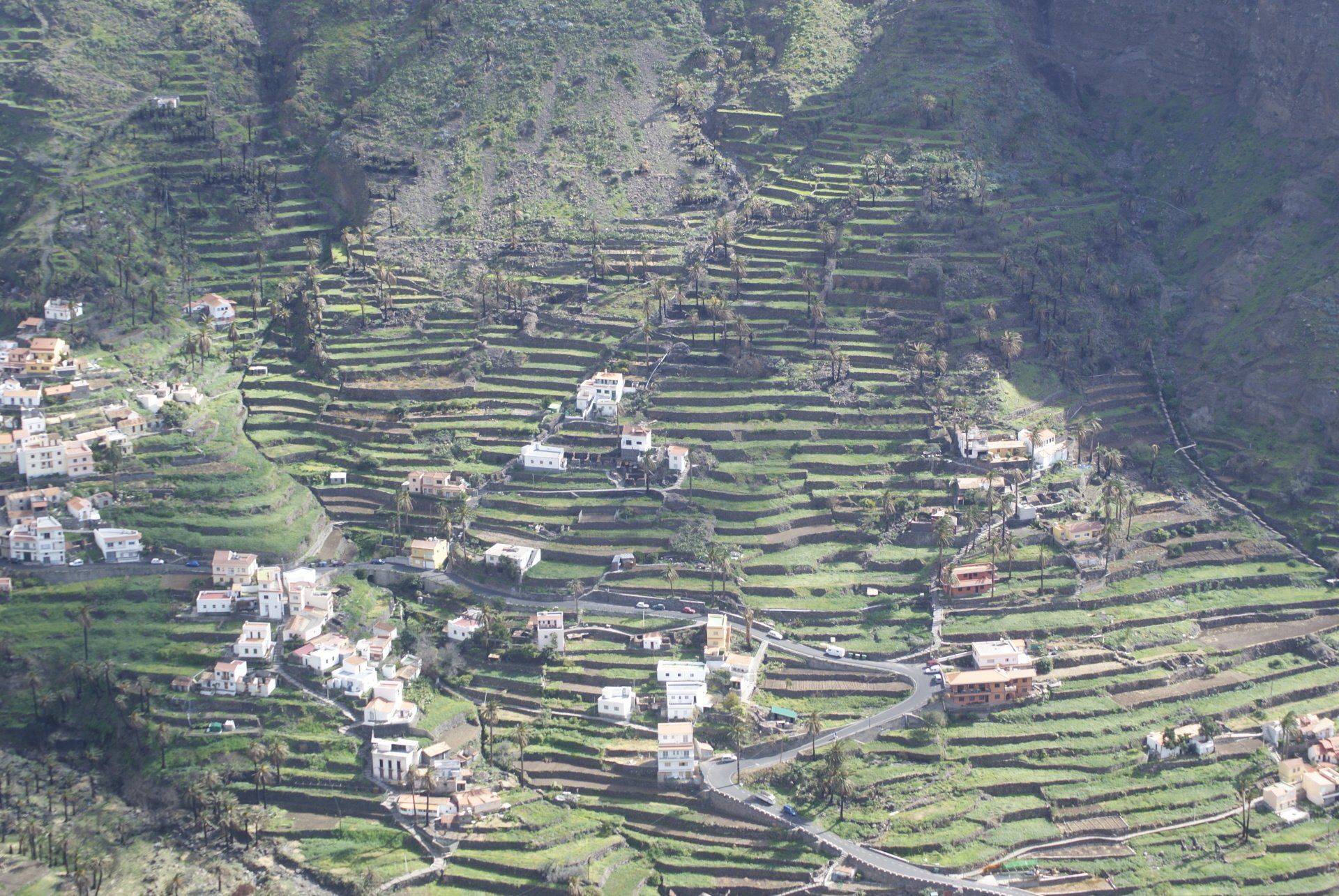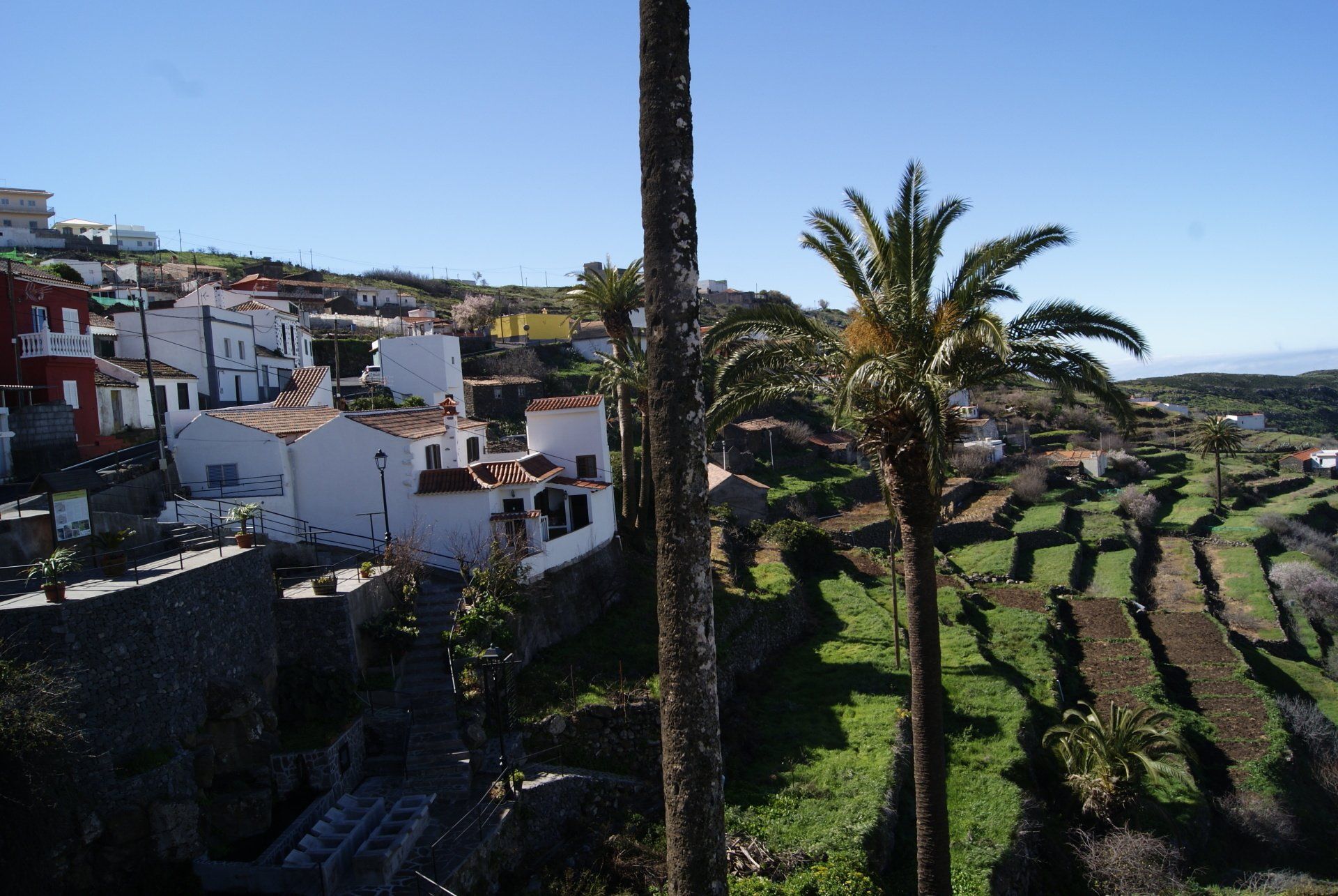 In der Nacht hat es geregnet und gestürmt und richtig viel Sonne sehen wir jetzt auch noch nicht. Wir verschieben daher die Wanderung durch die Rote Wand und fahren stattdessen ins Valle Gran Rey. In Vizkaina im oberen Tal treffen wir auf eine regelrechte Kulturlandschaft aus Terrassenfeldern. Hier ist von den Auswirkungen der Brände nicht mehr viel zu sehen, hat es doch im November und Anfang Dezember ausgiebig geregnet. Wir wollen zum Hafen und ich bin, angesichts der vielen Serpentinen froh, dass die Bremsen offenbar gut funktionieren.
