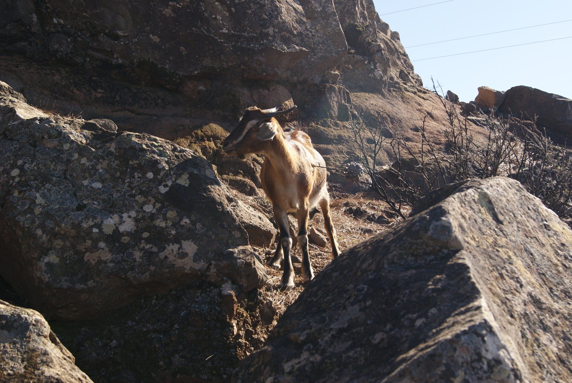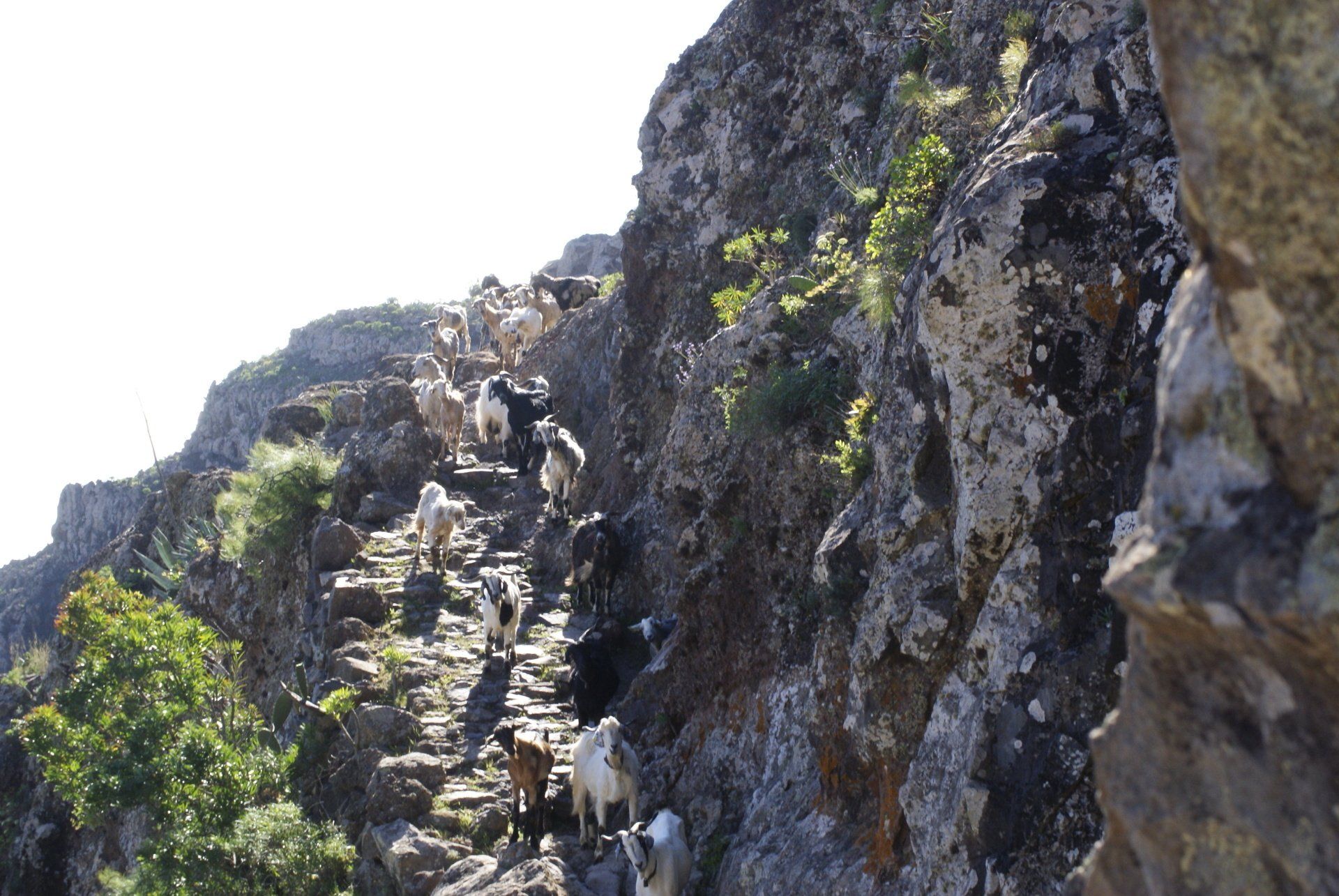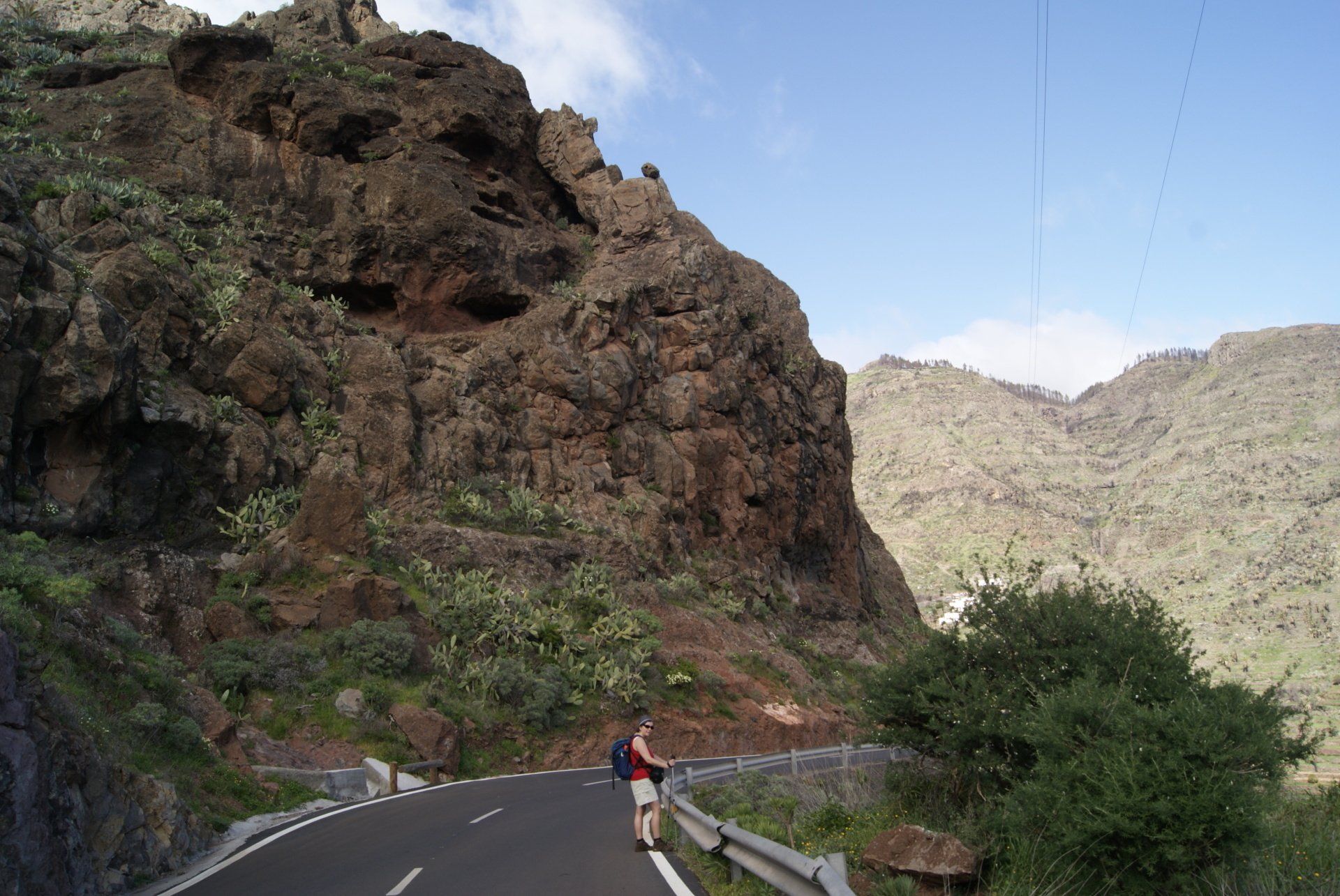 Kurz darauf haben wir nochmal Gegenverkehr einer anderen Art! Ich hätte die Herde Ziegen ja vorbeigelassen, aber Claudia muss sich unbedingt als Gomera-Heidi betätigen. Also dreht die ganze Herde um und geht die Stufen wieder nach oben. Droben in Alajeró verbringen wir unsere Mittagspause in einem Bushäuschen und verdrücken die Reste unseres gestrigen Abendessens. Es folgt ein unspektakuläres Wegstück an der Straße entlang, das wir aber recht zügig hinter uns bringen. Die Kehren der Straße kürzen wir über Pfade ab.