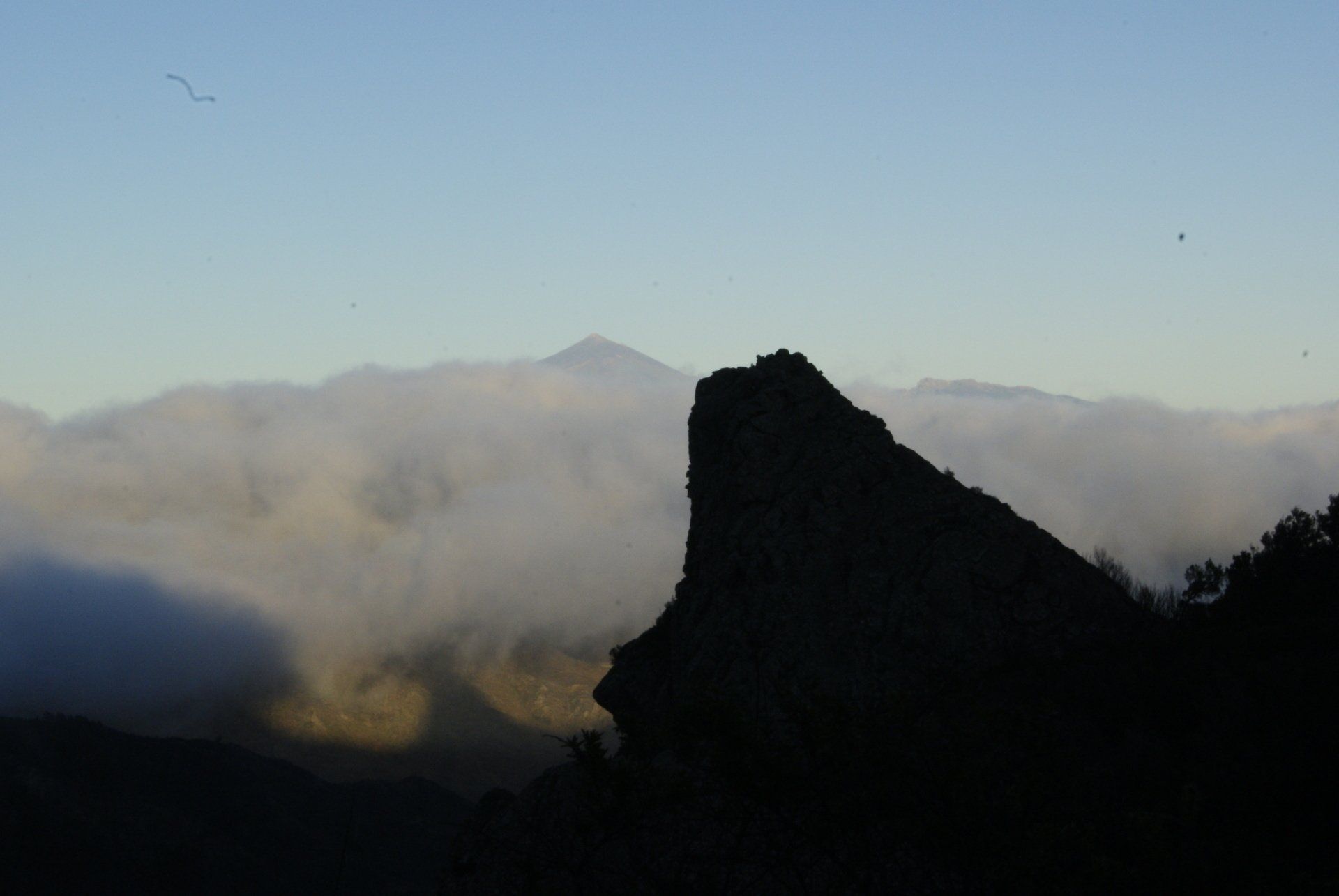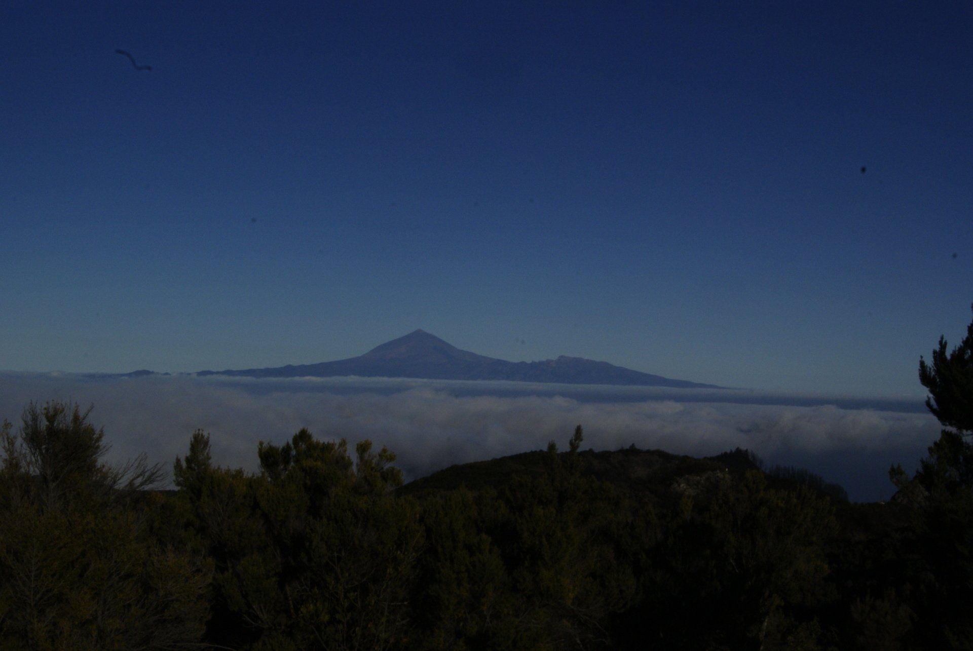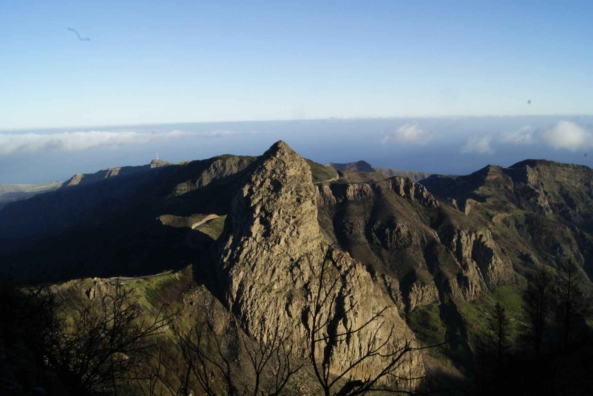 Gegen 16:15 Uhr erreiche ich den Mirador de Igualero am Fuße des Garajonay, des höchsten Berges La Gomeras, mit Blick auf Spaniens höchsten Berg, den Teide auf Teneriffa. Ich bin unschlüssig wie es nun weitergehen soll. Der GR 131 führt über den Gipfel des Garajonay auf 1487 m, dann weiter über den Parkplatz "El Pajarito" - Das Vögelchen - bis zur Degollada de Peraza. Dort gibt es ein Restaurant, einen Aussichtspunkt, eine Bushaltestelle und das Denkmal des Despoten Hernan Peraza. Aber kein Bett! Ich will ja aber auch zelten! Oder? Ich bin mir da im Augenblick nicht ganz sicher. Ein Bett wäre schon auch was Feines! Und ein Bad! Und ein Bier! Und keine verbrannte Erde rundherum!