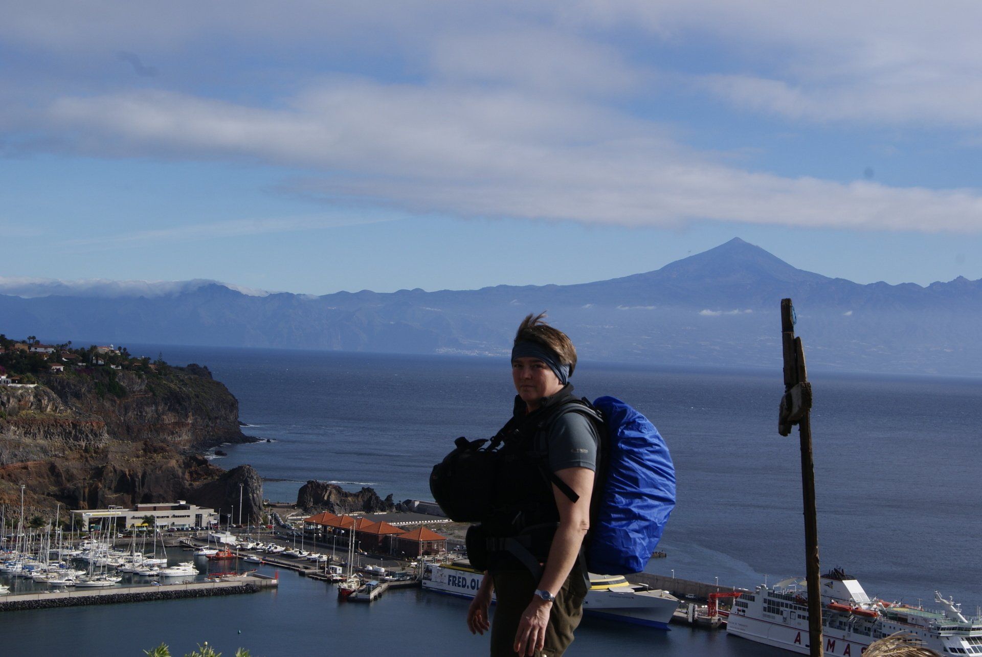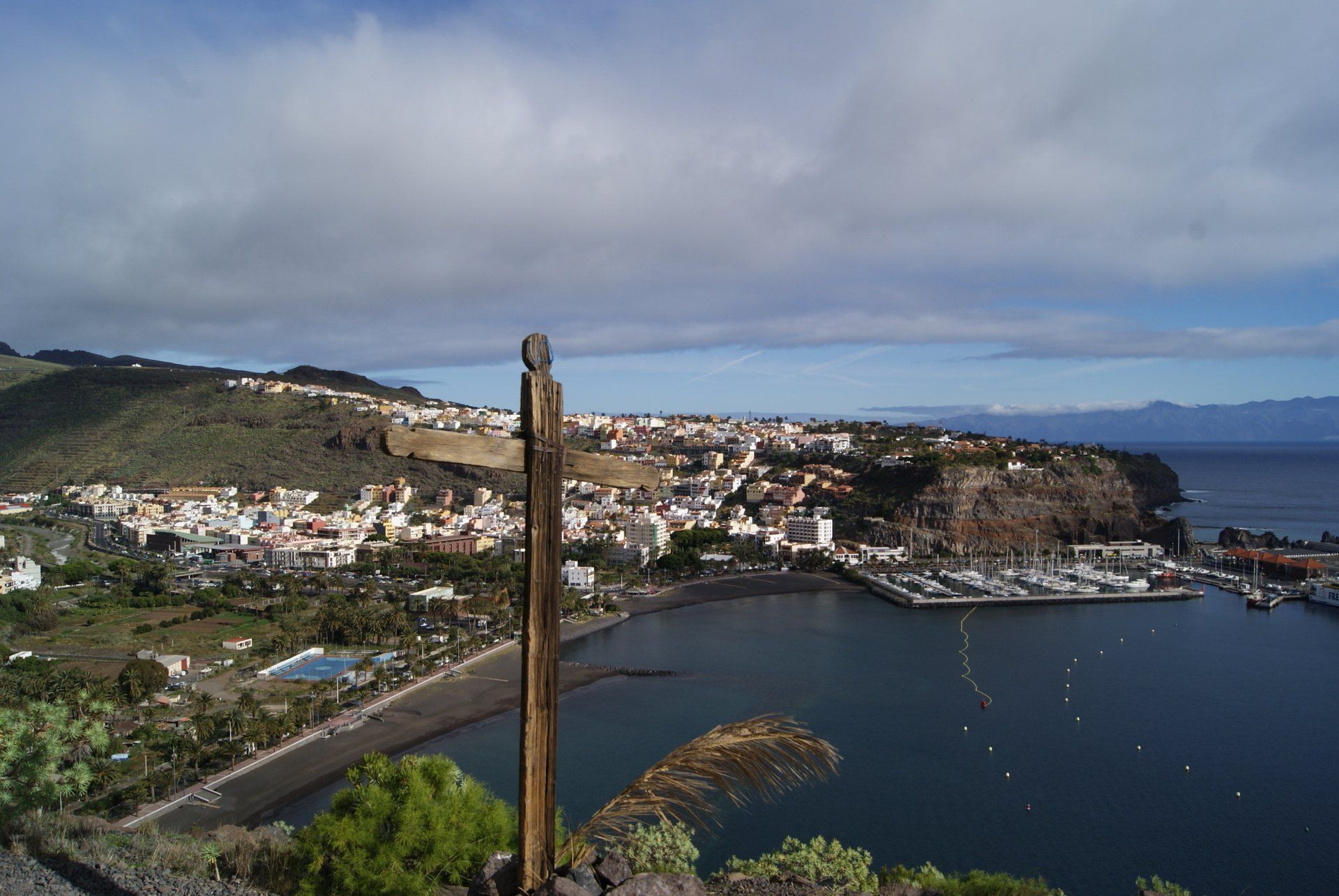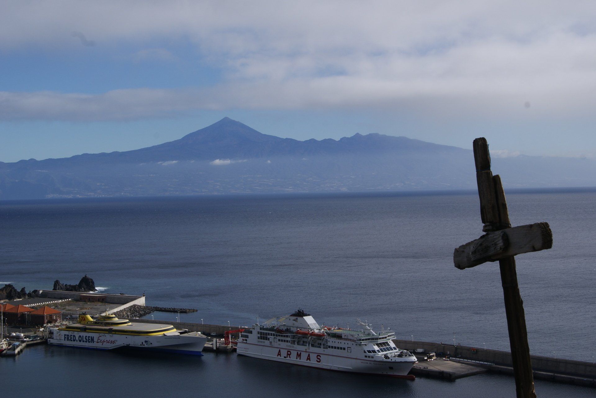 Der Weg führt hinauf auf den Kalvarienberg, von dem man einen herrlichen Blick auf die Stadt, den Hafen mit den beiden Fähren und den Teide auf Teneriffa hat. Unterwegs erhalte ich weitere Nachrichten von Claudia: "Flieger wieder auf dem Weg zur Startbahn" und schließlich "Start steht unmittelbar bevor!" Dann kann ja nichts mehr schief gehen.
