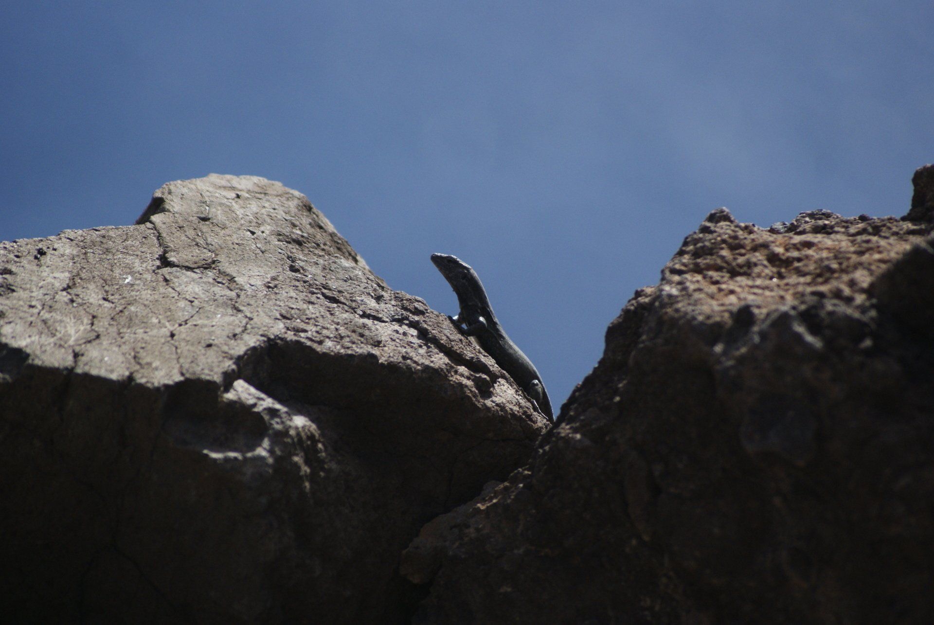 Als ich den ersten Anstieg hinter mir habe, entwickelt sich die Wanderung eher zu einem gemütlichen Spaziergang und ich genieße es. Dazu trägt auch der leichte Rucksack bei. Ich habe nämlich vom Gurt des großen Rucksacks tennisballgroße Schwellungen auf den Hüftknochen. Hoch über der Playa de Guancha finde ich zwischen Felsbrocken eingeklemmt einen Balken, der sich hervorragend als Sitzgelegenheit für meine Mittagspause eignet. Ich spare mir den beschwerlichen Abstieg zum Strand, und somit auch den noch beschwerlicheren Aufstieg wieder zurück, und packe meine Küche aus. Heute gibt es Milchreis mit Apfel und Zimt. Während ich "koche" kommen drei Spanier und sehen verwundert meinem Treiben zu. Sie bleiben aber nicht lange, sondern treten bald den Rückzug an. Dafür erscheinen andere, vierbeinige Gestalten zwischen den warmen Steinen und schauen nach, ob von meinem Mittagstisch vielleicht die eine oder andere Kostbarkeit abfällt. Obwohl die Echsen sehr neugierig sind, dauert es sehr lange, bis ich ein Exemplar vor die Linse bekomme. Bei jeder Bewegung, die nicht unmittelbar mich dem Kochtopf zu tun hat, verschwinden sie nämlich wieder. Die Kanarische Echse galt schon als ausgestorben, doch dann hat man sie hier auf Gomera wiederentdeckt.