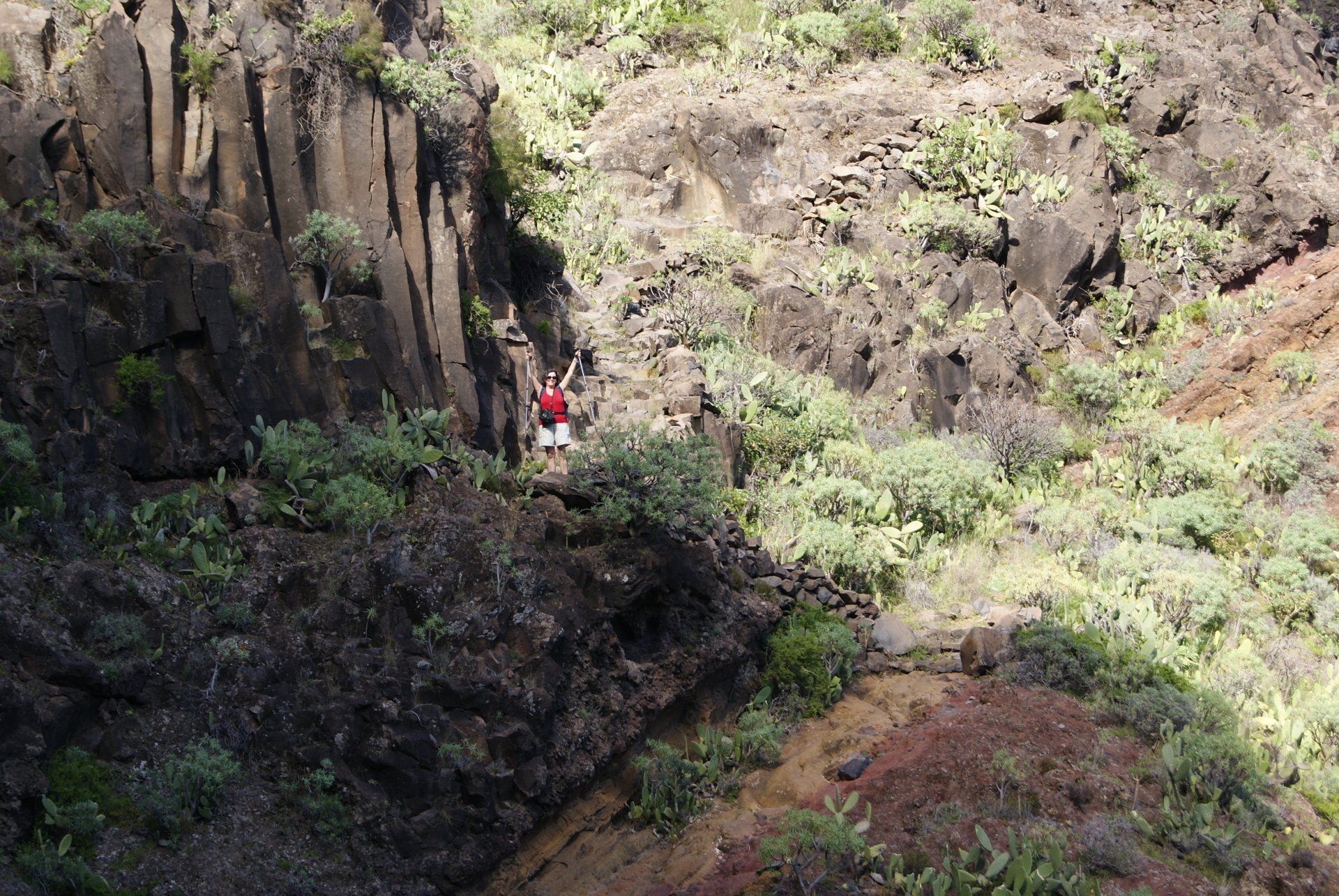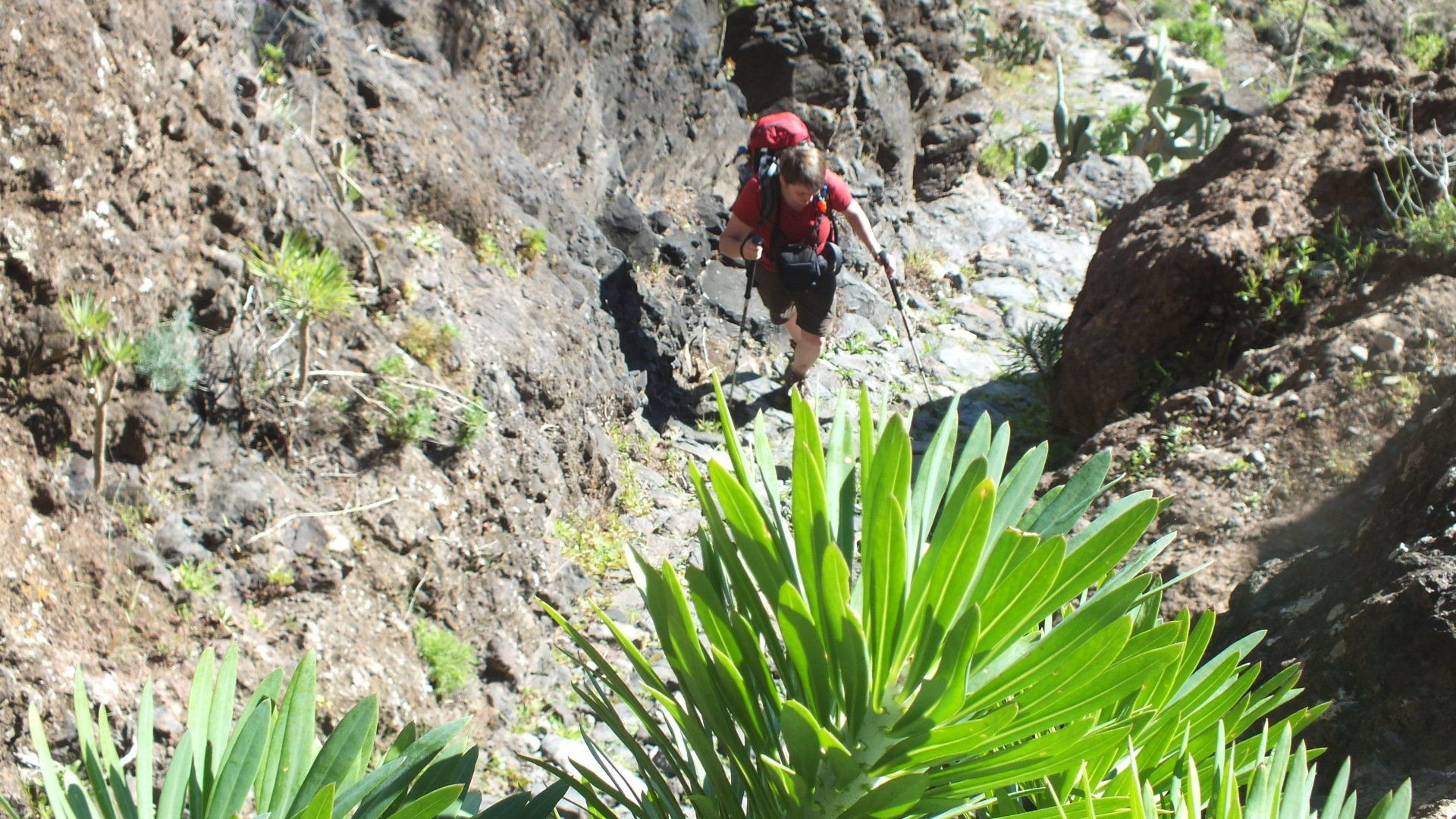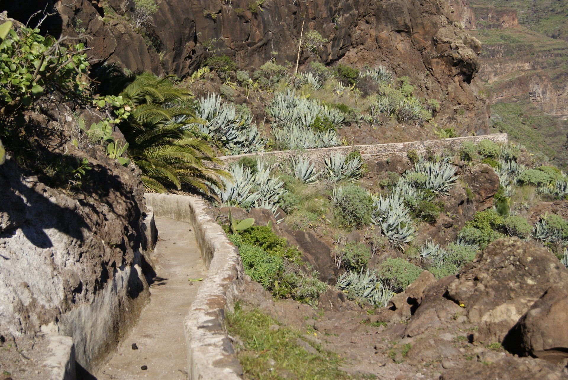 Bald nach dem Start legen wir schon die ersten Kleidungsstücke ab, schwitzen aber trotzdem ganz ordentlich! Nach fast einer Stunde stets steil bergauf treffen wir auf einen Wegweiser und wissen nun, woher der Zeitunterschied rührt. Jetzt sind wir auf der Tour angekommen, die in meinem Buch beschrieben ist. Die Wanderung ist anstrengend aber wunderschön. Über Treppen und Pfade geht es immerzu hinauf. Wir kreuzen alte Wasserkanäle, die zwar heute nicht mehr genutzt werden aber es gibt Leute, die darin entlangwandern. Wir nehmen davon Abstand, denn die Kanäle sind oftmals durch herabgefallene Felsbrocken verschüttet. Überall wachsen Agaven und Sukkulenten.