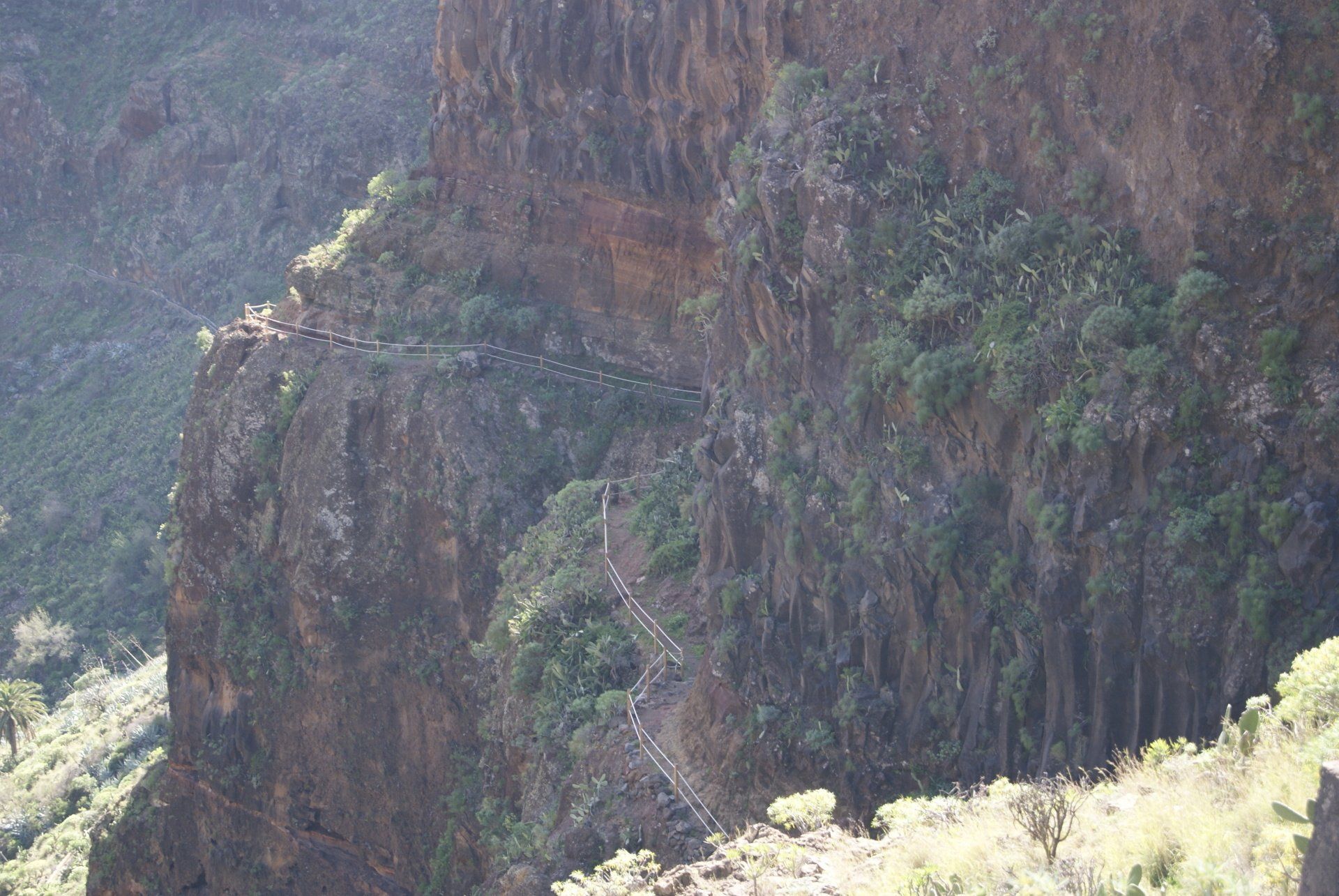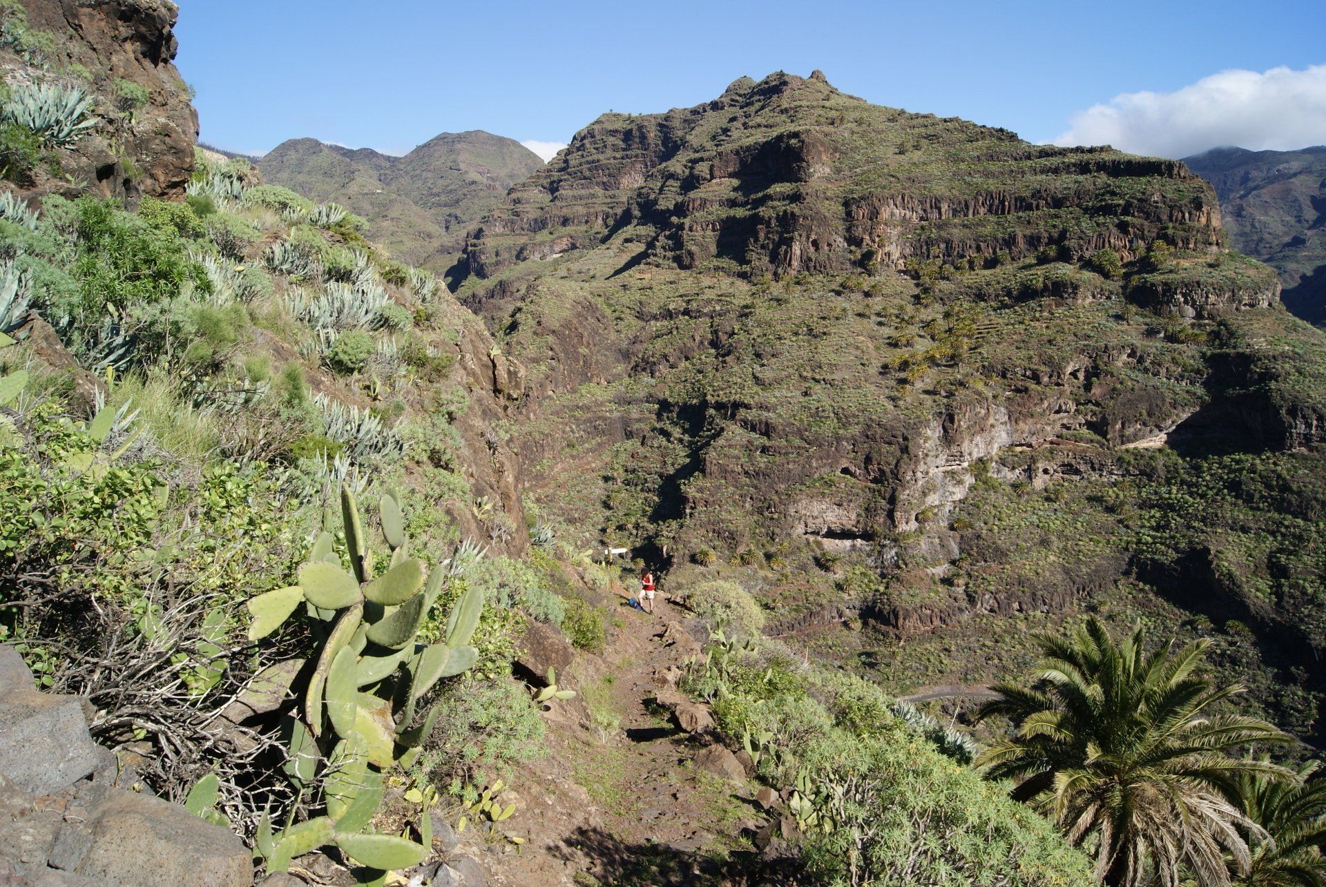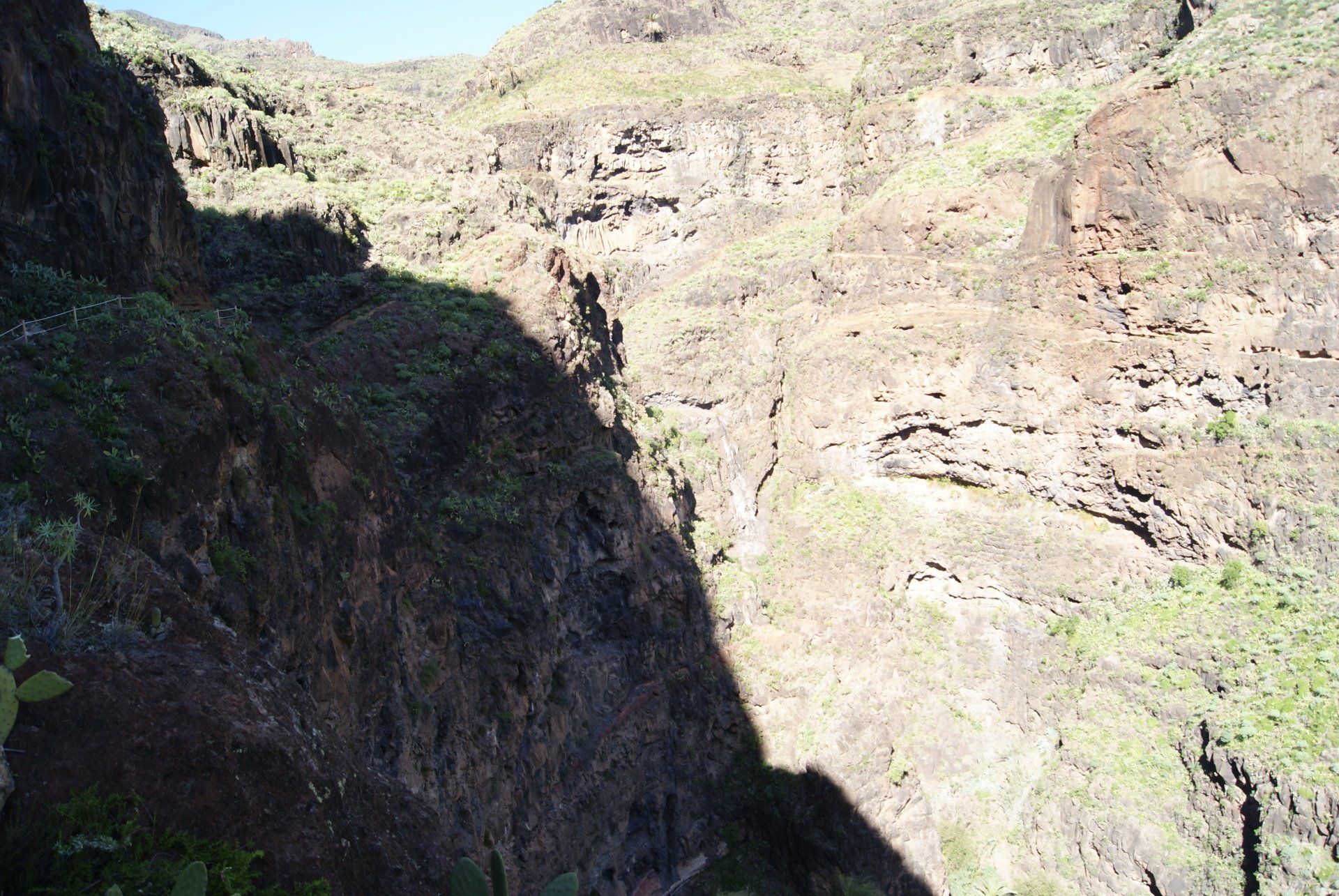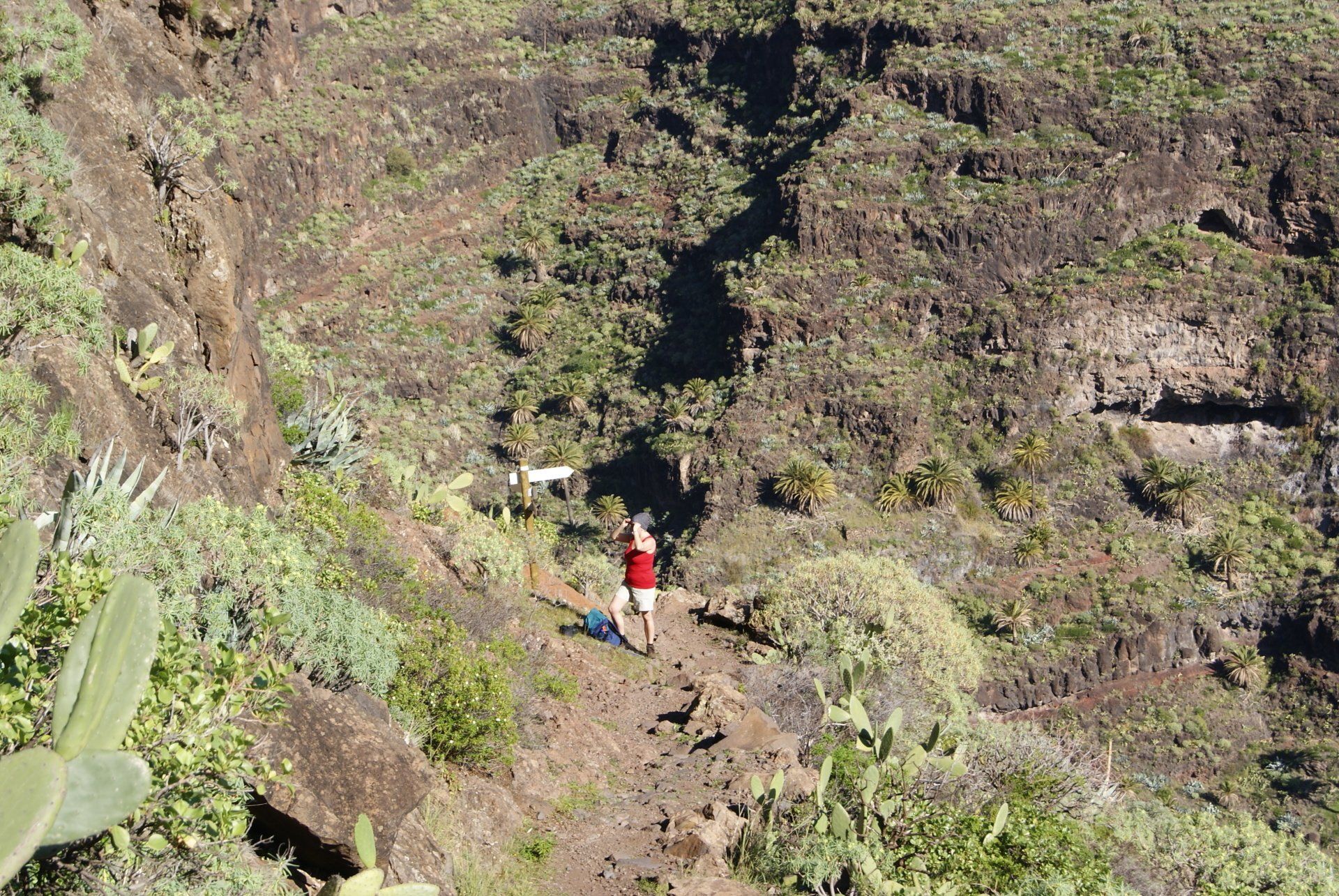 Bald nach dem Start legen wir schon die ersten Kleidungsstücke ab, schwitzen aber trotzdem ganz ordentlich! Nach fast einer Stunde stets steil bergauf treffen wir auf einen Wegweiser und wissen nun, woher der Zeitunterschied rührt. Jetzt sind wir auf der Tour angekommen, die in meinem Buch beschrieben ist. Die Wanderung ist anstrengend aber wunderschön. Über Treppen und Pfade geht es immerzu hinauf. Wir kreuzen alte Wasserkanäle, die zwar heute nicht mehr genutzt werden aber es gibt Leute, die darin entlangwandern. Wir nehmen davon Abstand, denn die Kanäle sind oftmals durch herabgefallene Felsbrocken verschüttet. Überall wachsen Agaven und Sukkulenten.
