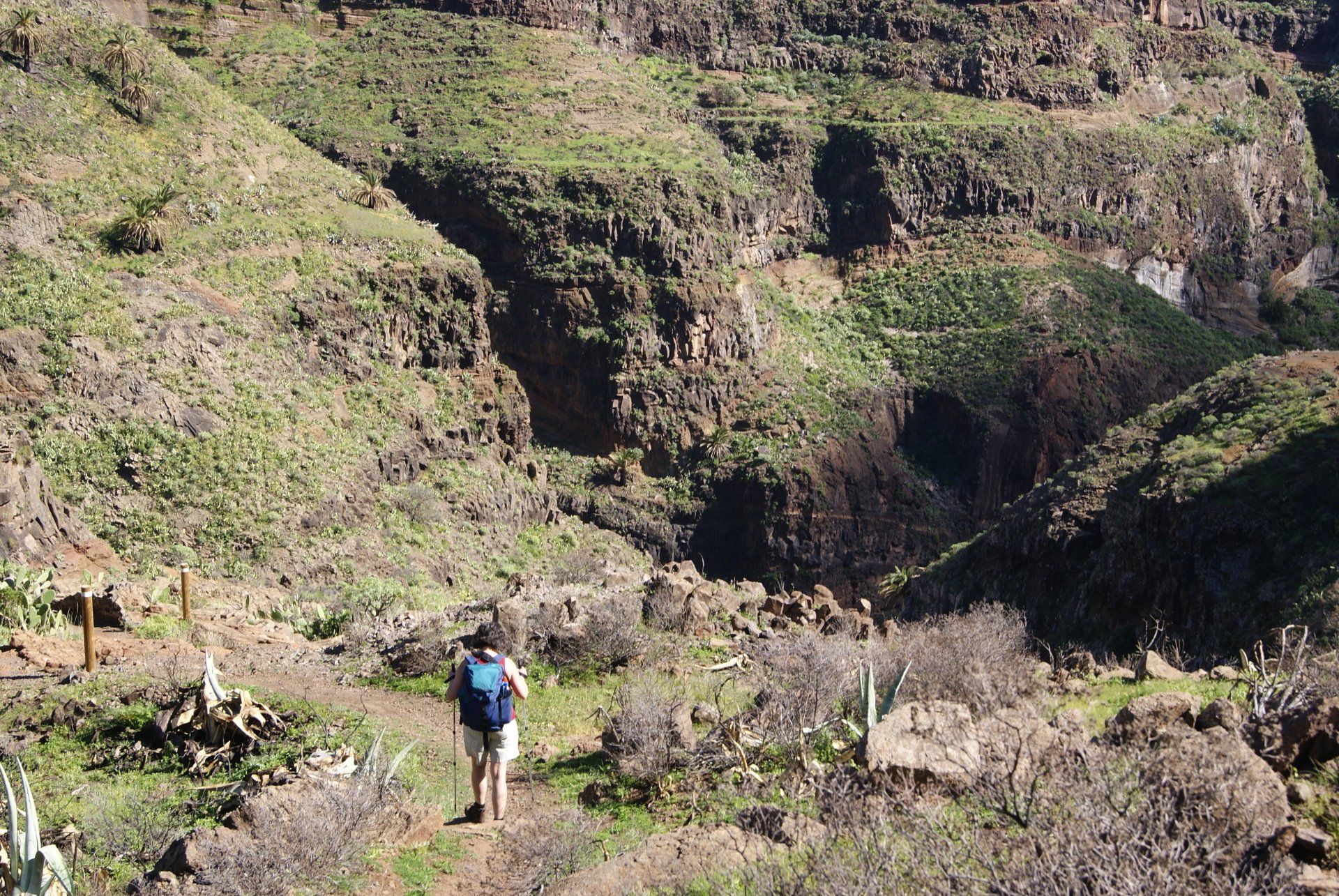 In Claudias Genuss-Wanderer beginnt die Tour im Tal bei El Rumbazo und führt zuerst nach Alajeró und die Straße entlang nach Imada, um dann erst in den Barranco de Guarimiar abzusteigen. Also im Prinzip die gleiche Tour, nur dass sie erst den Aufstieg und dann den Abstieg hat. Dies erscheint uns sinnvoller. Warum sie dann aber fünf Stunden dauern soll, ist uns unklar. Es bleibt doch die gleiche Strecke! Was wir dabei übersehen, ist die Zeit für den Zustieg von El Rumbazo aus zur Rundtour!