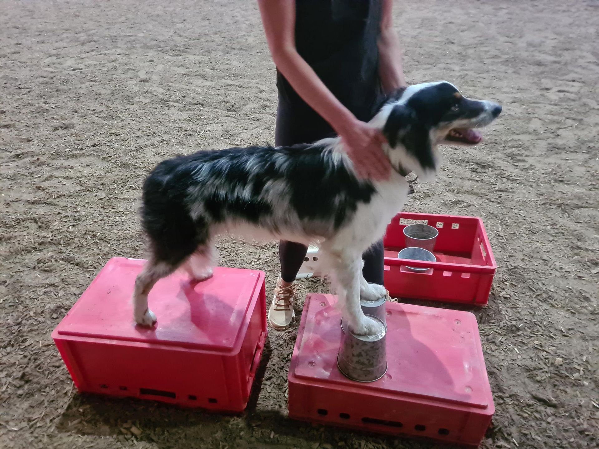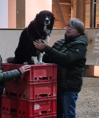Wir wurden dann per Handzeichen gebeten, auf oder in die Kisten zu steigen. Man stellte uns mit allen vier Füßen in oder auf vier Joghurtbecher und ließ uns dann eine Weile darin oder darauf stehen. Ich hatte schnell verstanden, was ich machen sollte und wollte wieder gleich loslegen. Aber nein! Mir wurde Fuß für Fuß auf diese Becher gestellt. Manchmal setzten wir uns auf den Boden und unsere Frauchen berührten uns am ganzen Körper. Das fand ich toll! Ich wurde ganz ruhig dabei. Regina saß allerdings nicht auf dem Boden, sondern auf einer Kiste. Sie ist ja schon etwas älter und kommt nicht mehr so leicht vom Boden hoch.