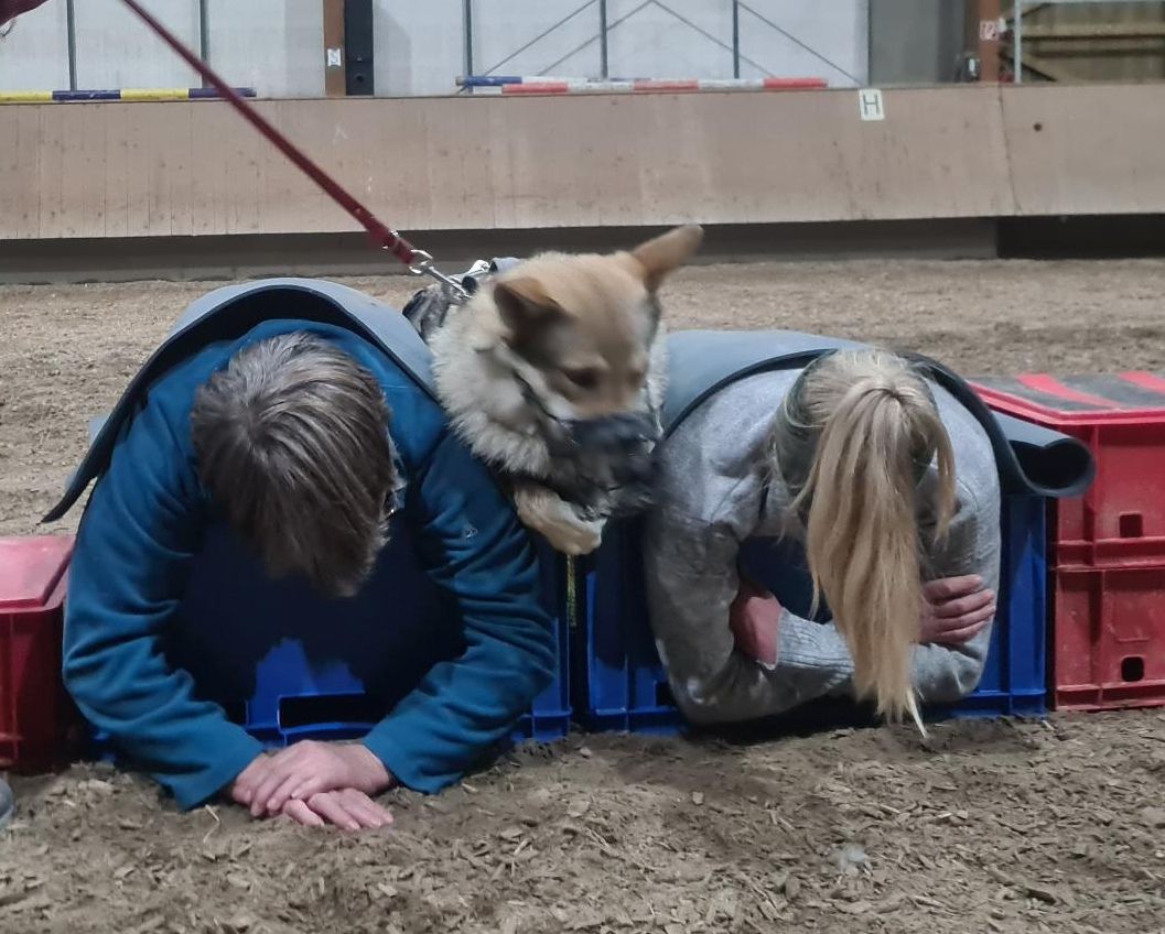Oft wurden auch Partnerübungen gemacht. Da mussten immer zwei Frauchen mit einem Hund arbeiten. Die anderen Hunde hatten derweil Pause. Das lief dann meist so ab, dass Luke und ich irgendwo in der Reihalle geparkt wurden und die beiden Maulkorbträger waren zuerst dran. Wenn sie fertig waren, brachten ihre Frauchen sie ins Auto und Luke und ich waren an der Reihe. Luke und ich sind eben schon ein bisschen weiter in der Ausbildung und haben gelernt, da liegenzubleiben, wo man uns ablegt. Egal, wie lange es auch dauert!