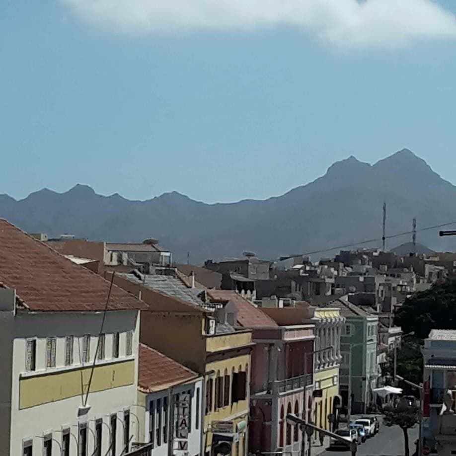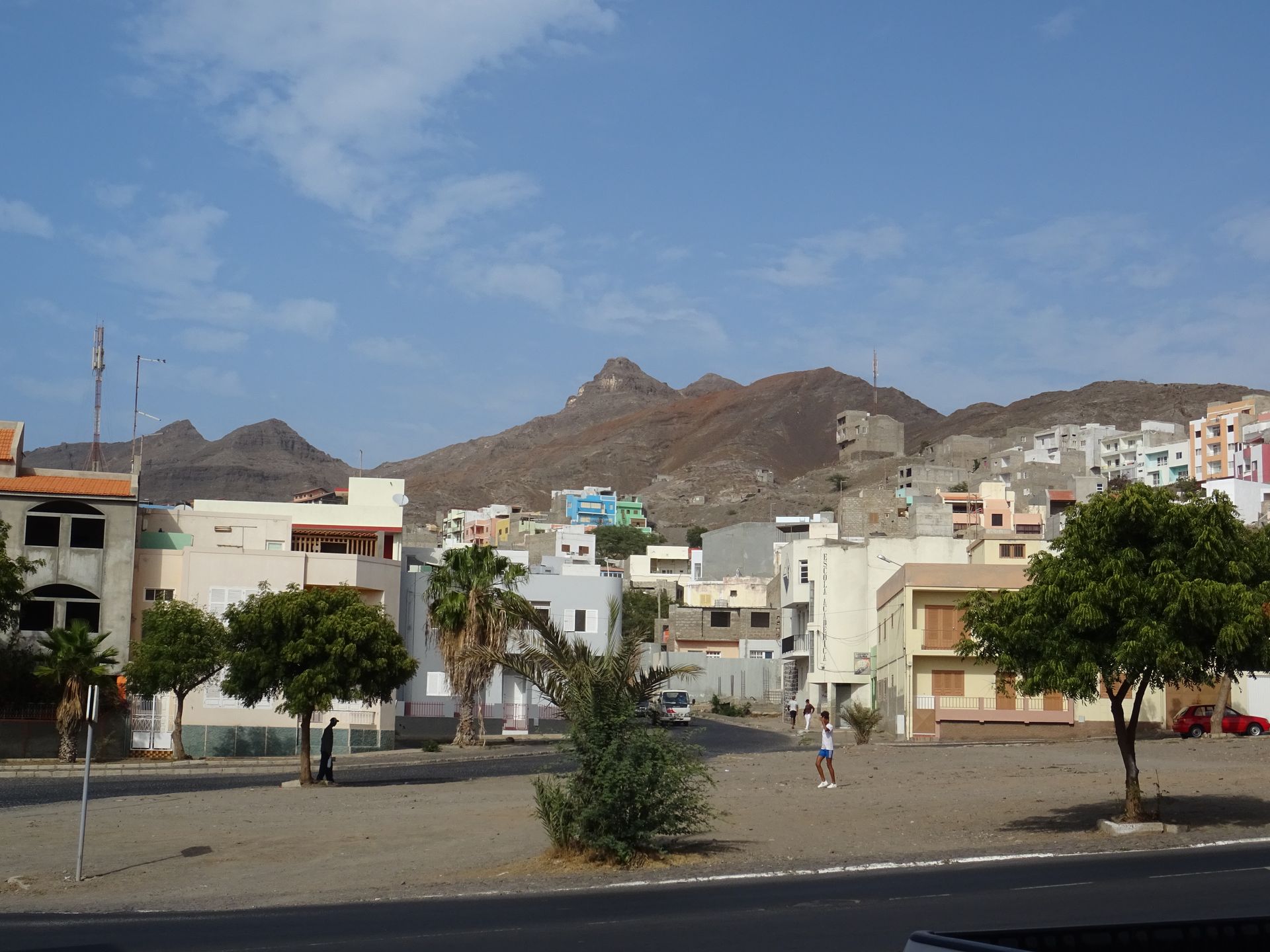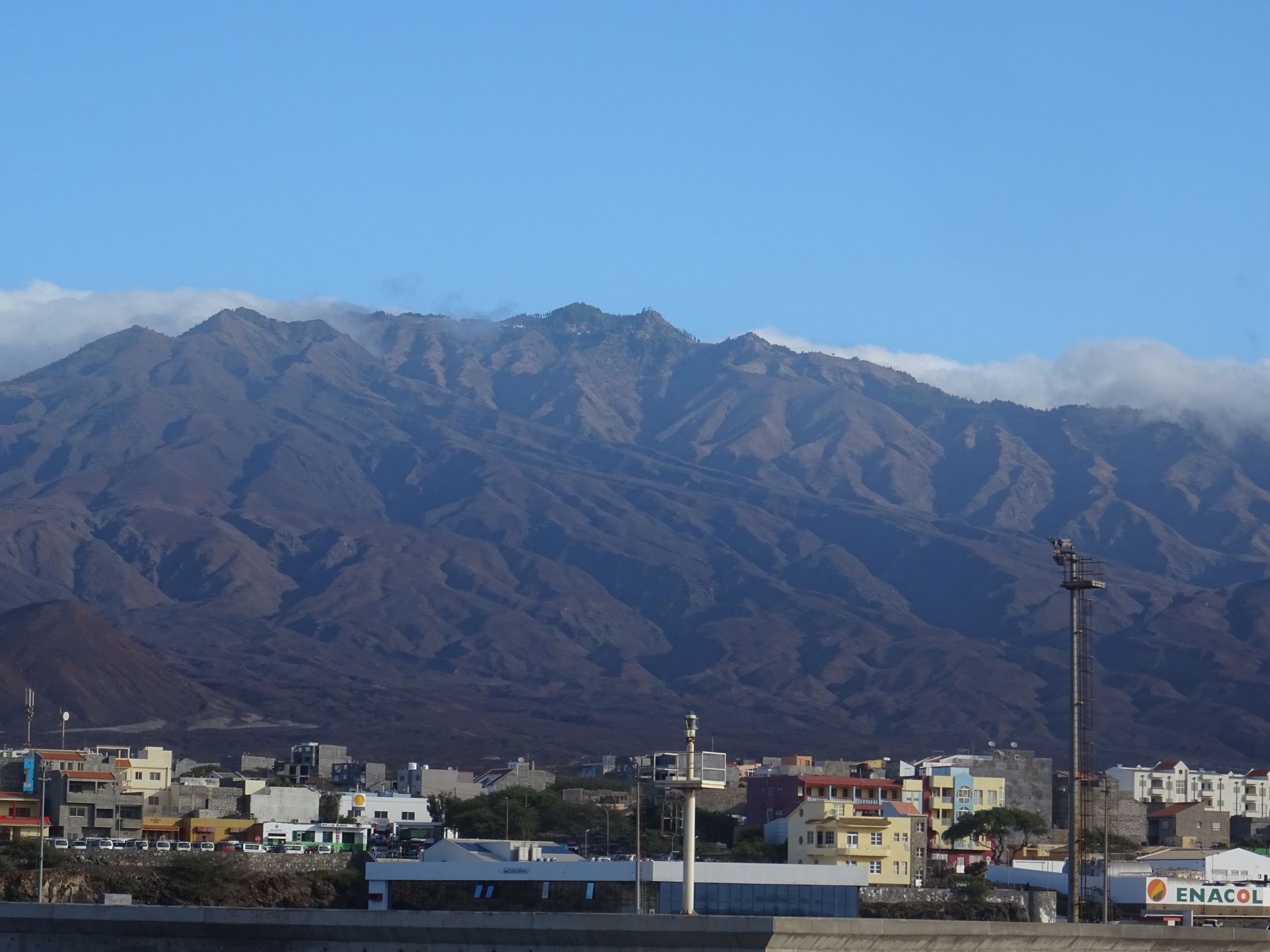 Mit einer Stunde Verspätung kommen wir auf São Vicente an – aber egal – wenigstens sind wir da. Beim Anflug drehen wir eine Schleife über einer der Inseln und der Anblick raubt mir beinahe den Atem. Es sieht aus, wie ein Faltenrock von gigantischen Ausmaßen. Berg und Tal reiht sich an Berg und Tal. Wie ein Faltplan, den man nicht ganz auseinandergefaltet hat.