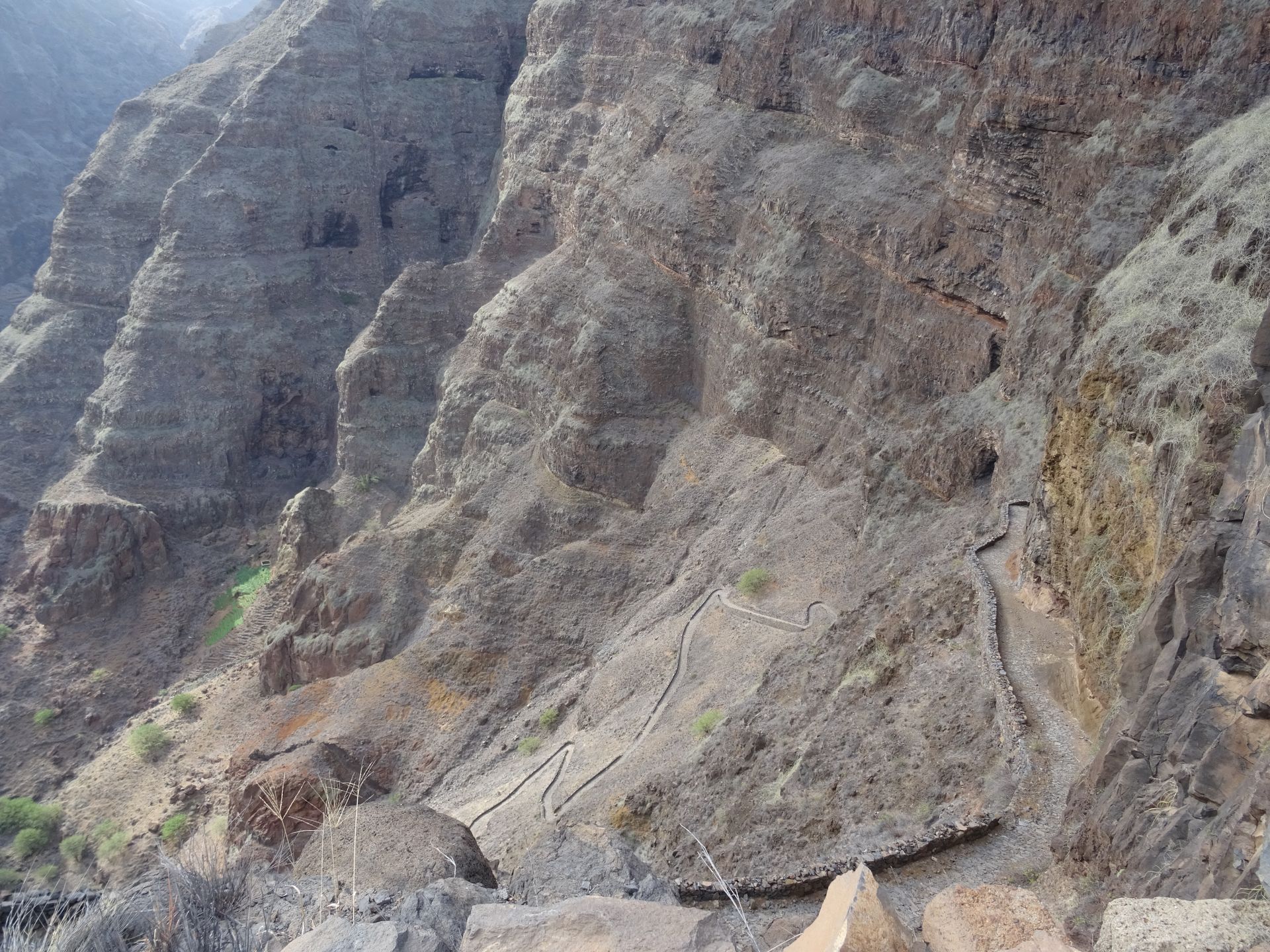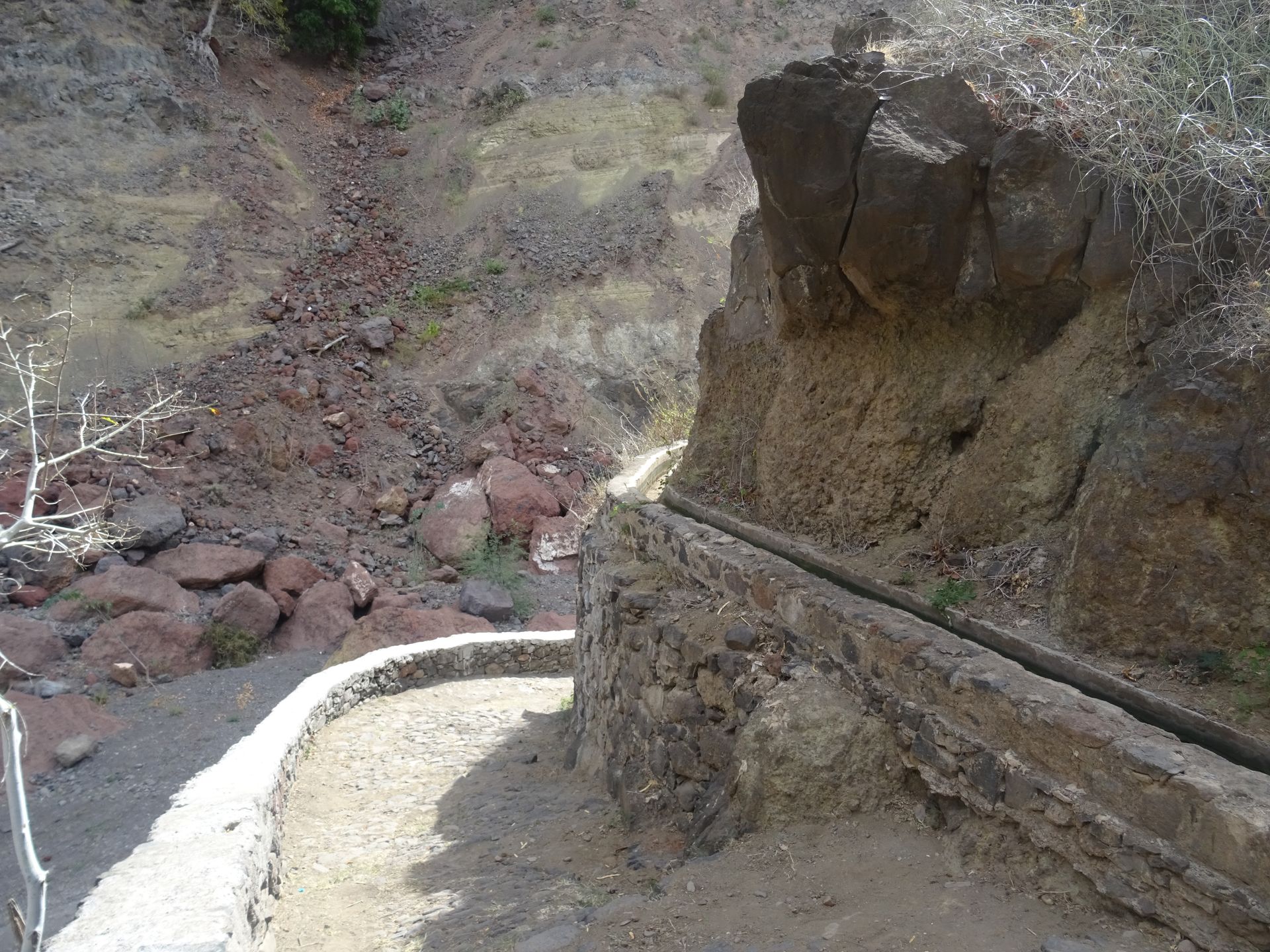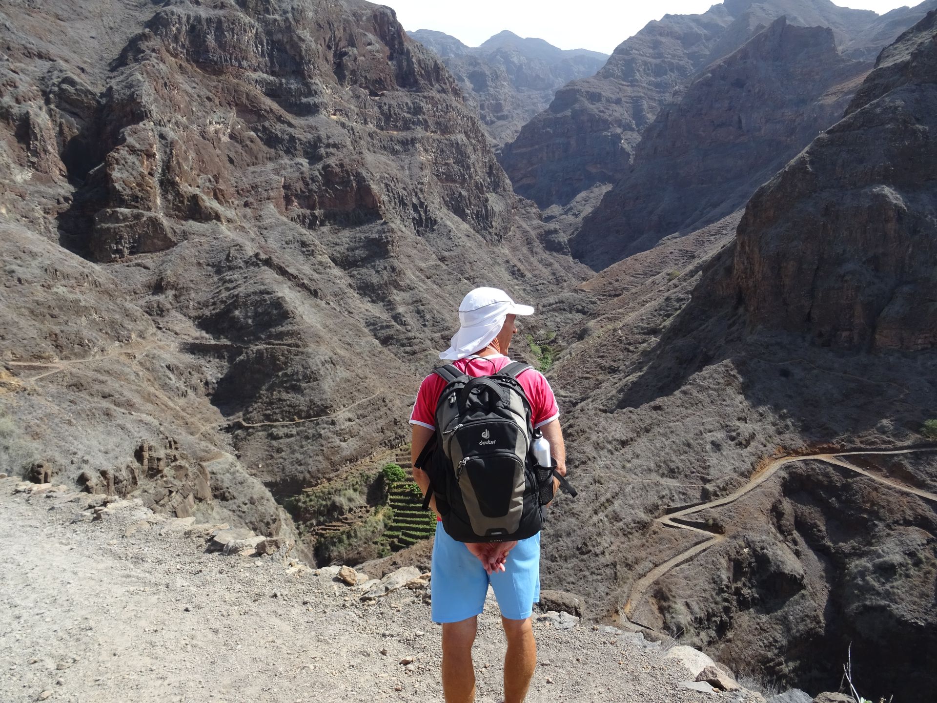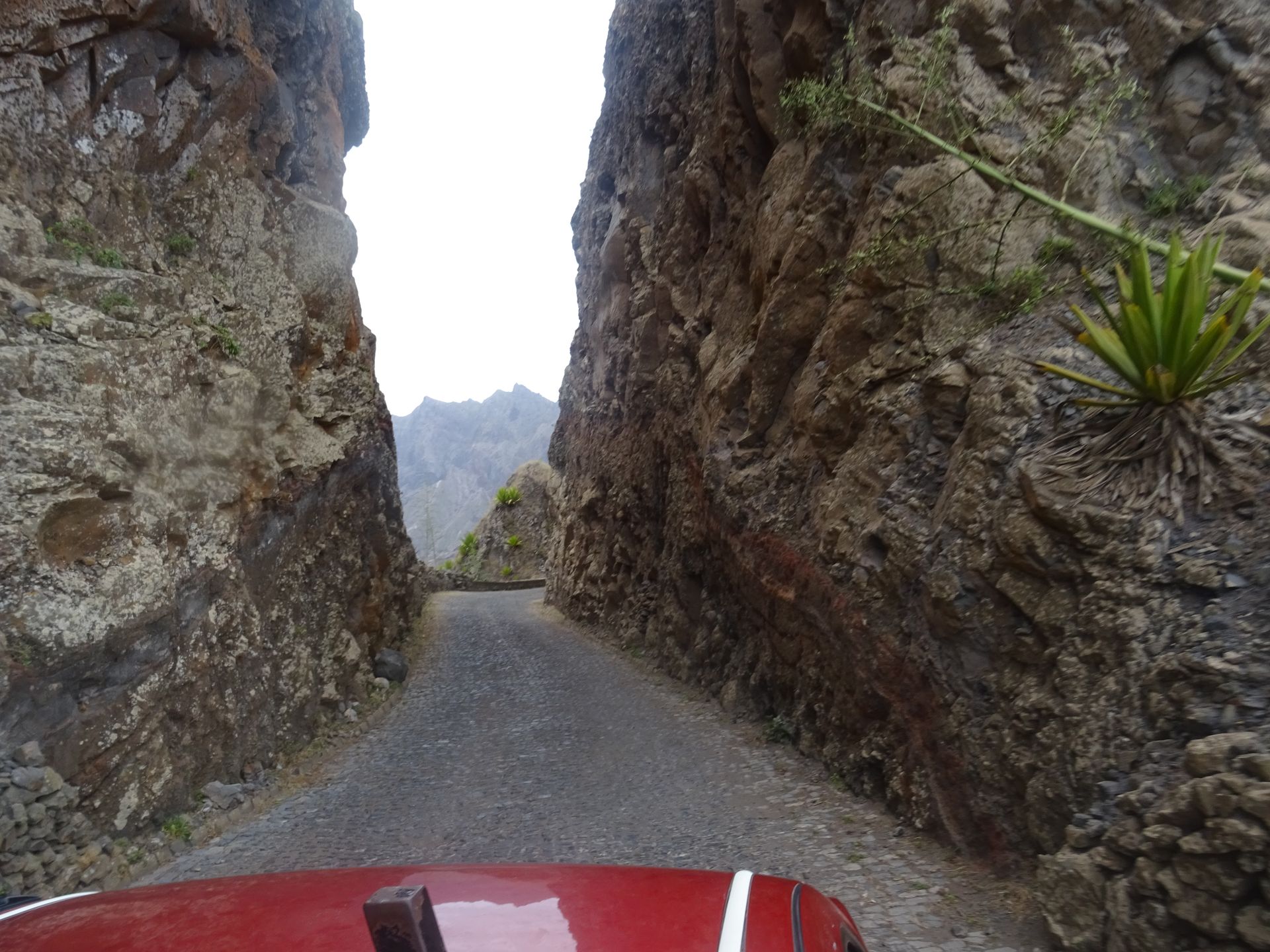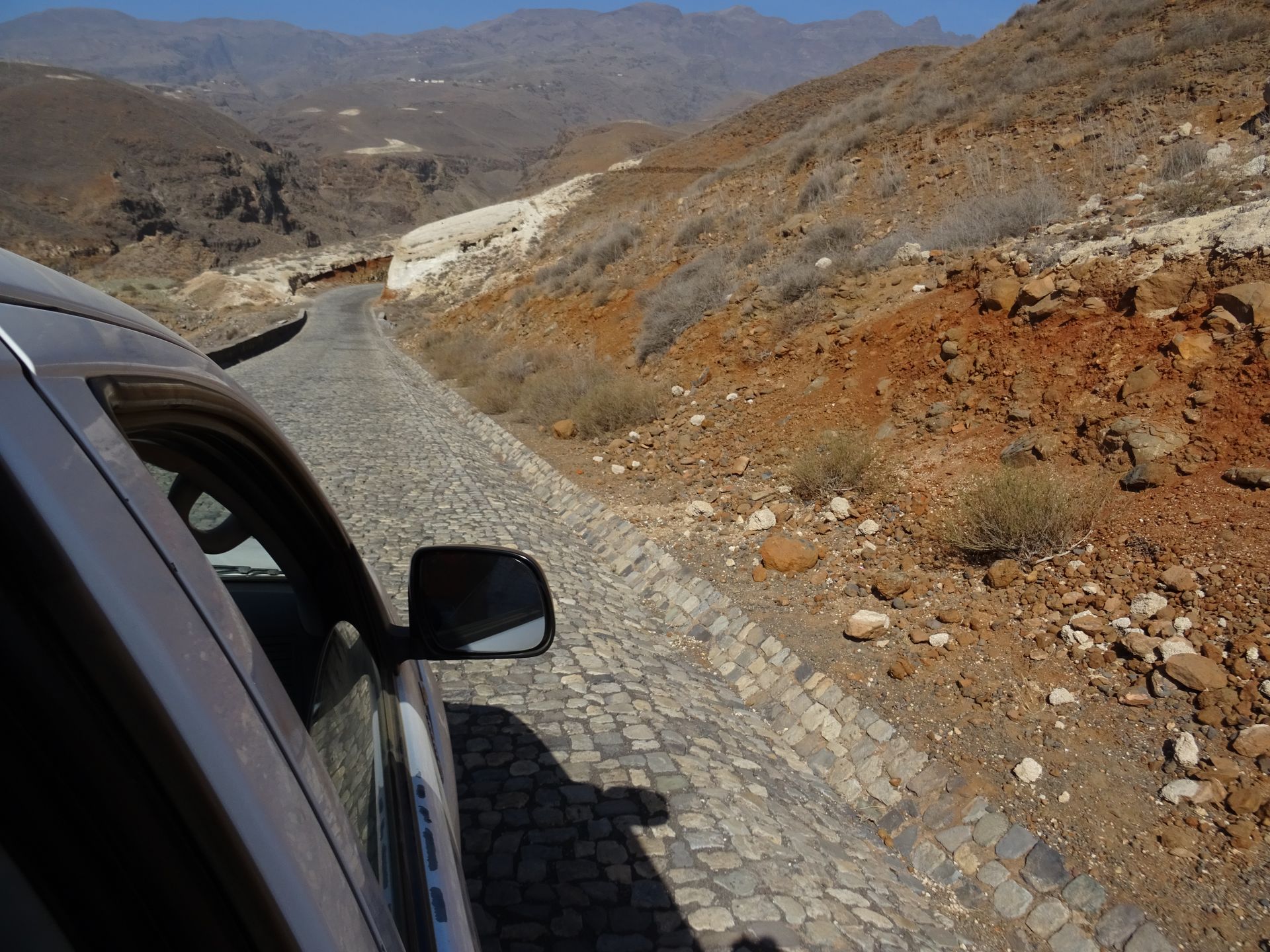 Als wir dann im Taxi wieder aufbrechen, steigen wir hinten auf die Ladefläche, auf der rechts und links Sitzbänke angebracht sind. Dazwischen liegt unser Gepäck. Die Fahrt geht über die alte Passstraße nach Delgadim. Dort ist man direkt auf dem Pass zwischen dem Torre Tal und dem Ribera Grande Tal. Die Straße ist nur wenige Meter breit, auf beiden Seiten gähnt der Abgrund. Der Blick von dort oben in die karge, gefältelte Bergwelt ringsum und die Täler und Abgründe dazwischen weckt Ehrfurcht in mir. Ehrfurcht vor der Natur und den Naturgewalten, die diese grandiose Landschaft geschaffen haben.