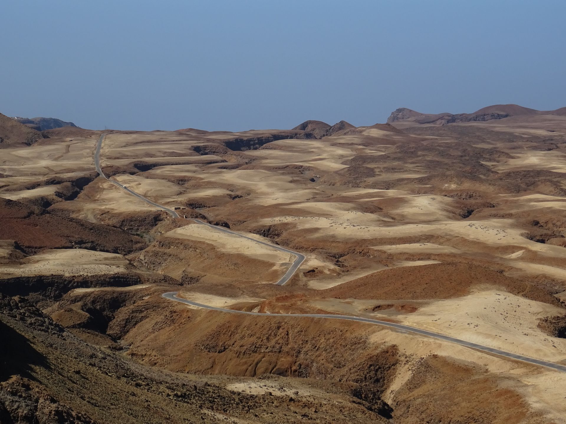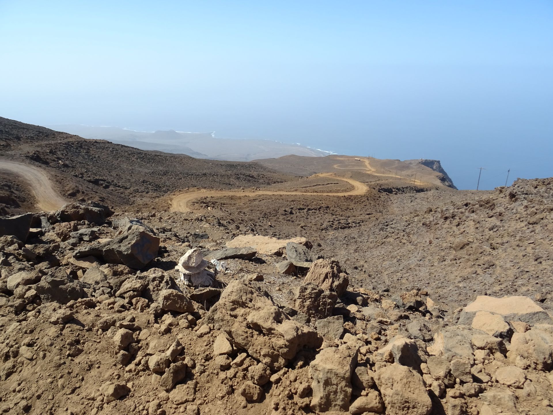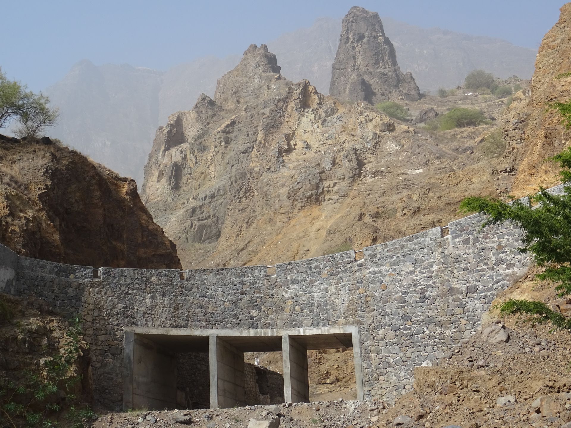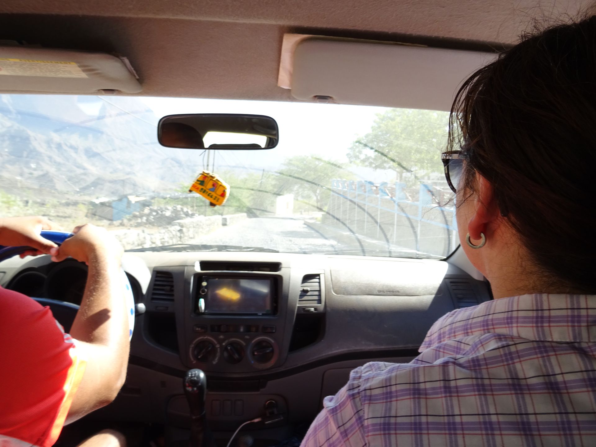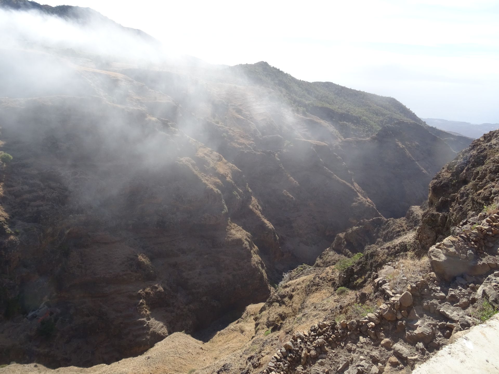 Als wir dann im Taxi wieder aufbrechen, steigen wir hinten auf die Ladefläche, auf der rechts und links Sitzbänke angebracht sind. Dazwischen liegt unser Gepäck. Die Fahrt geht über die alte Passstraße nach Delgadim. Dort ist man direkt auf dem Pass zwischen dem Torre Tal und dem Ribera Grande Tal. Die Straße ist nur wenige Meter breit, auf beiden Seiten gähnt der Abgrund. Der Blick von dort oben in die karge, gefältelte Bergwelt ringsum und die Täler und Abgründe dazwischen weckt Ehrfurcht in mir. Ehrfurcht vor der Natur und den Naturgewalten, die diese grandiose Landschaft geschaffen haben.
