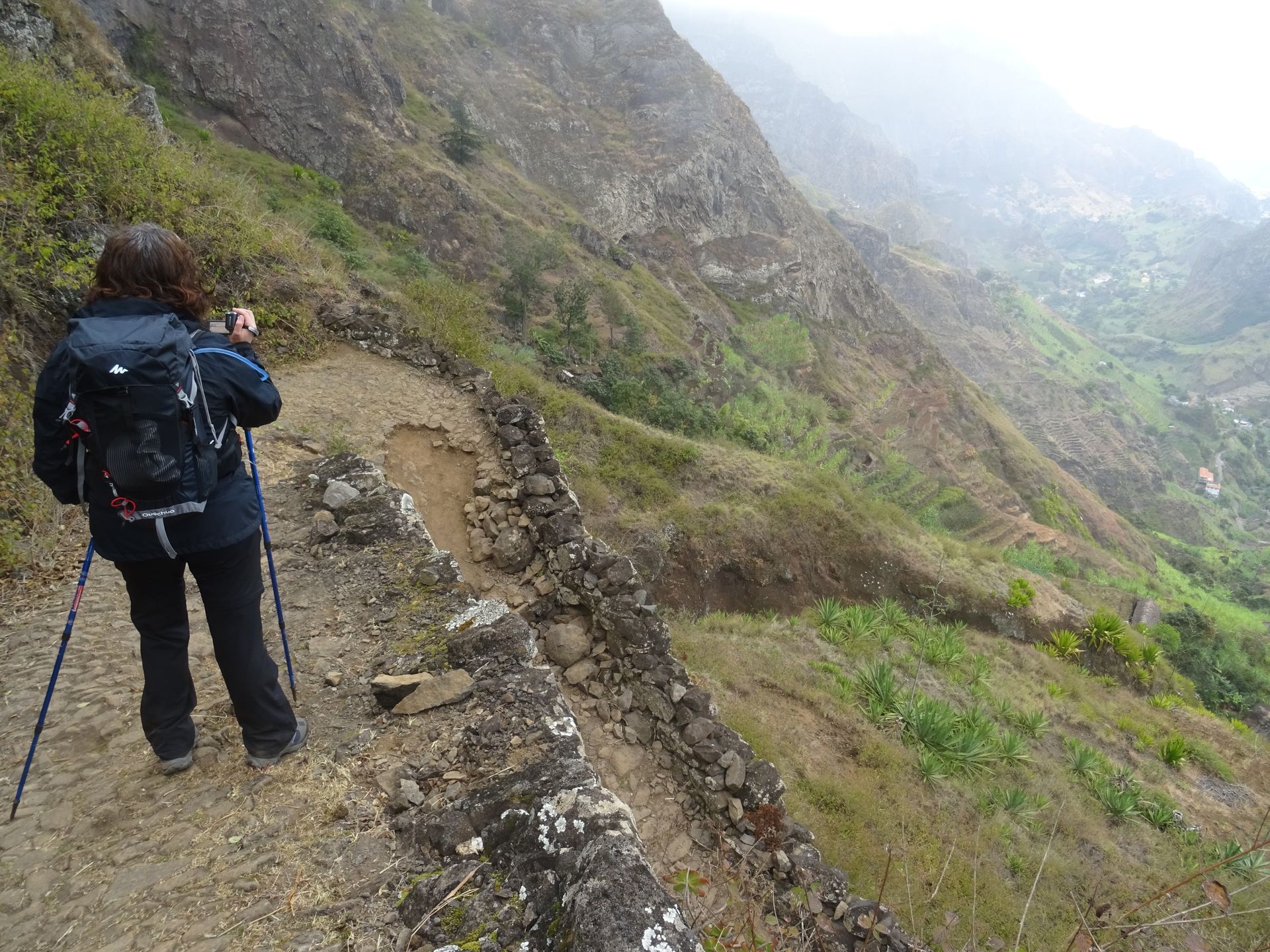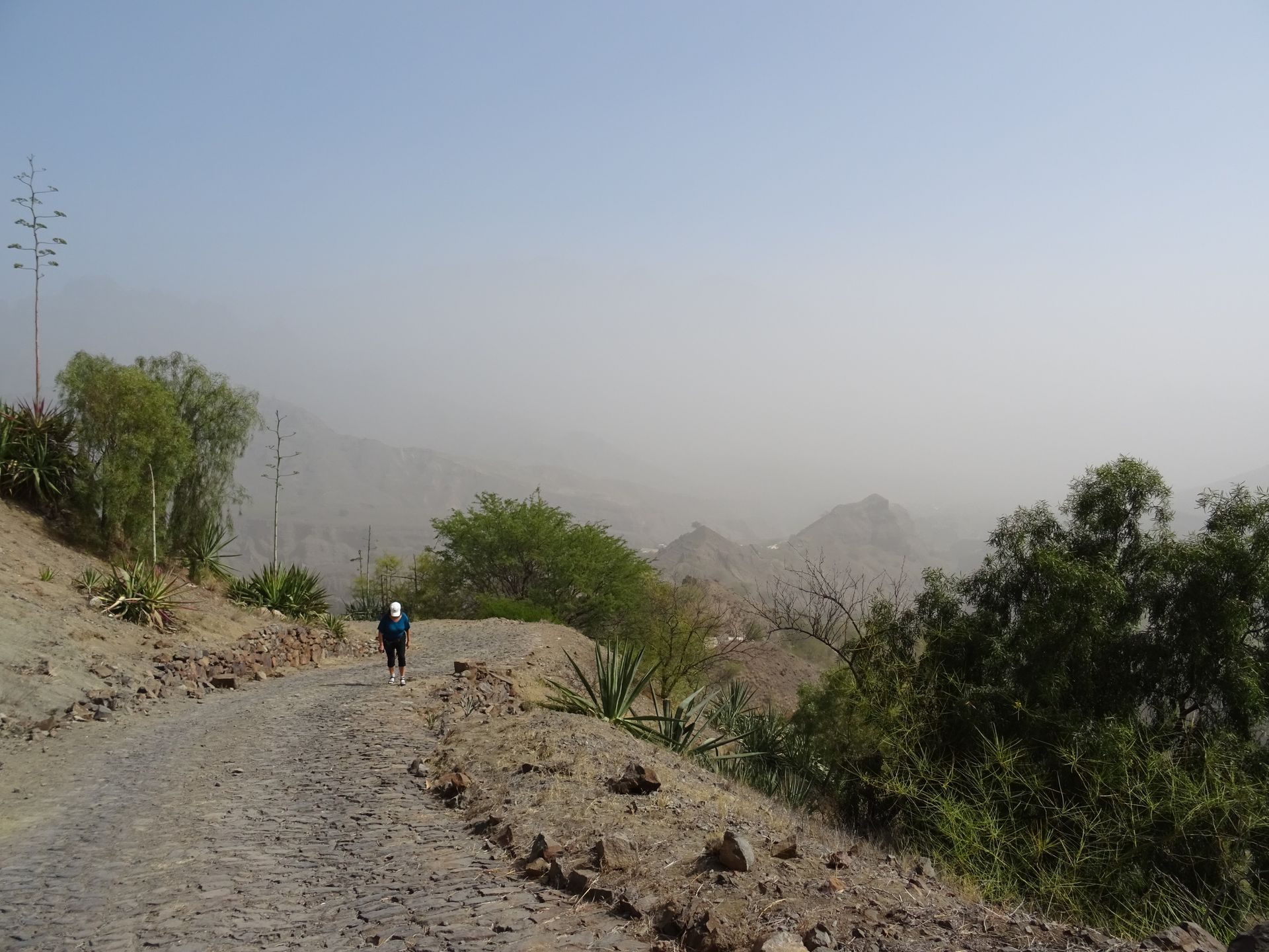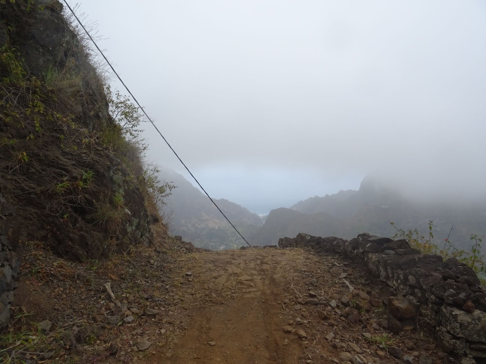 Wir wandern am Kraterrand entlang. Der Krater erscheint uns nicht recht tief und nach einer halben Stunde erreichen wir bereits dessen Grund. Hier wird überall Gemüse angebaut, auch Mais und Maniok. Es fahren Tanklaster zwischen den Feldern hindurch, die Wasser bringen. Wir durchqueren das Tal und steigen auf der anderen Seite wieder zum Kraterrand hinauf. Beim Aufstieg kommt uns eine Eselskarawane entgegen. Die Esel sind allesamt mit vollen Wasserfässern beladen. Eine französische Wandergruppe mit Guide überholt uns, zieht den kleinen Anstieg hinauf und verschwindet im Nebel. Als auch wir den Anstieg bewältigt haben und erneut am Kraterrand angekommen sind, windet sich vor uns der Weg nun in steilen Serpentinen über Treppenstufen talwärts. Wie weit es hier hinunter geht, können wir von oben nur erahnen, da das gesamte Tal in Nebel und Dunst liegt. Von der, in allen Büchern beschriebenen, grandiosen Aussicht über das Paúl Tal bekommen wir nichts mit. Um 12 Uhr lassen wir uns zur Mittagspause nieder und verspeisen die Gurke und die Paprika, die Claudia gestern in Mindelo gekauft hat. Der Weg wurde während der letzten paar hundert Meter wieder flacher und wir denken, dass wir das schlimmste hinter uns haben.