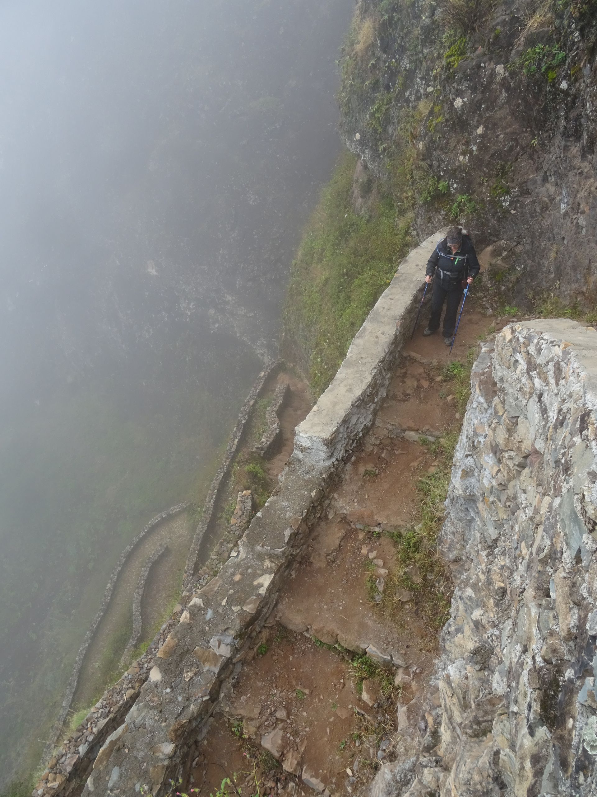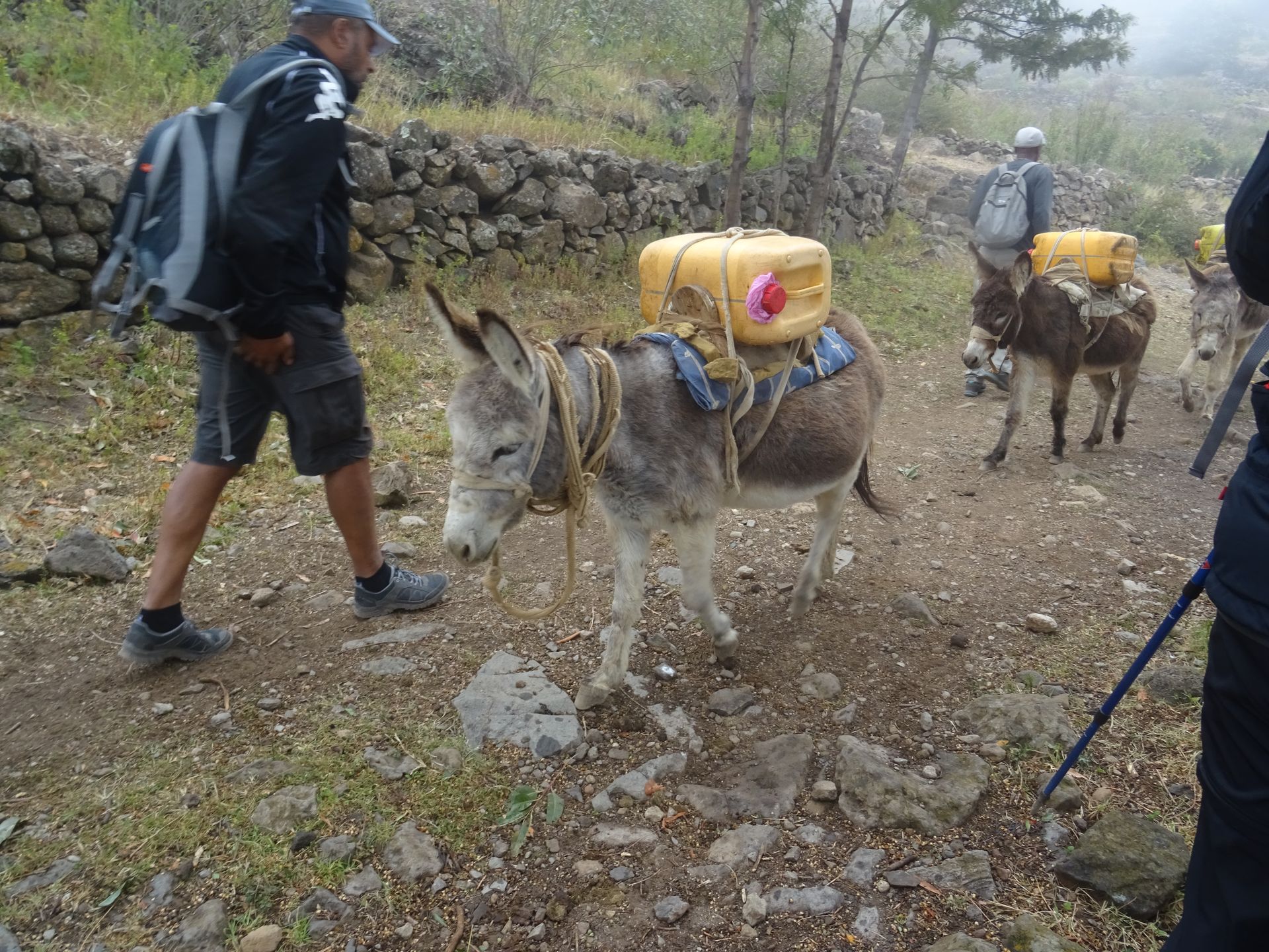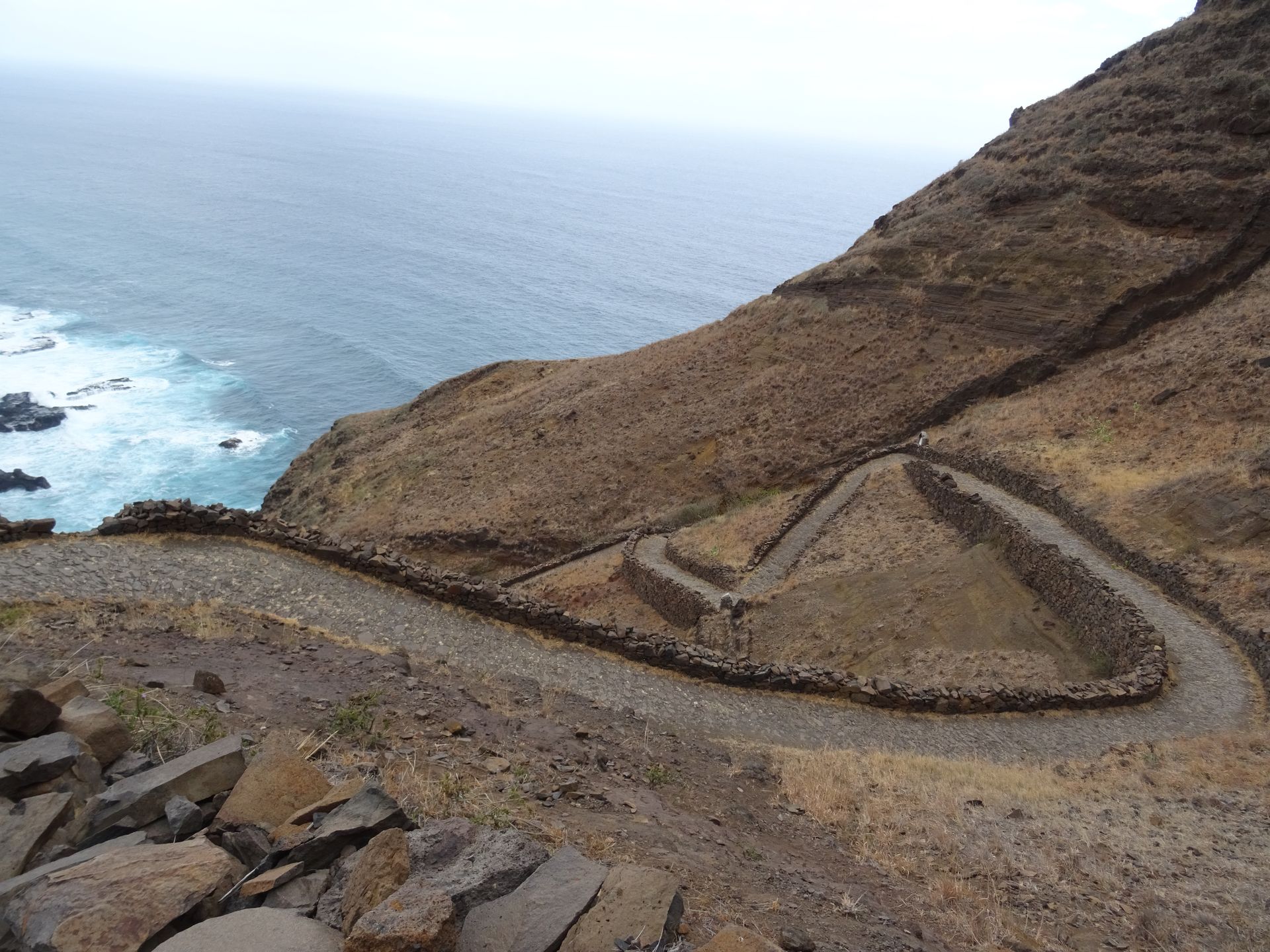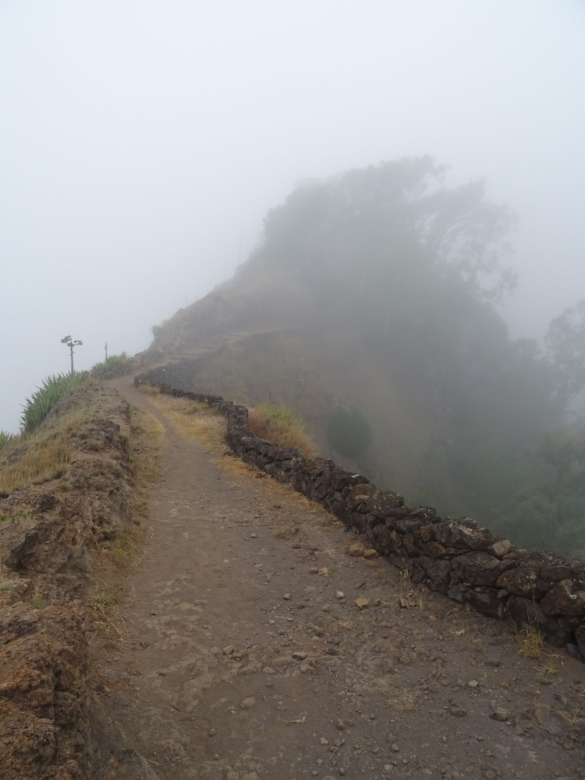Wir wandern am Kraterrand entlang. Der Krater erscheint uns nicht recht tief und nach einer halben Stunde erreichen wir bereits dessen Grund. Hier wird überall Gemüse angebaut, auch Mais und Maniok. Es fahren Tanklaster zwischen den Feldern hindurch, die Wasser bringen. Wir durchqueren das Tal und steigen auf der anderen Seite wieder zum Kraterrand hinauf. Beim Aufstieg kommt uns eine Eselskarawane entgegen. Die Esel sind allesamt mit vollen Wasserfässern beladen. Eine französische Wandergruppe mit Guide überholt uns, zieht den kleinen Anstieg hinauf und verschwindet im Nebel. Als auch wir den Anstieg bewältigt haben und erneut am Kraterrand angekommen sind, windet sich vor uns der Weg nun in steilen Serpentinen über Treppenstufen talwärts. Wie weit es hier hinunter geht, können wir von oben nur erahnen, da das gesamte Tal in Nebel und Dunst liegt. Von der, in allen Büchern beschriebenen, grandiosen Aussicht über das Paúl Tal bekommen wir nichts mit. Um 12 Uhr lassen wir uns zur Mittagspause nieder und verspeisen die Gurke und die Paprika, die Claudia gestern in Mindelo gekauft hat. Der Weg wurde während der letzten paar hundert Meter wieder flacher und wir denken, dass wir das schlimmste hinter uns haben.