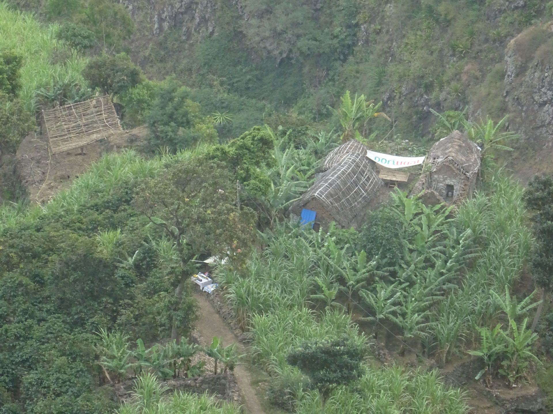 Nun, das, was von oben flacher wirkte, stellt sich als noch steiler heraus und langsam geht die Treppen-Kletterei ganz schön in die Knie und in die Oberschenkel. Das wird morgen ein Muskelkater! Weit unter uns sehen wir eine Hütte mit einem Schriftzug auf dem Dach und als wir 30 Minuten später dort ankommen, lassen wir uns bei der geschäftstüchtigen Bäuerin zu einer Tasse Kaffee und Kokostörtchen nieder. Außerdem stärken wir uns mit süßen, kleinen Bananen, die ihre Kinder uns verkaufen.