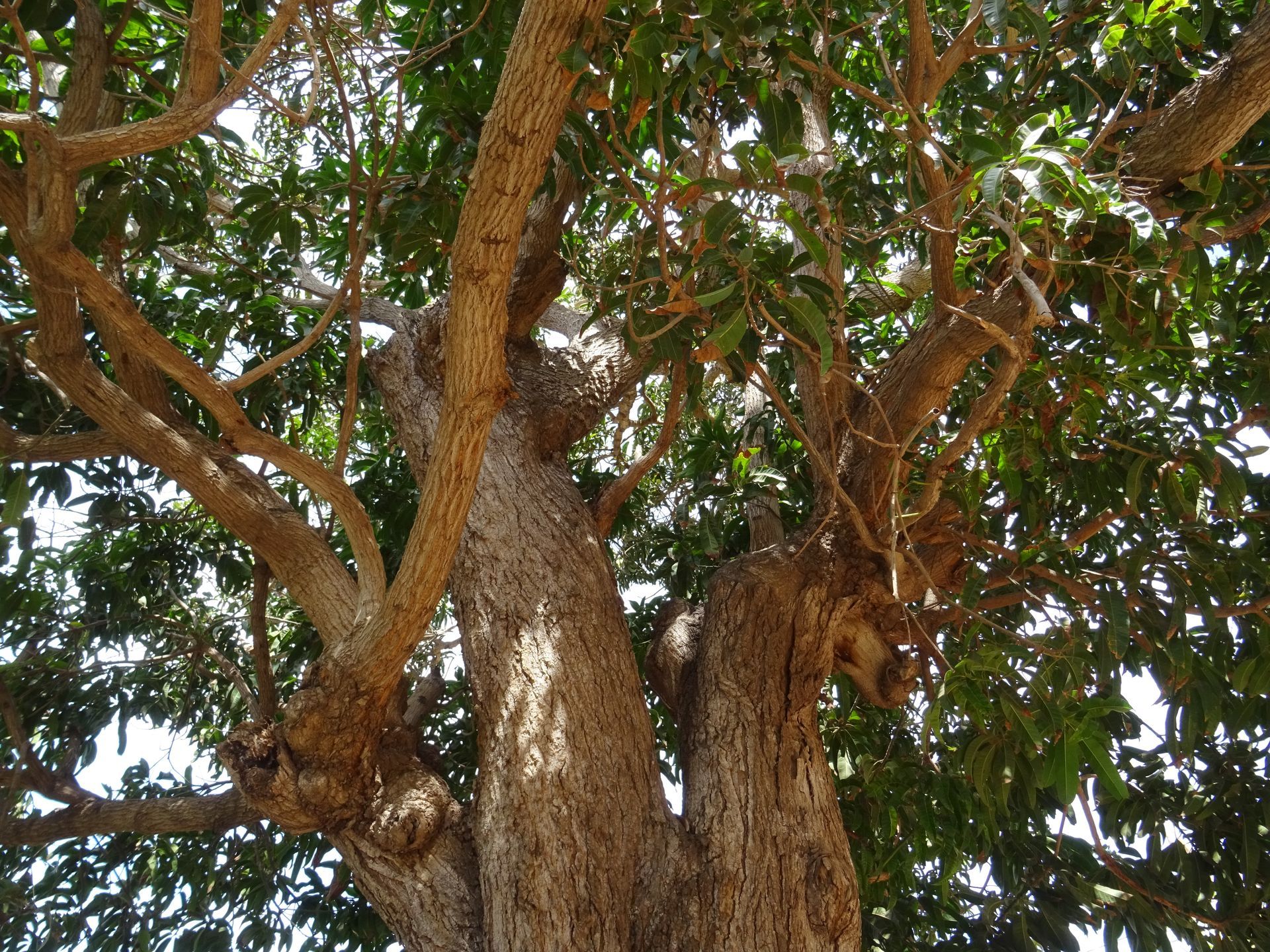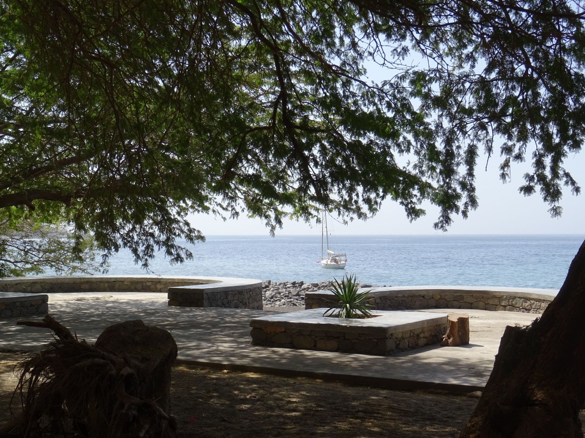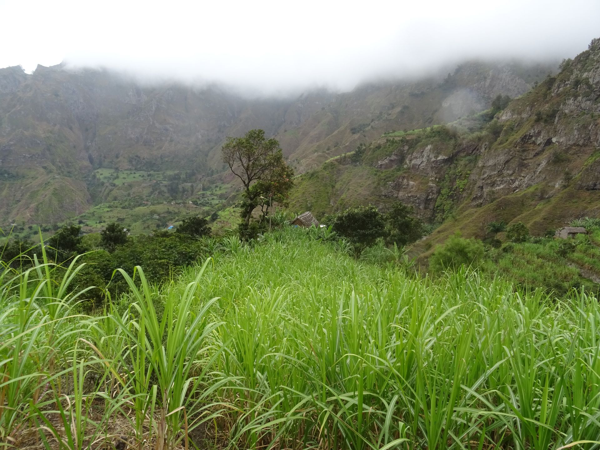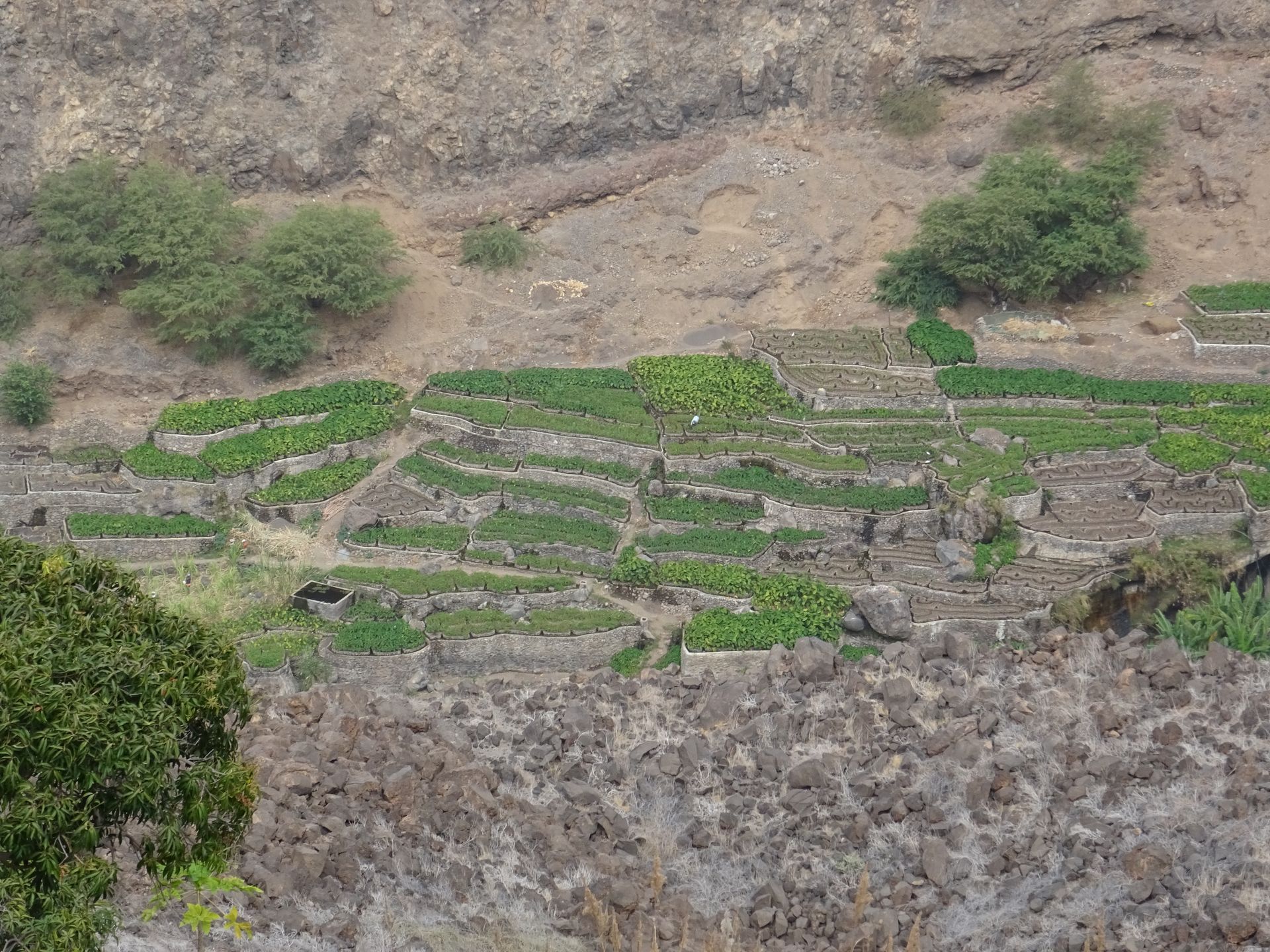 Unter uns im Tal ziehen sich die Felder in Terrassen am Bach entlang. Von oben sieht es aus wie Kresse in der Schachtel. Überall wird gearbeitet. Auch ganz oben gibt es eine Schule, und natürlich eine Zuckerrohrpresse. Bei Google Maps sehe ich, dass es hier irgendwo eine Bar, Restaurant oder Geschäft geben soll und ich navigiere uns dahin. Claudia ist etwas skeptisch, aber wir finden das Geschäft. Es liegt direkt neben einem wunderschönen Sitzplatz unter Bäumen. Der Platz hat rundum Sitzbänke und wirkt wie eine Dachterrasse, von der man einen sagenhaften Blick über den ganzen Berg hinunter bis zum Strand und weit über das Meer zur Nachbarinsel São Vicente hat.